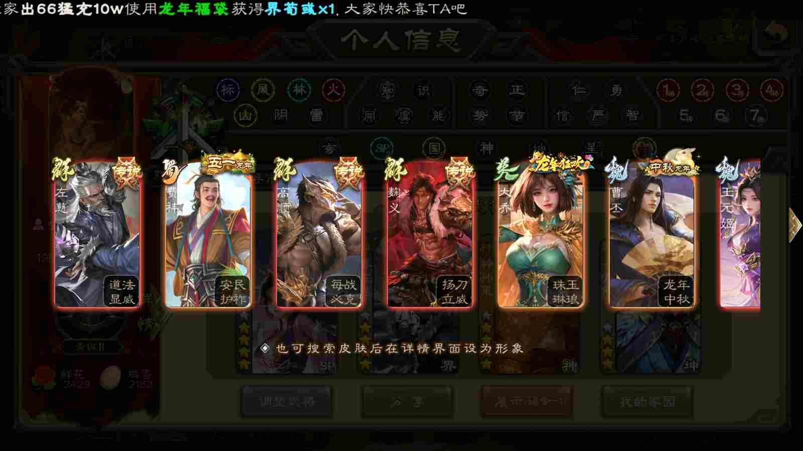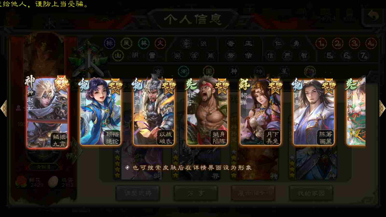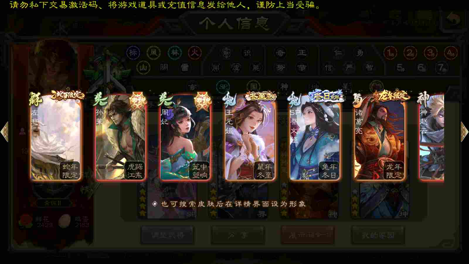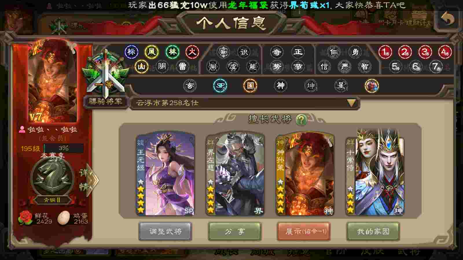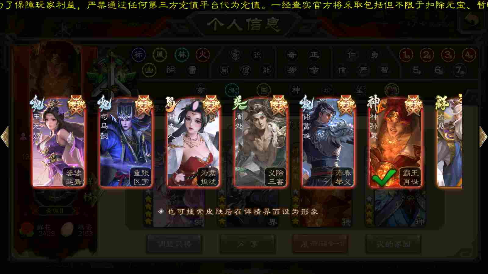 商品编号22391 全部皮肤340,动态皮肤19,全部武将300,排位武将89,国战武将83,史诗武将31,神赵云回廊,神孙策动皮,王元姬动皮,界左慈动皮,麴义动皮,金票6.6w