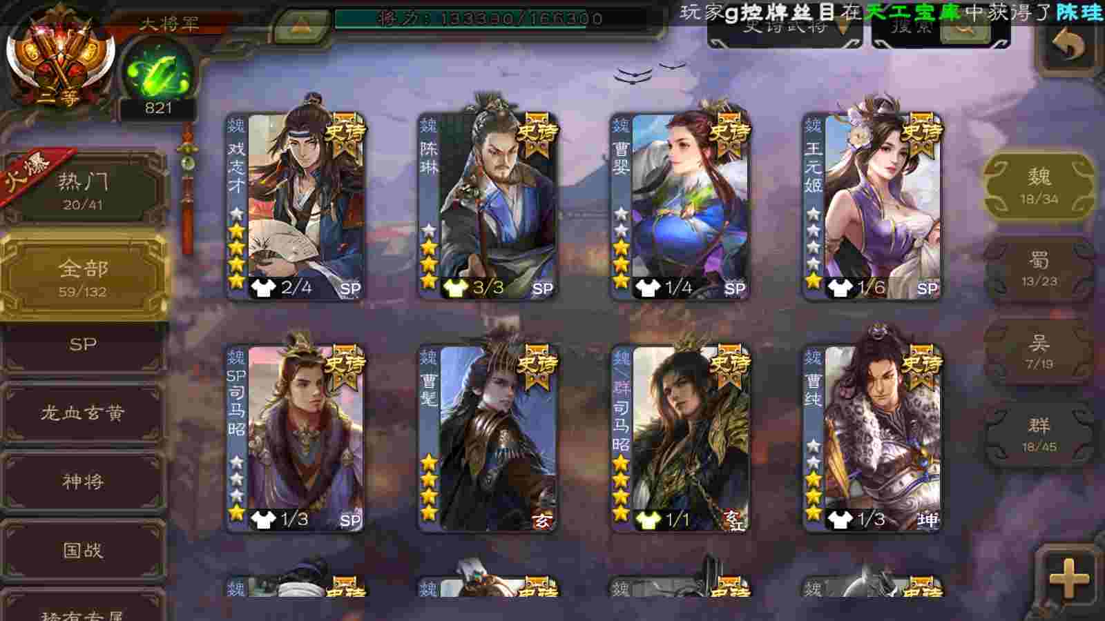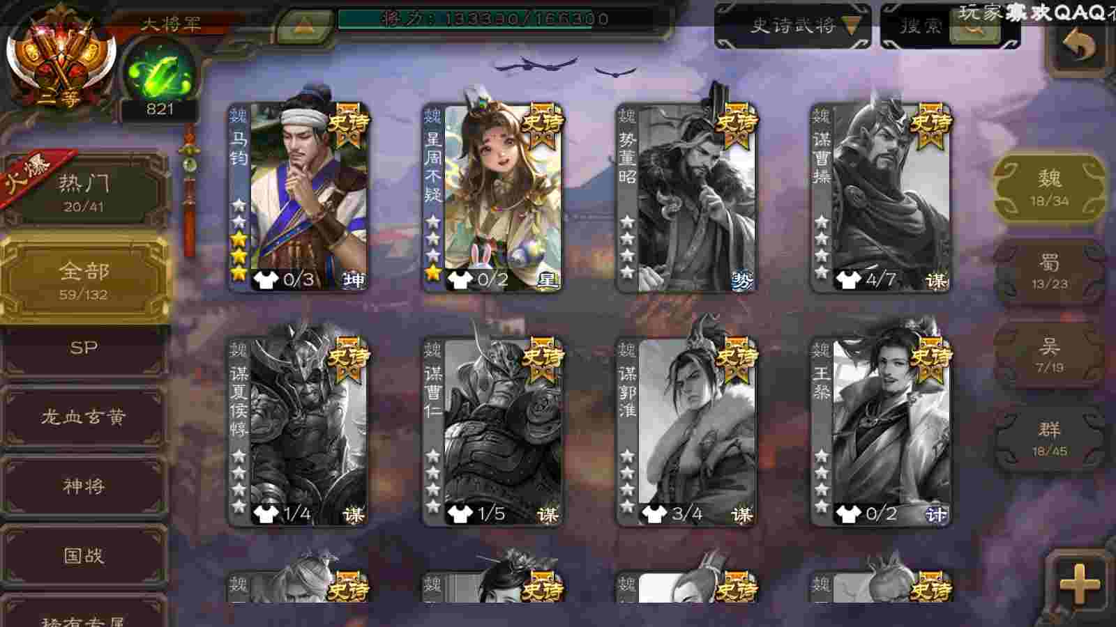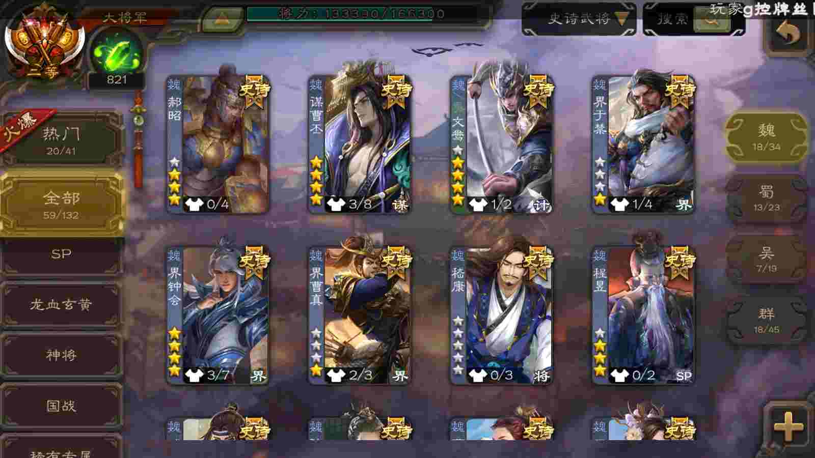 (魏国):曹婴,马钧,王元姬,文鸯,戏志才,界钟会,曹髦,SP司马昭,谋曹丕,界于禁,郝昭,界曹真,星周不疑,程昱,曹纯,陈琳,嵇康