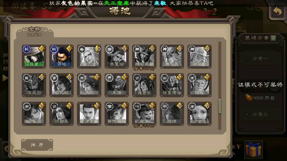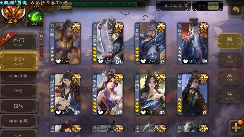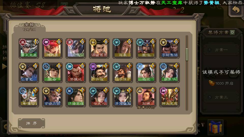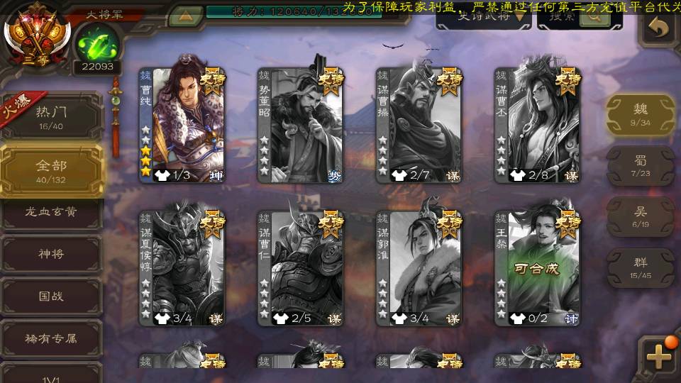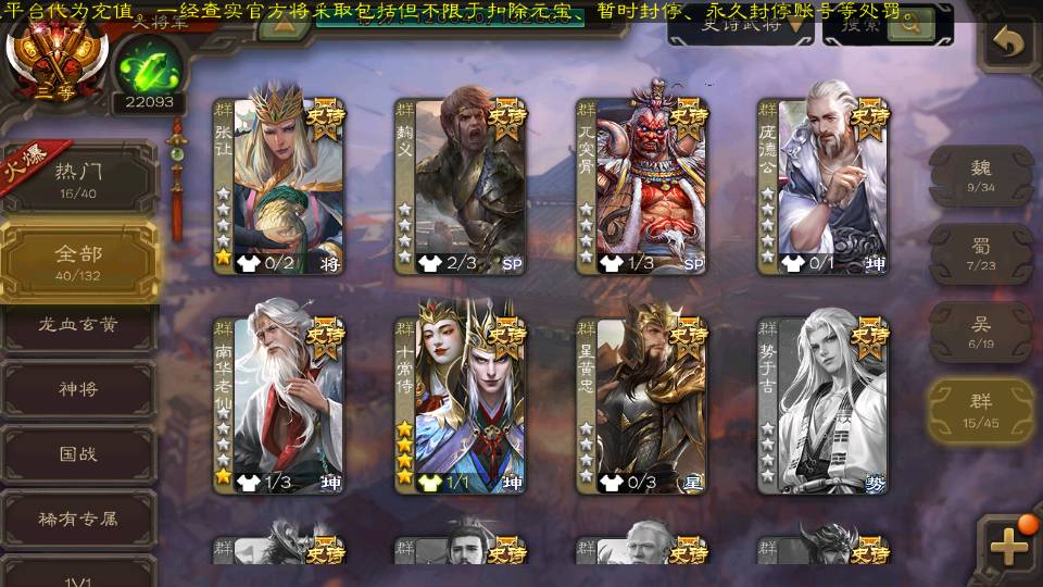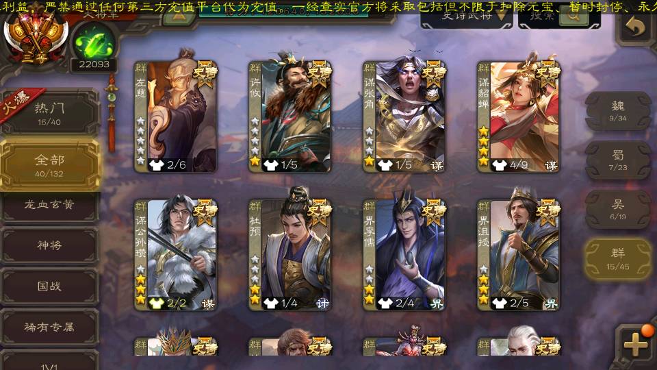 (群雄):杜预,界沮授,南华老仙,麴义,许攸,十常侍,谋貂蝉,张让,界李儒,庞德公,谋公孙瓒,谋张角,星黄忠,左慈,兀突骨