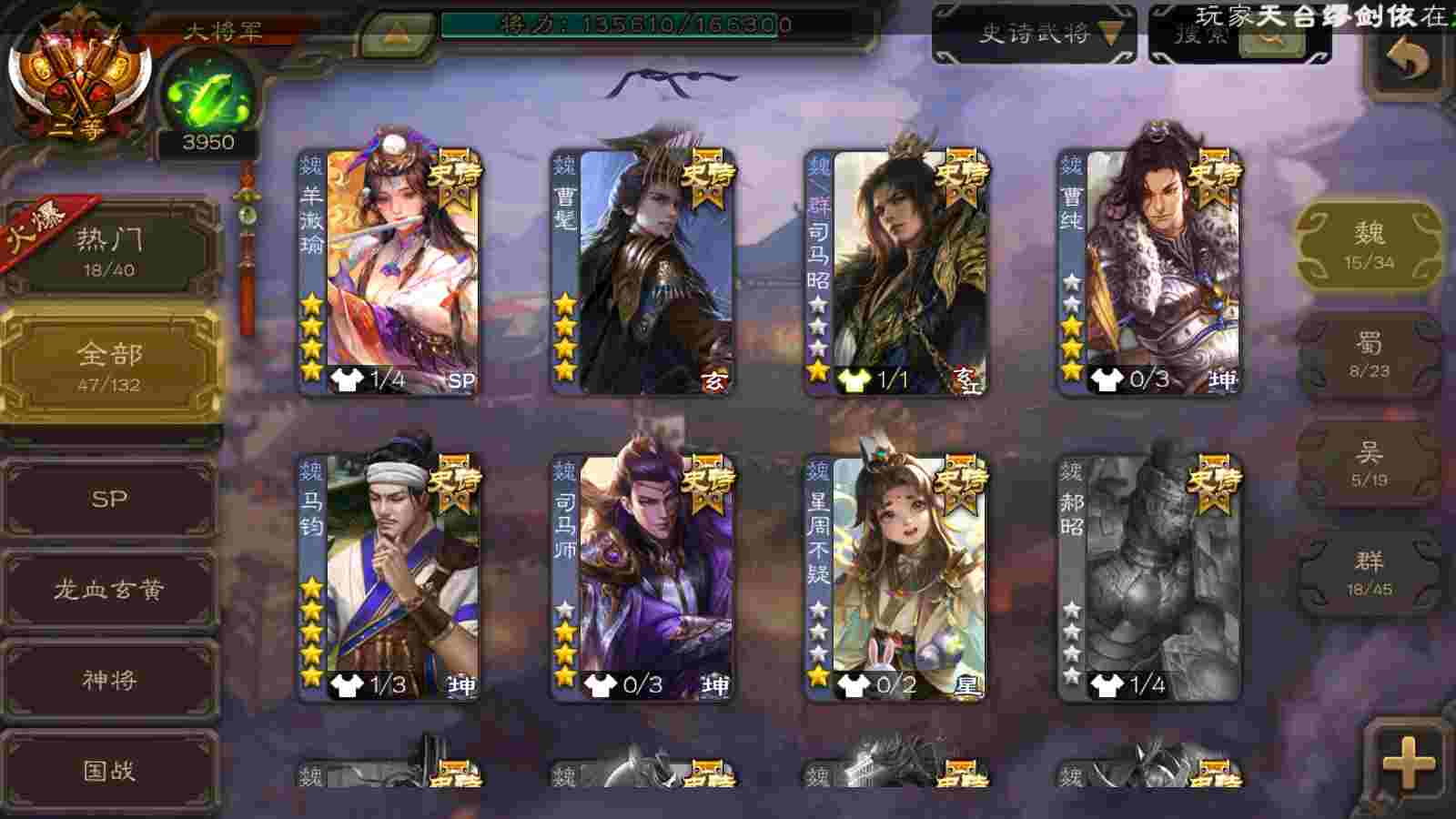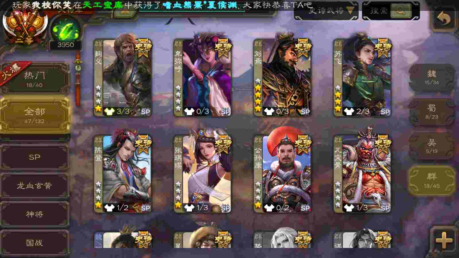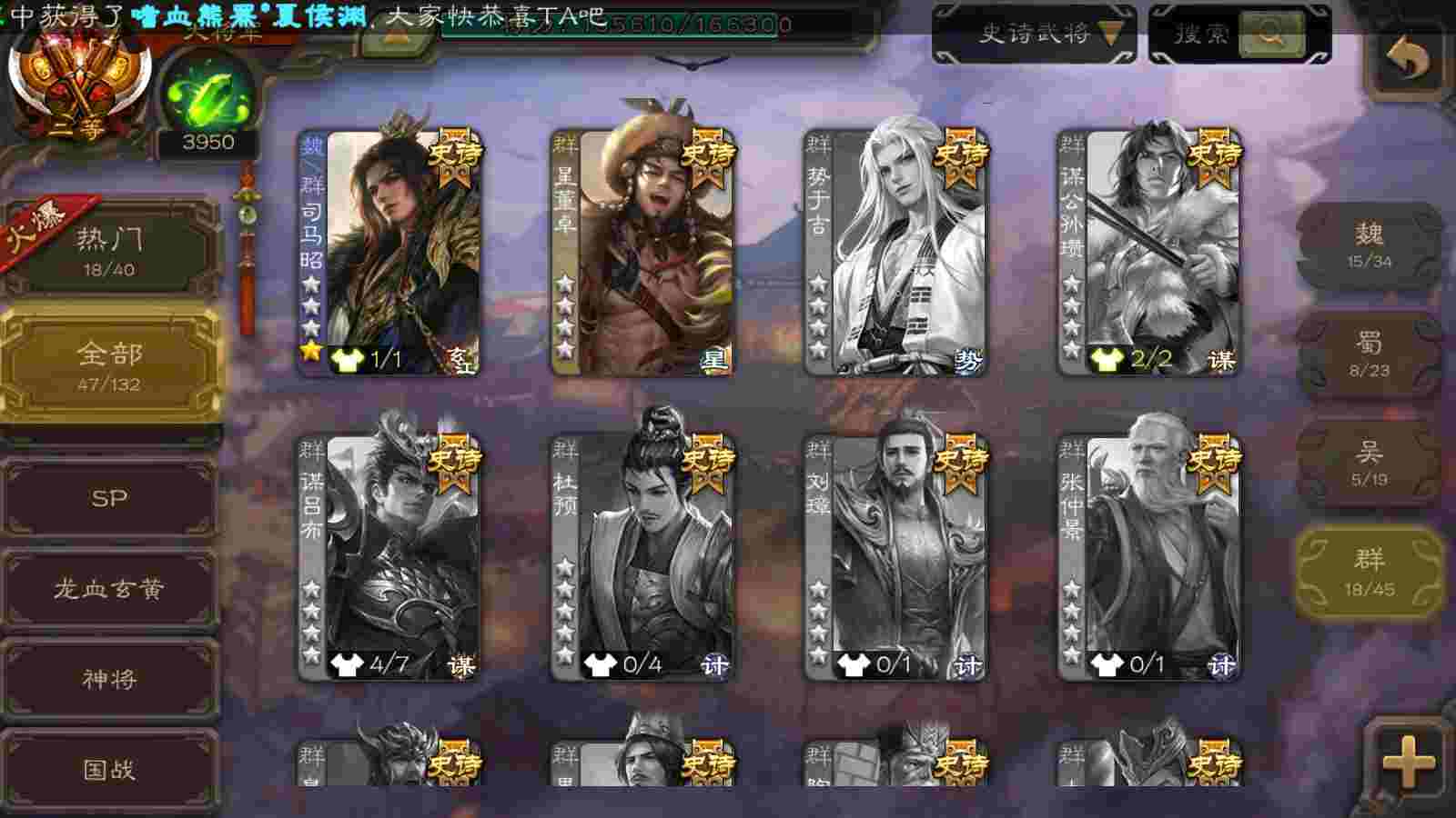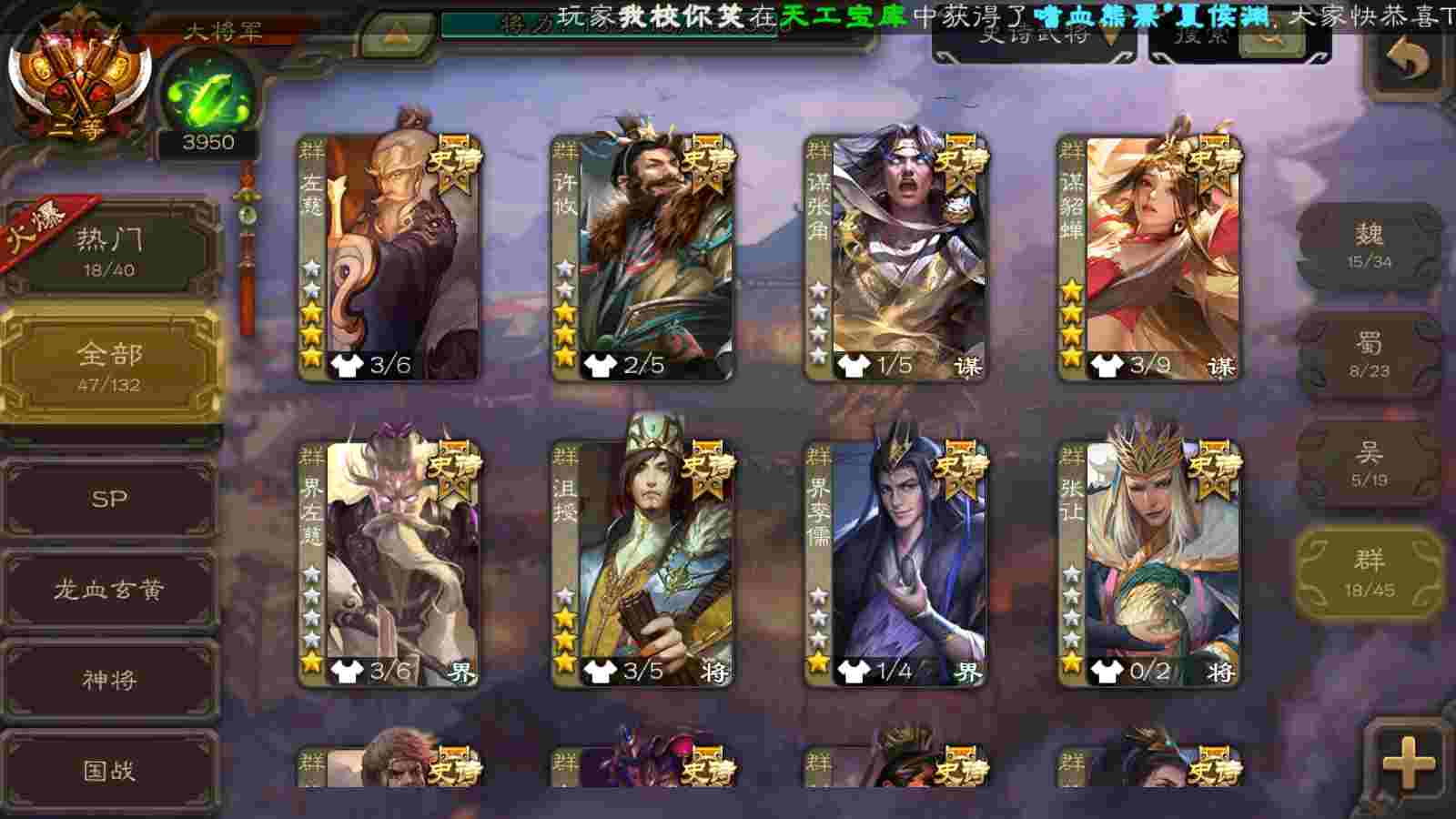 (群雄):刘焉,界左慈,麴义,许攸,星董卓,谋貂蝉,司马昭,张让,界李儒,苏飞,张琪瑛,卑弥呼,谋张角,公孙康,陈登,左慈,沮授,兀突骨