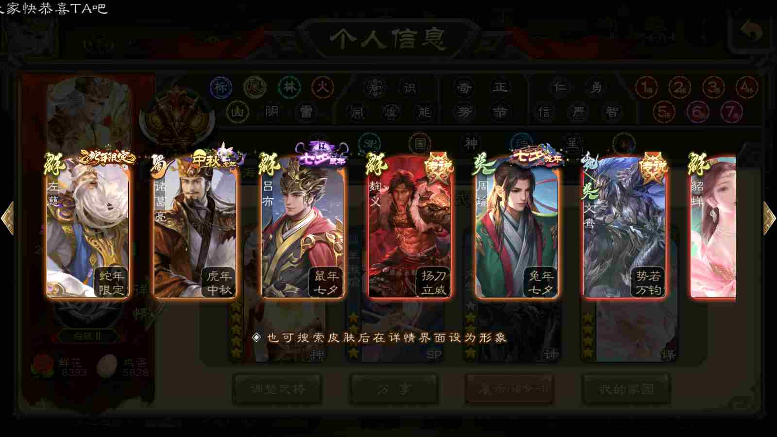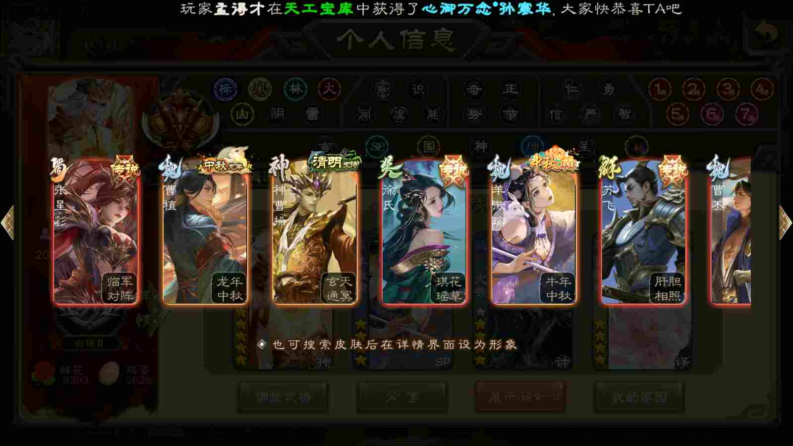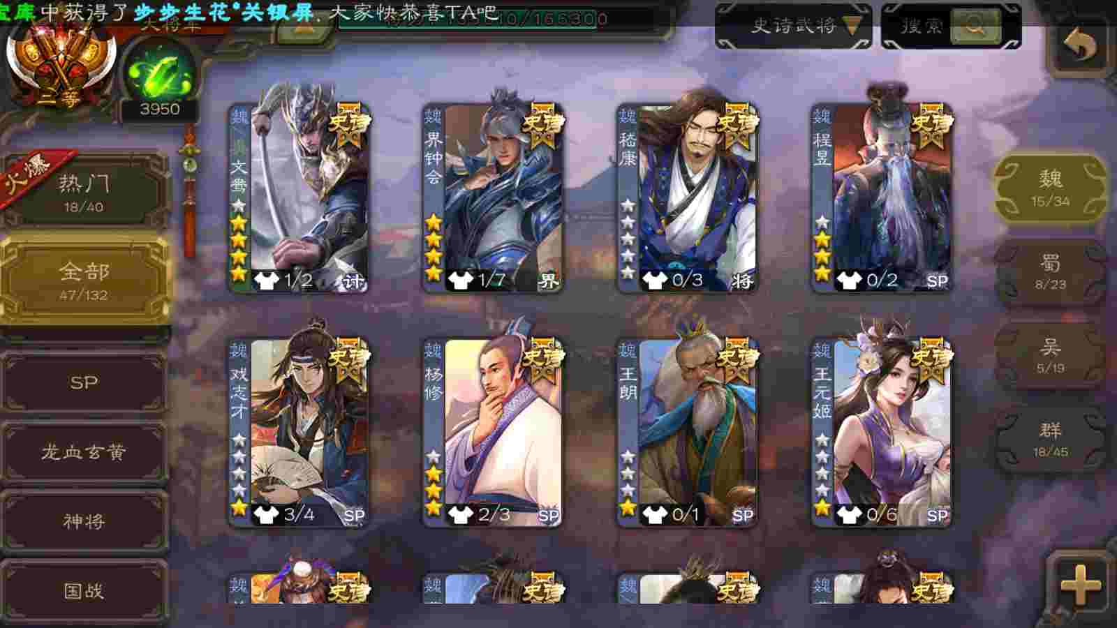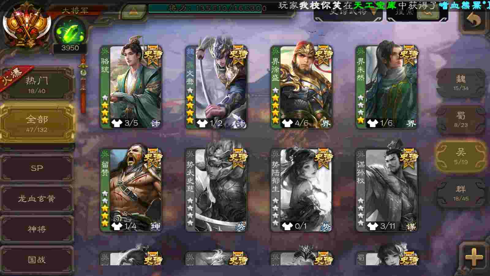 (群雄):刘焉,界左慈,麴义,许攸,星董卓,谋貂蝉,司马昭,张让,界李儒,苏飞,张琪瑛,卑弥呼,谋张角,公孙康,陈登,左慈,沮授,兀突骨