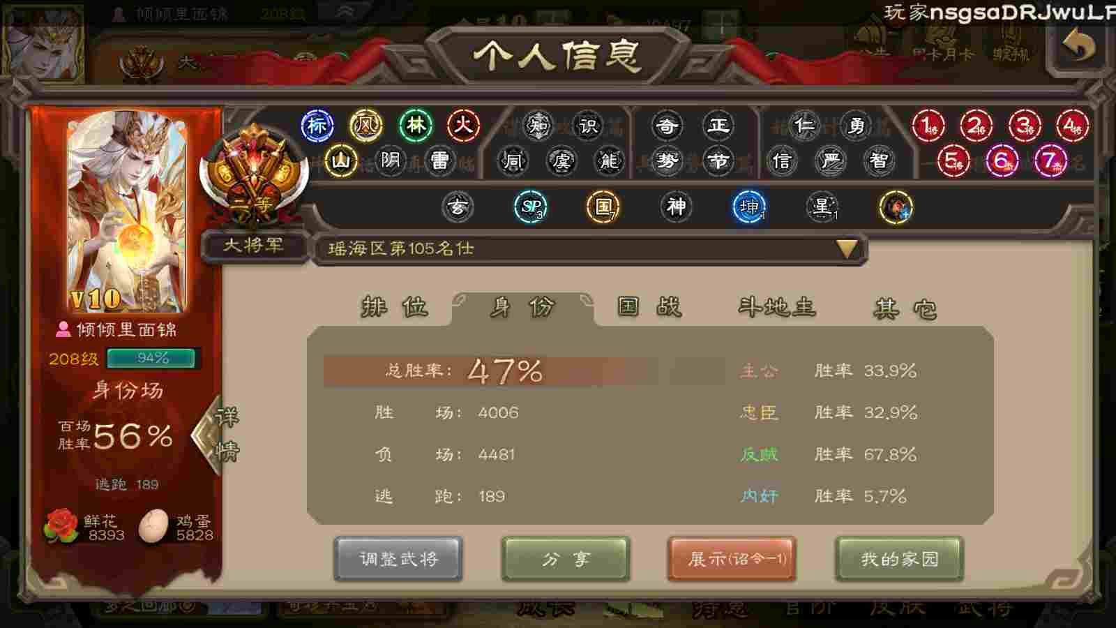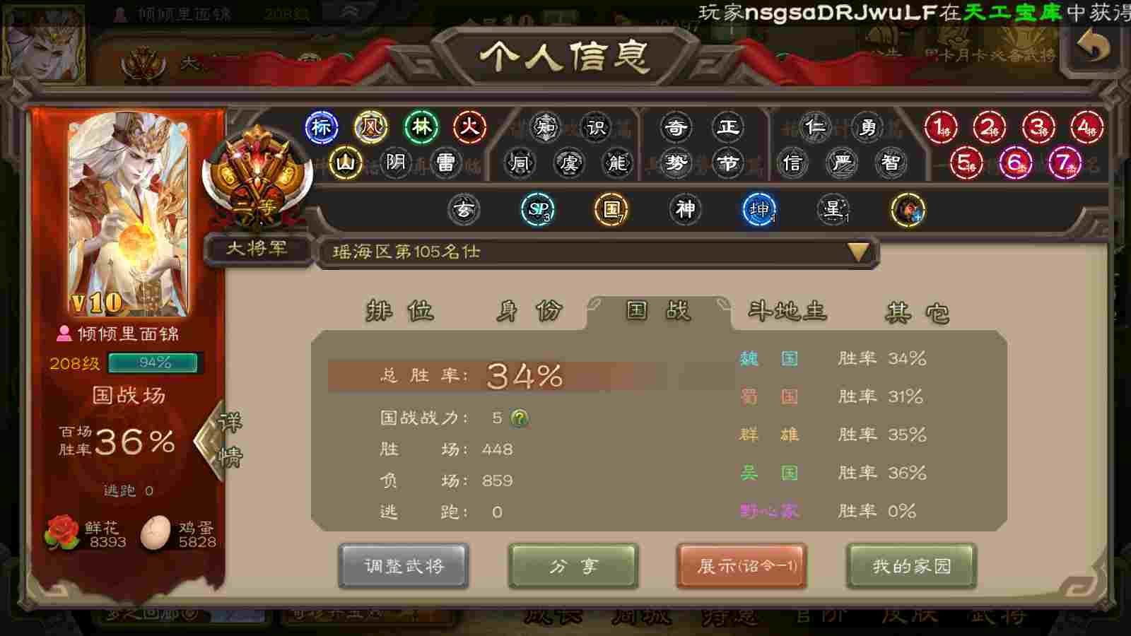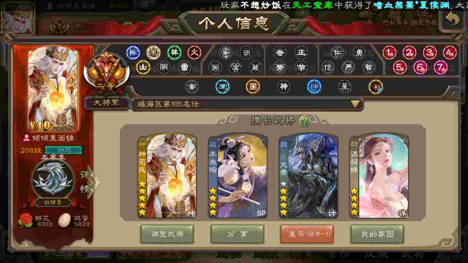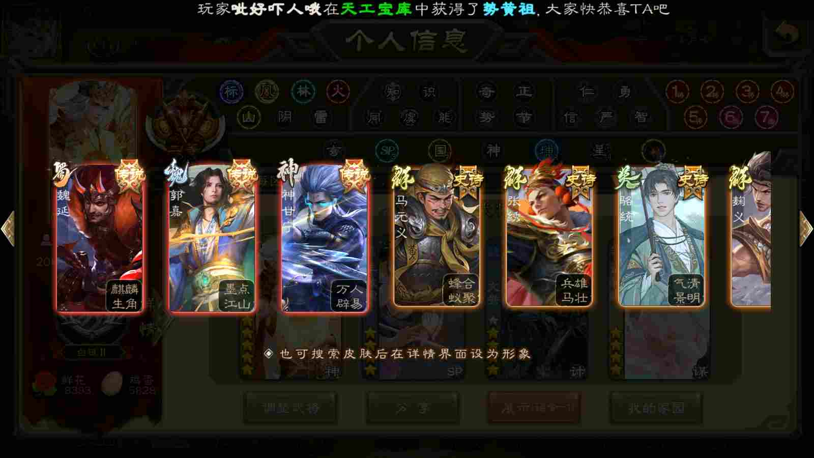 商品编号22413 全部皮肤440,动态皮肤50,全部武将379,排位武将107,国战武将90,史诗武将47,文鸯动皮,麴义动皮,欢乐豆15.2w,宝珠23,心愿积分1.5w,金票7.6w,将魂3.9k