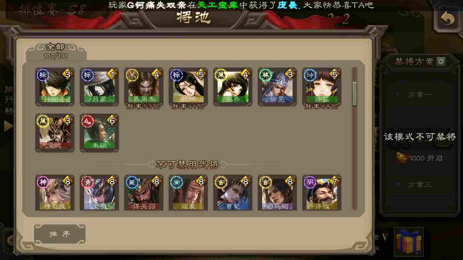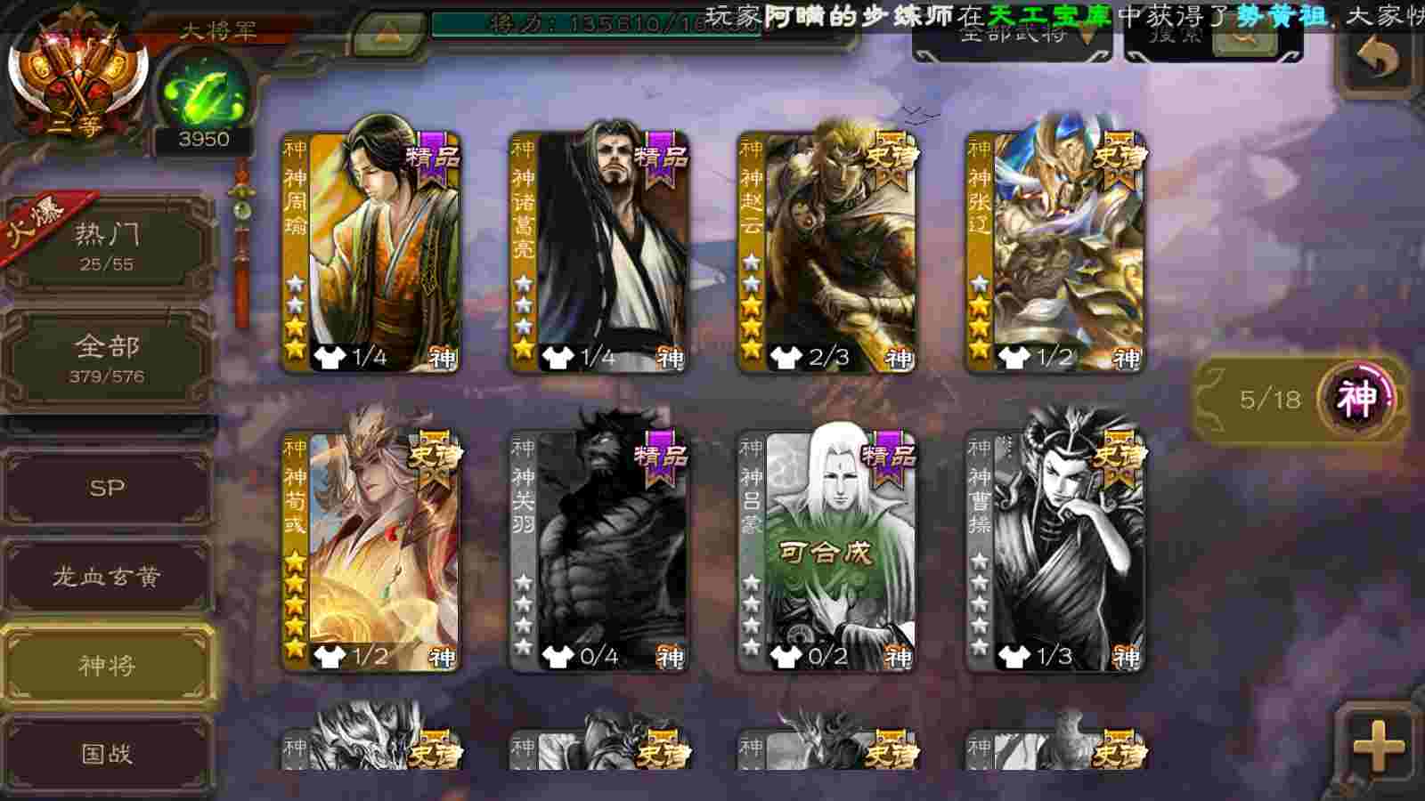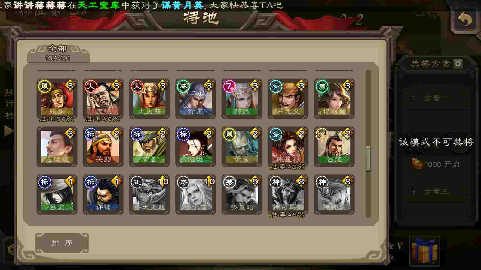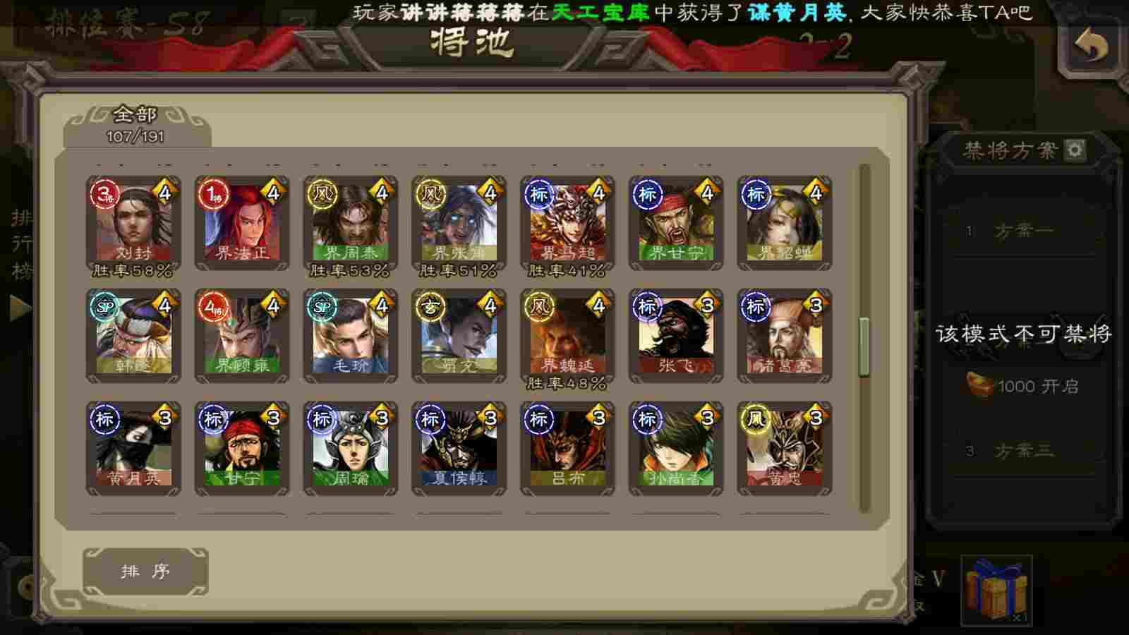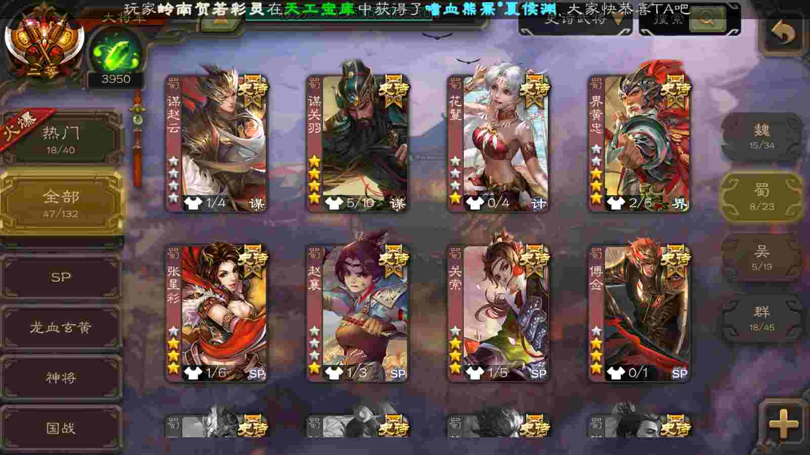 (蜀国):谋关羽,谋赵云,界黄忠,花鬘,傅佥,关索,张星彩,赵襄