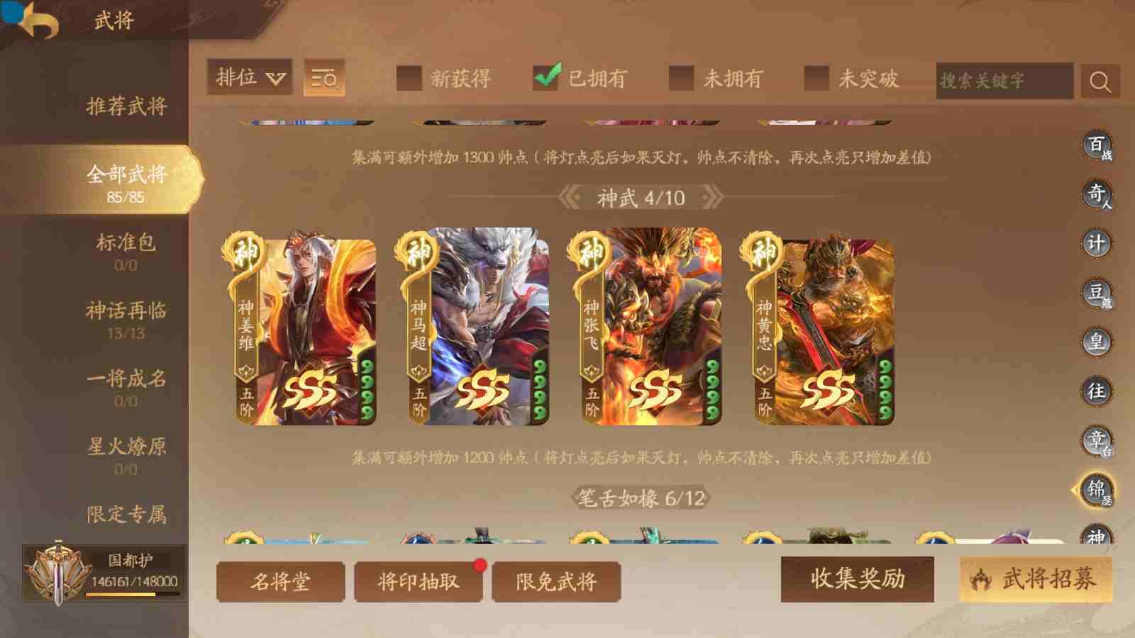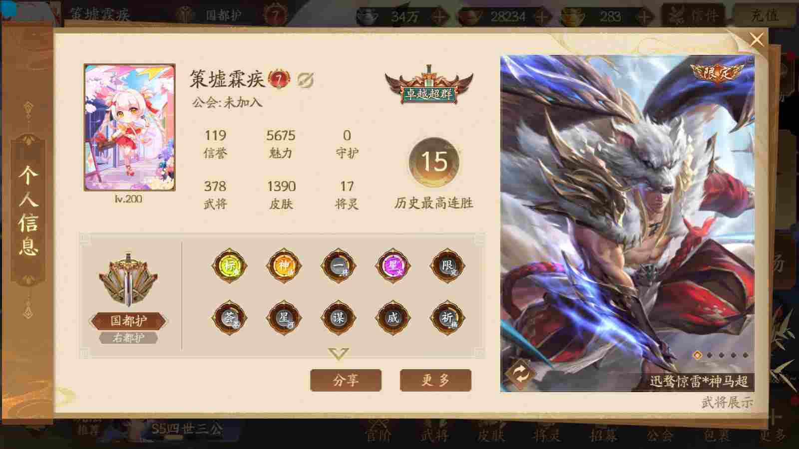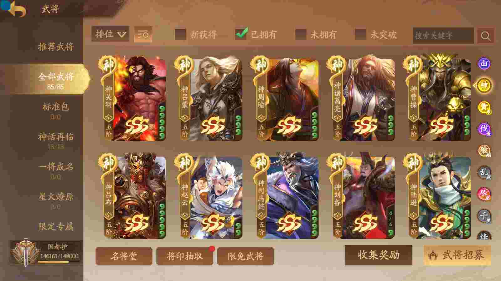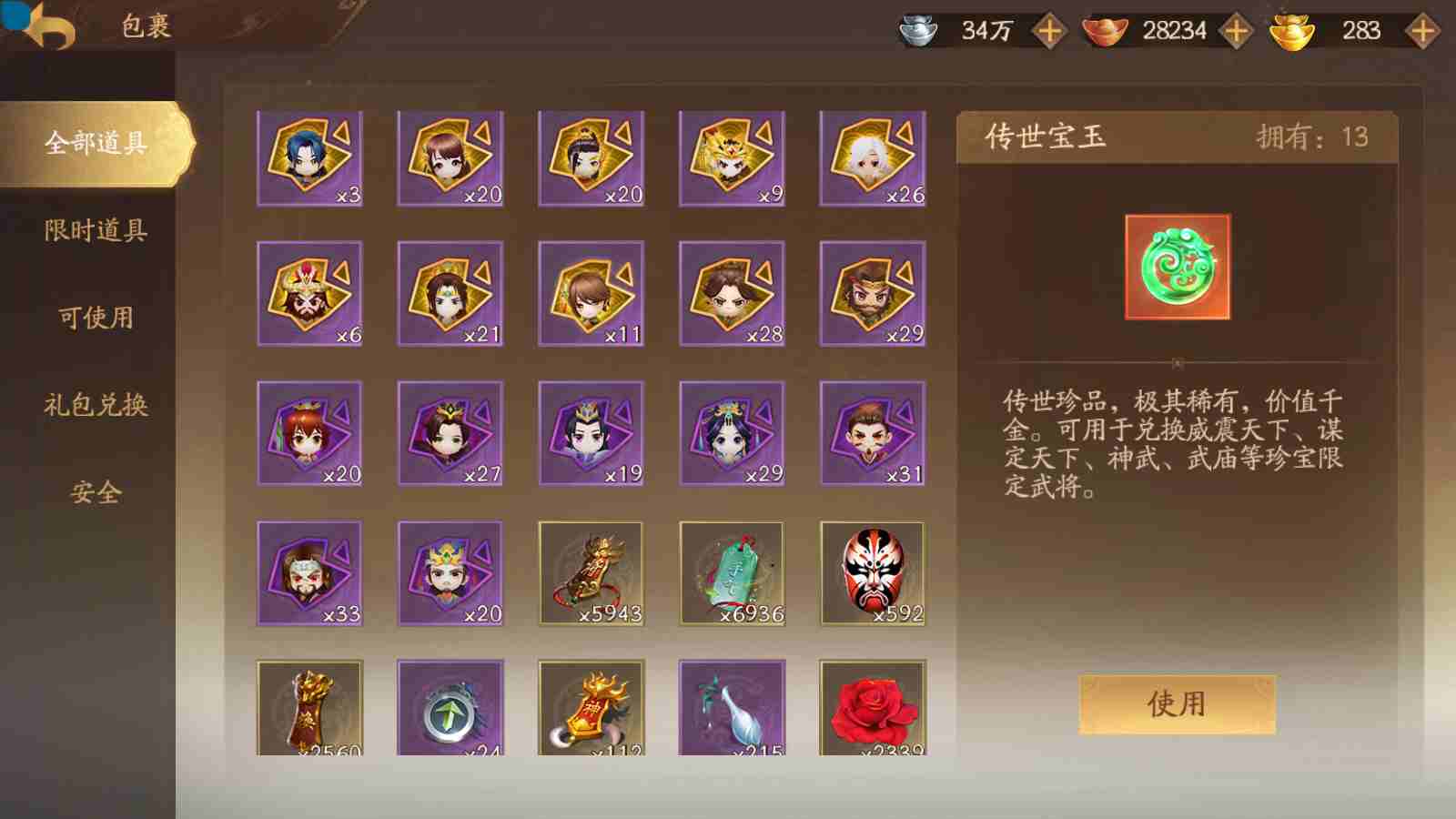 商品编号sa171 编号sa171 武将:神姜维,神马超(限动),神张飞(限动),神黄忠,王荣(绝版),许劭,董承,关索,赵襄(限动),曹婴,南华老仙,曹金玉(限动),管宁,曹髦(绝版),来莺儿,蒲元,徐荣,留赞,孙翊,张嫙,周宣,丁尚涴,骆统,郭照,孙翎鸾,笮融,薛灵芸,芮姬,全惠解,田尚衣,孙寒华,乐蔡文姬 将灵:SSA曹纯,SSA小闪 包裹:传世玉13,祈福灯10,V7会员,总武将378,总皮肤1817,总国战101,帅点14.6w