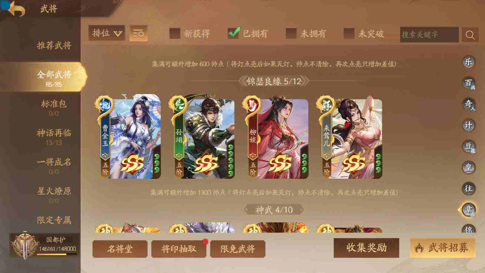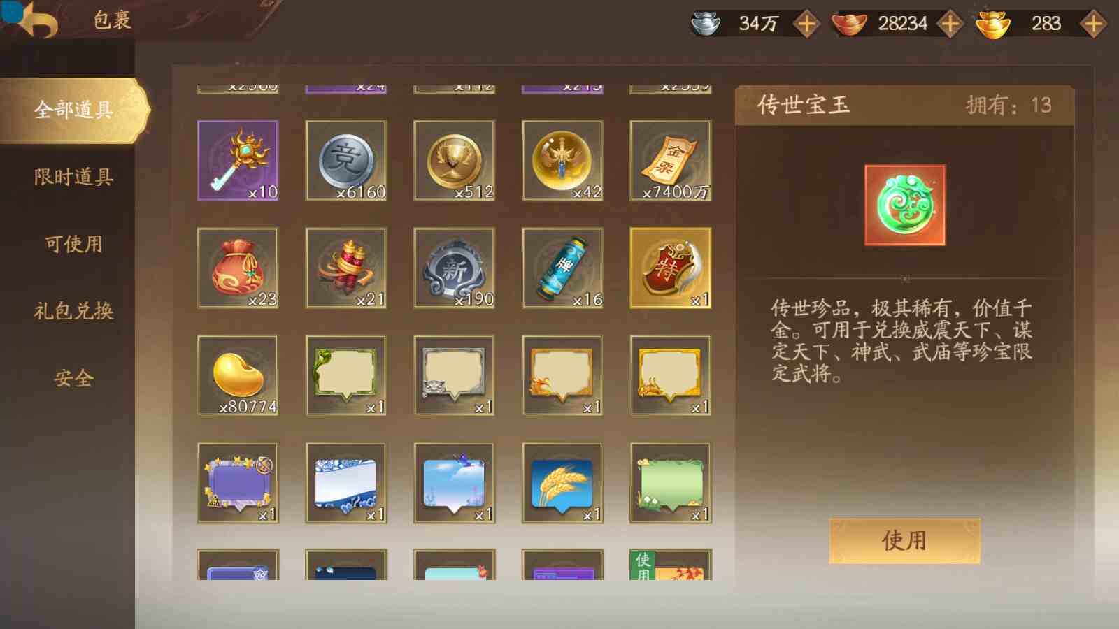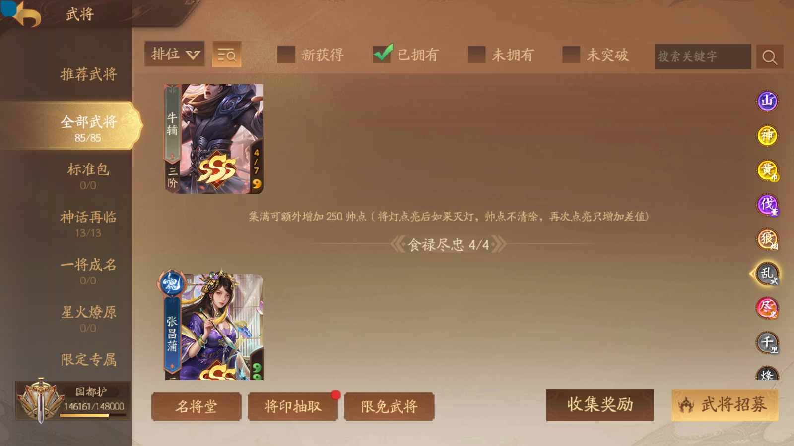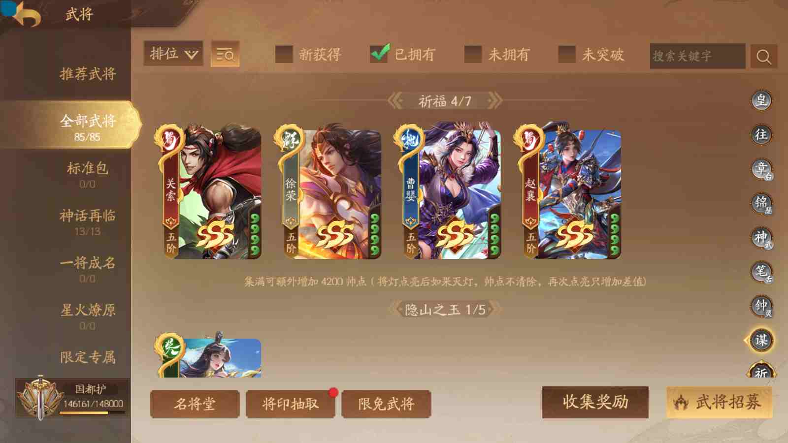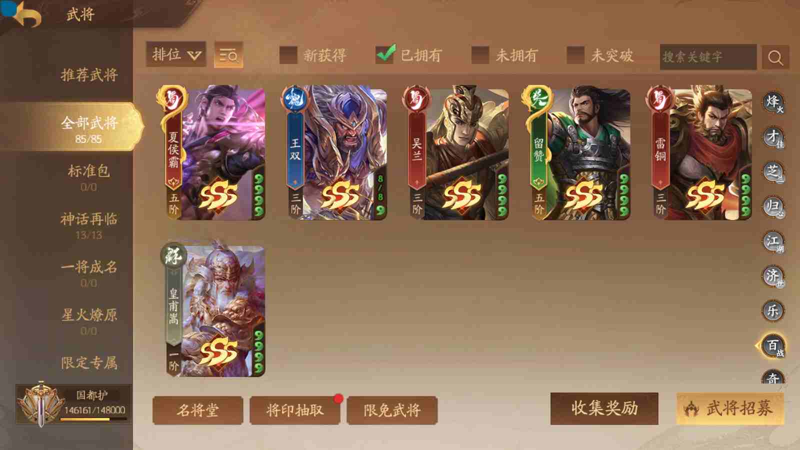 商品编号sa171 编号sa171 武将:神姜维,神马超(限动),神张飞(限动),神黄忠,王荣(绝版),许劭,董承,关索,赵襄(限动),曹婴,南华老仙,曹金玉(限动),管宁,曹髦(绝版),来莺儿,蒲元,徐荣,留赞,孙翊,张嫙,周宣,丁尚涴,骆统,郭照,孙翎鸾,笮融,薛灵芸,芮姬,全惠解,田尚衣,孙寒华,乐蔡文姬 将灵:SSA曹纯,SSA小闪 包裹:传世玉13,祈福灯10,V7会员,总武将378,总皮肤1817,总国战101,帅点14.6w