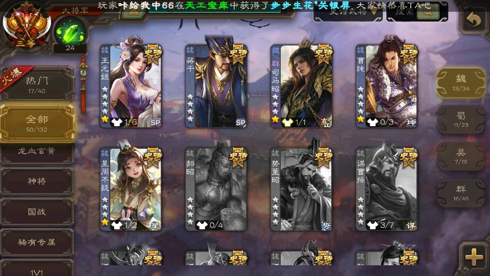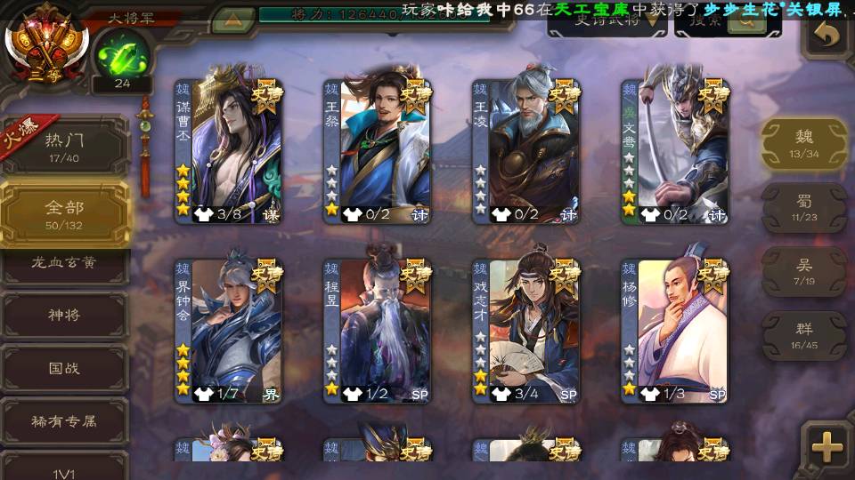 (魏国):王元姬,文鸯,戏志才,界钟会,谋曹丕,蒋干,王粲,王凌,星周不疑,程昱,曹纯,杨修