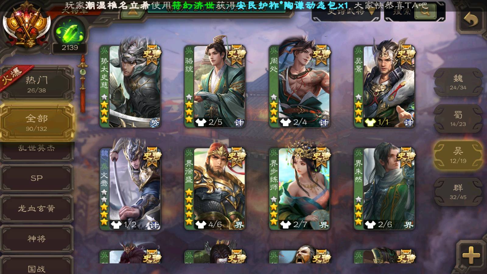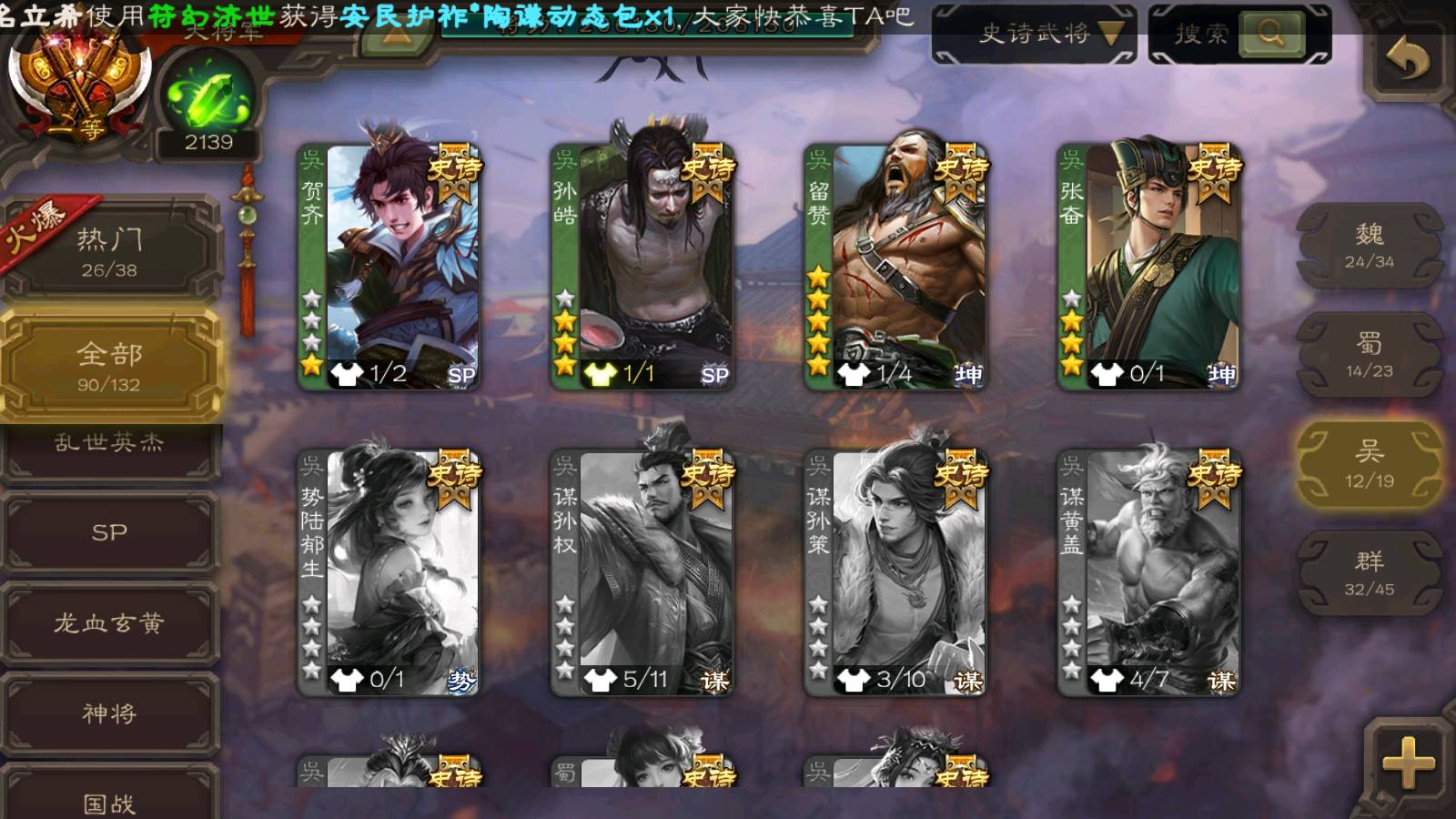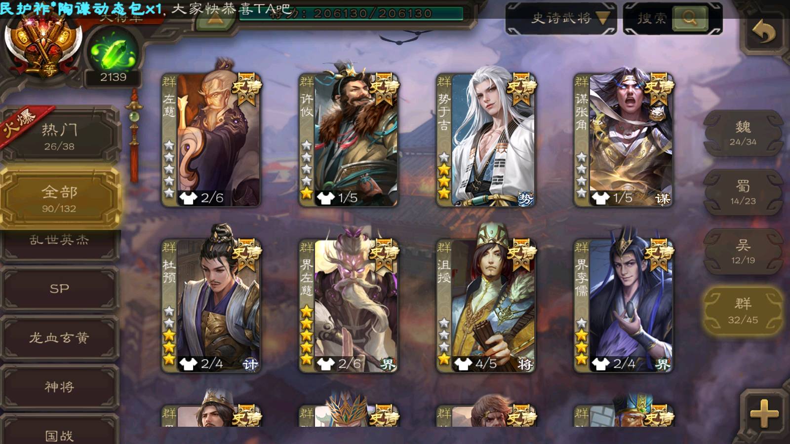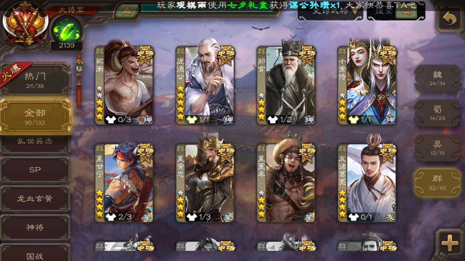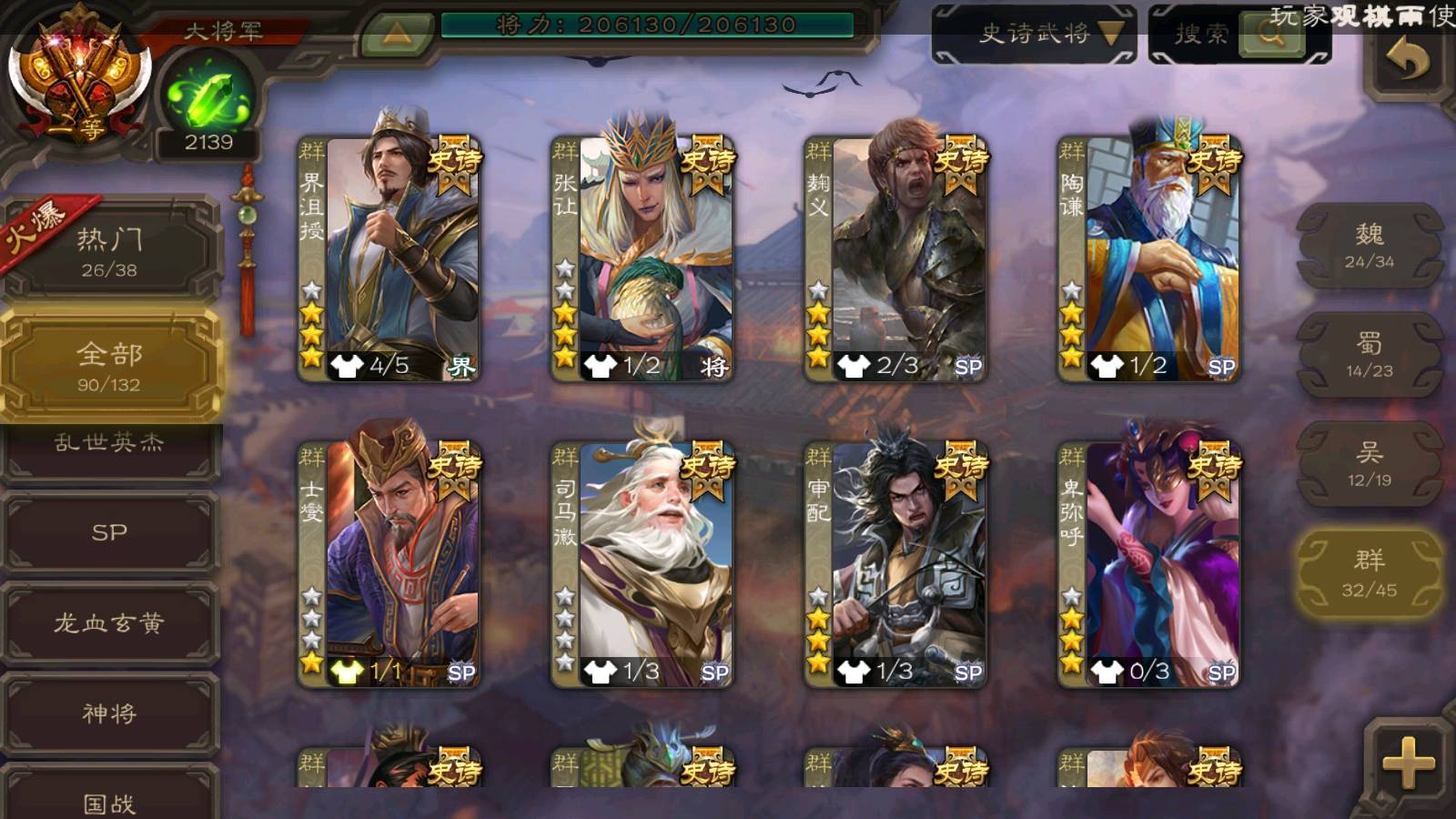 (群雄):刘焉,徐荣,杜预,祢衡,友诸葛亮,界左慈,界沮授,麴义,许攸,十常侍,星董卓,司马昭,张让,界李儒,苏飞,庞德公,星甘宁,势于吉,张琪瑛,卑弥呼,士燮,谋张角,王允,公孙康,郑玄,陶谦,审配,星黄忠,司马徽,左慈,沮授,兀突骨