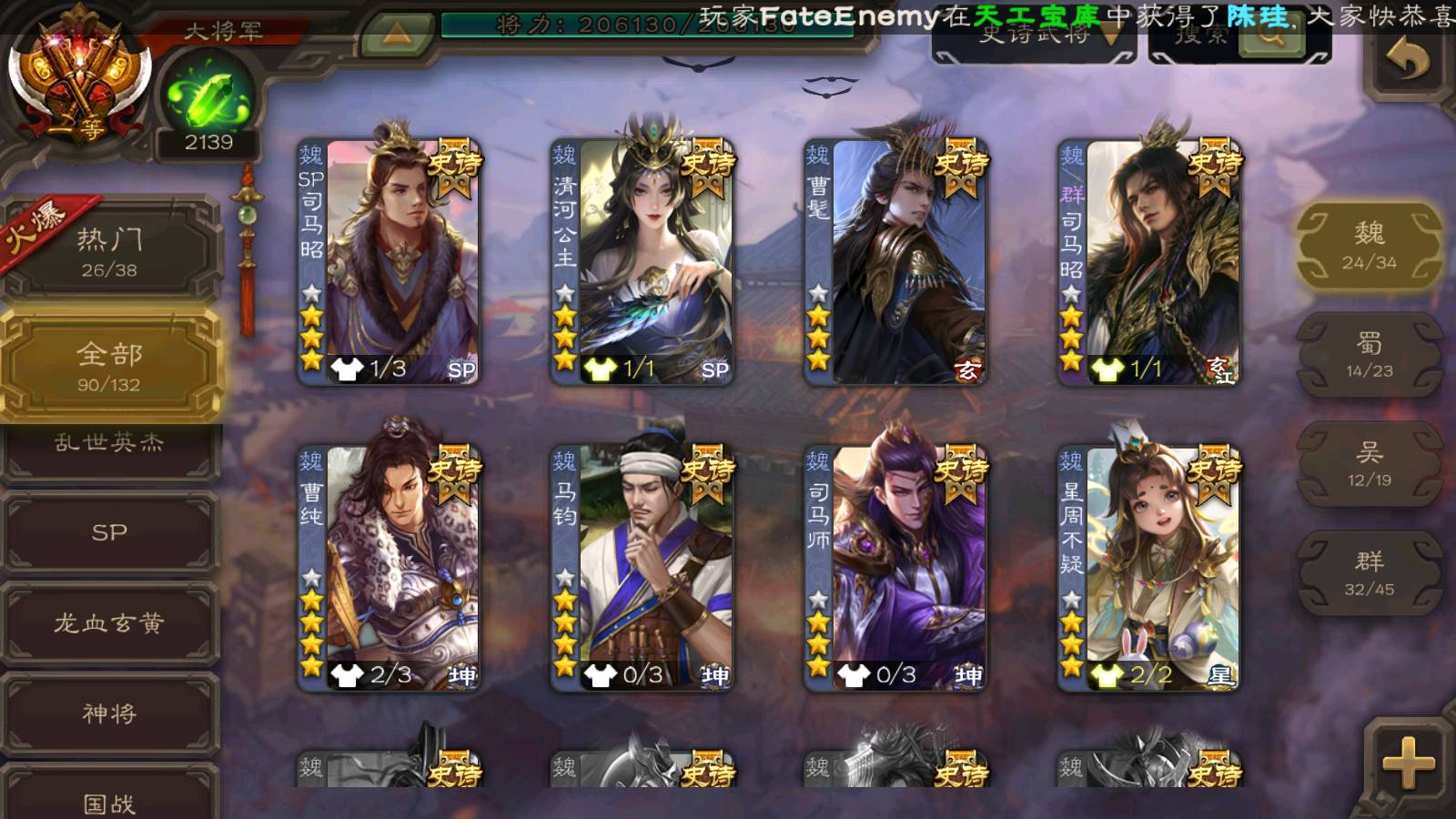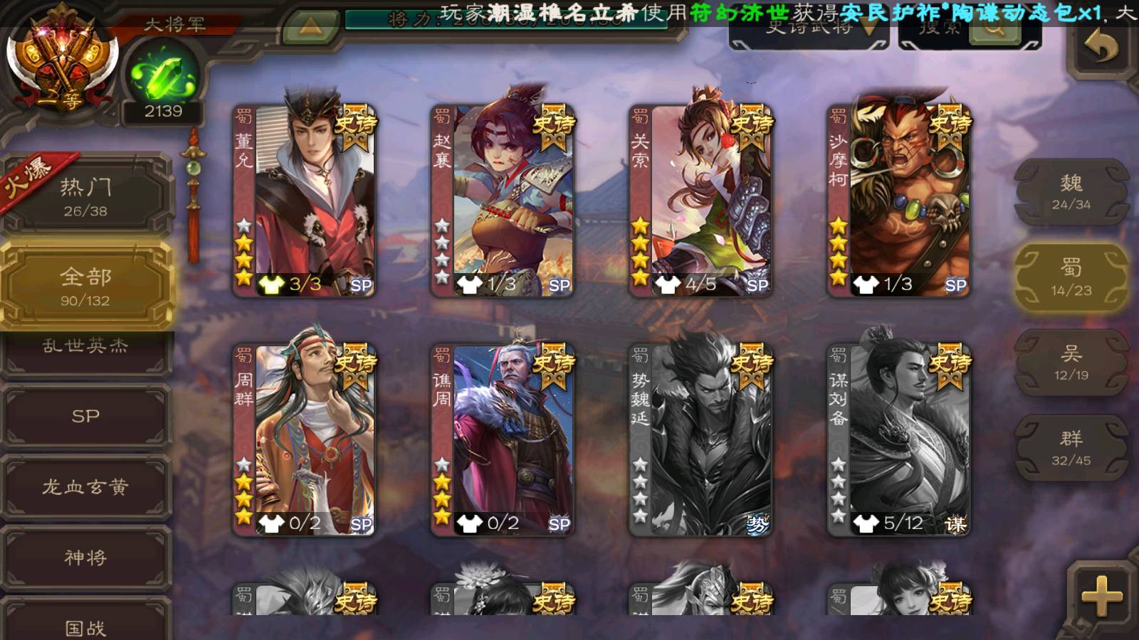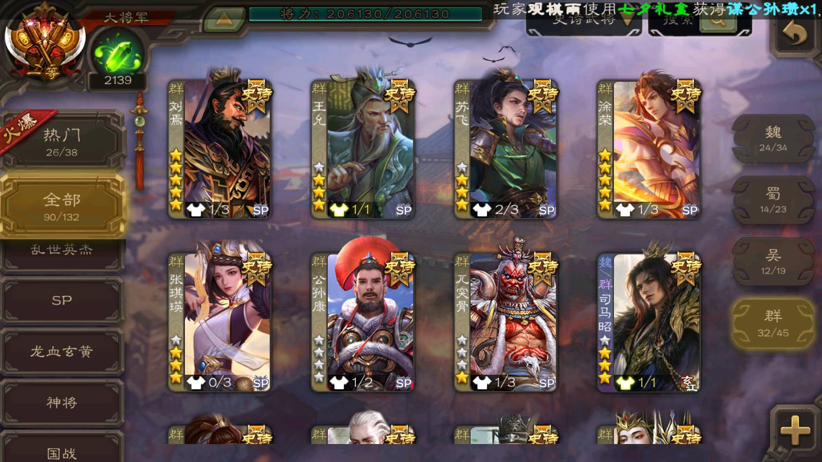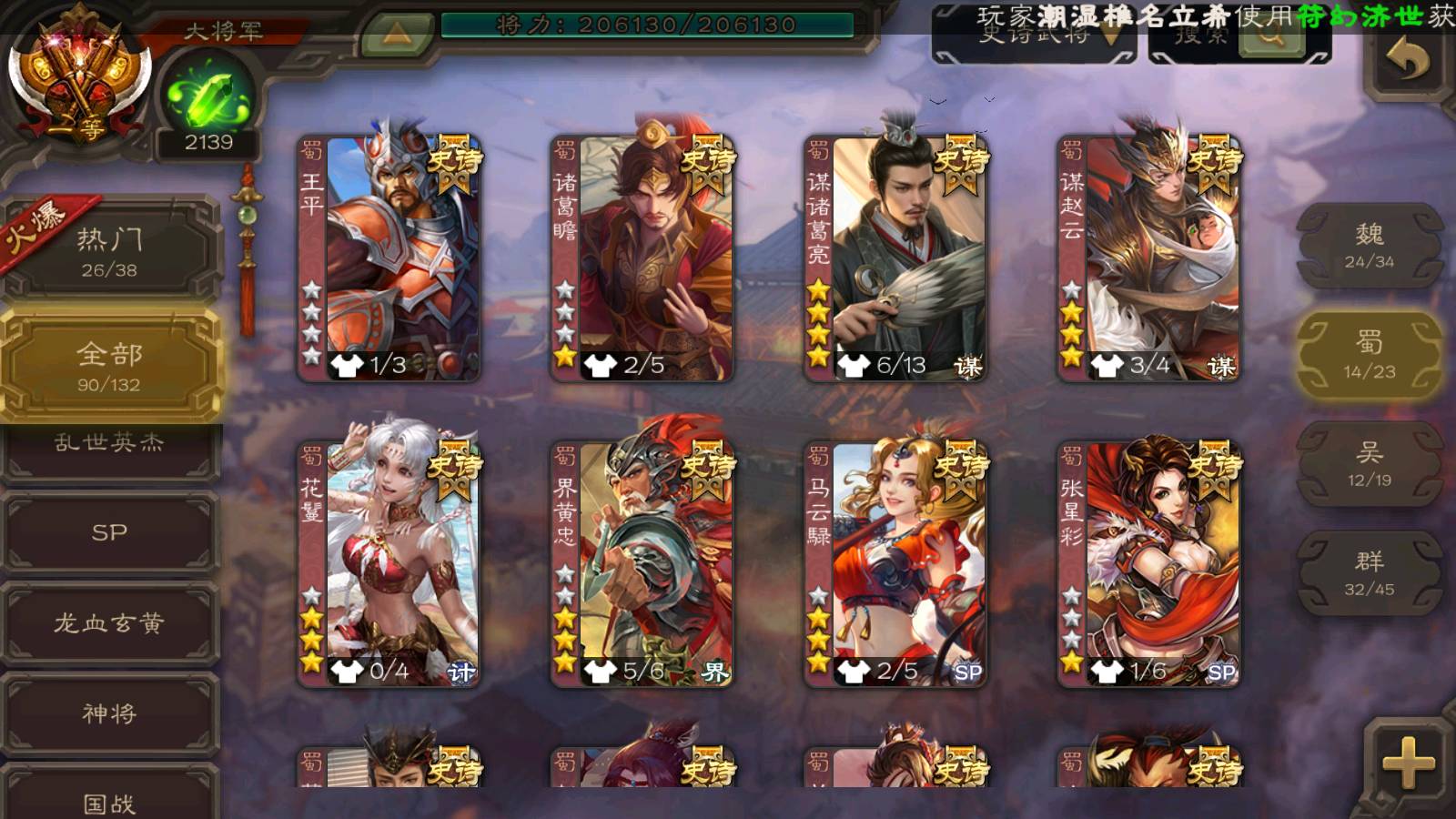 (群雄):刘焉,徐荣,杜预,祢衡,友诸葛亮,界左慈,界沮授,麴义,许攸,十常侍,星董卓,司马昭,张让,界李儒,苏飞,庞德公,星甘宁,势于吉,张琪瑛,卑弥呼,士燮,谋张角,王允,公孙康,郑玄,陶谦,审配,星黄忠,司马徽,左慈,沮授,兀突骨