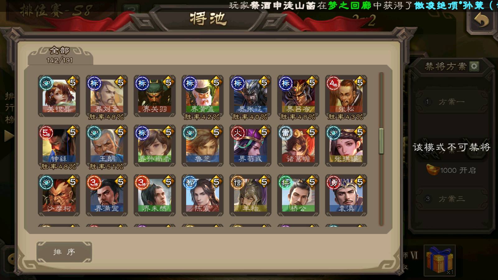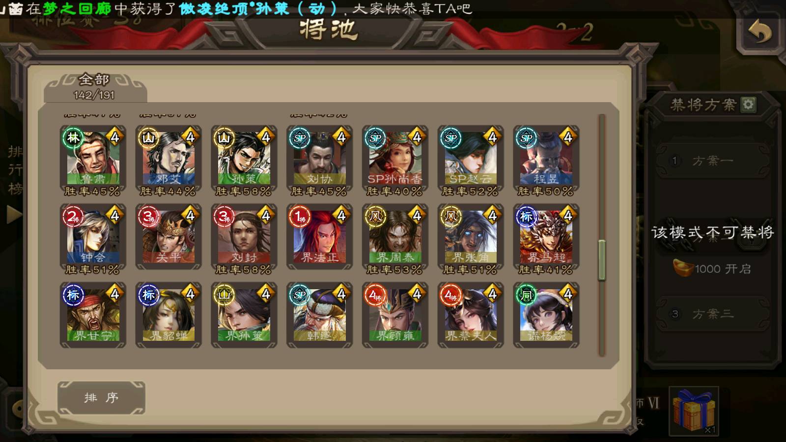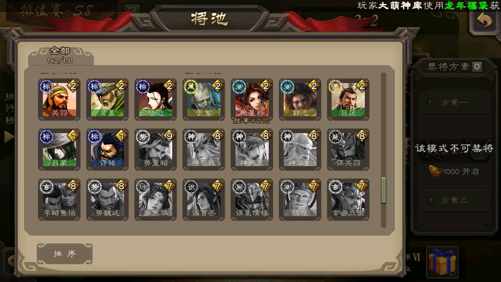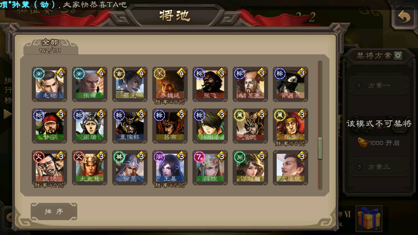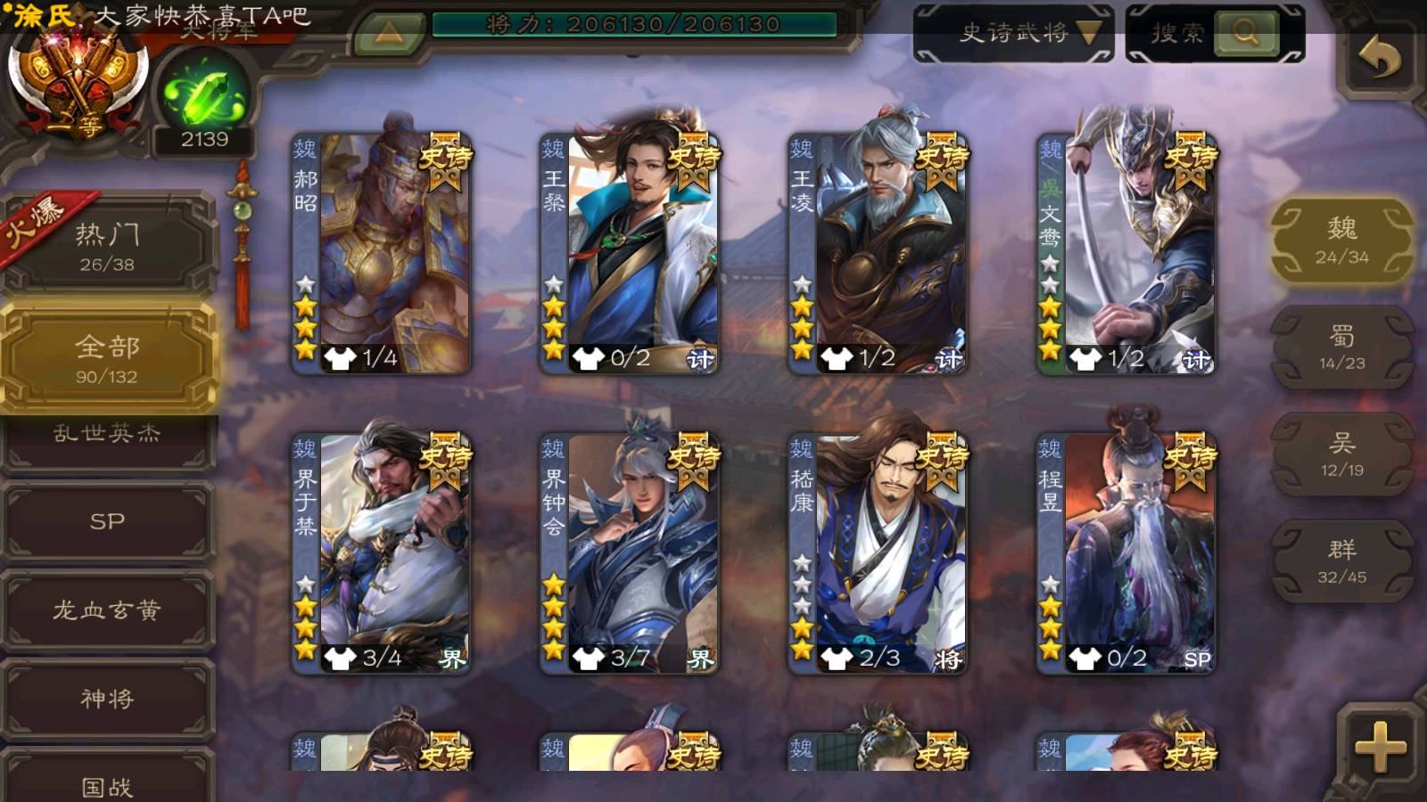 (群雄):刘焉,徐荣,杜预,祢衡,友诸葛亮,界左慈,界沮授,麴义,许攸,十常侍,星董卓,司马昭,张让,界李儒,苏飞,庞德公,星甘宁,势于吉,张琪瑛,卑弥呼,士燮,谋张角,王允,公孙康,郑玄,陶谦,审配,星黄忠,司马徽,左慈,沮授,兀突骨