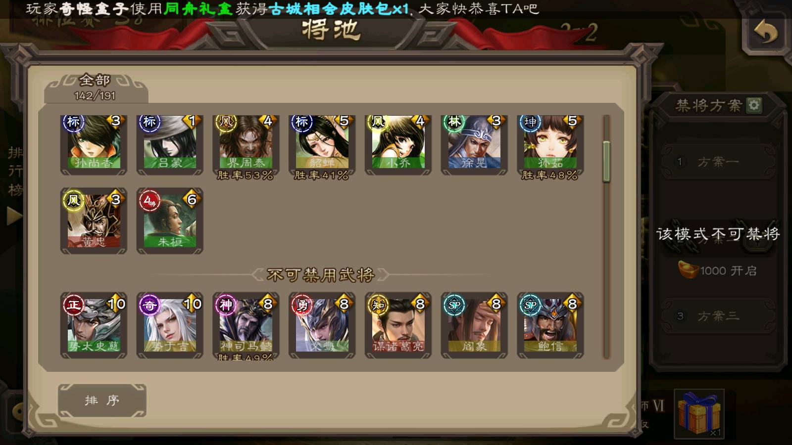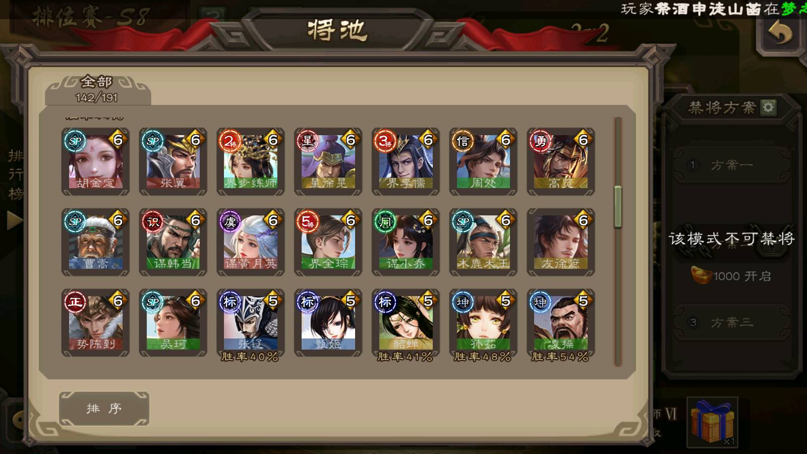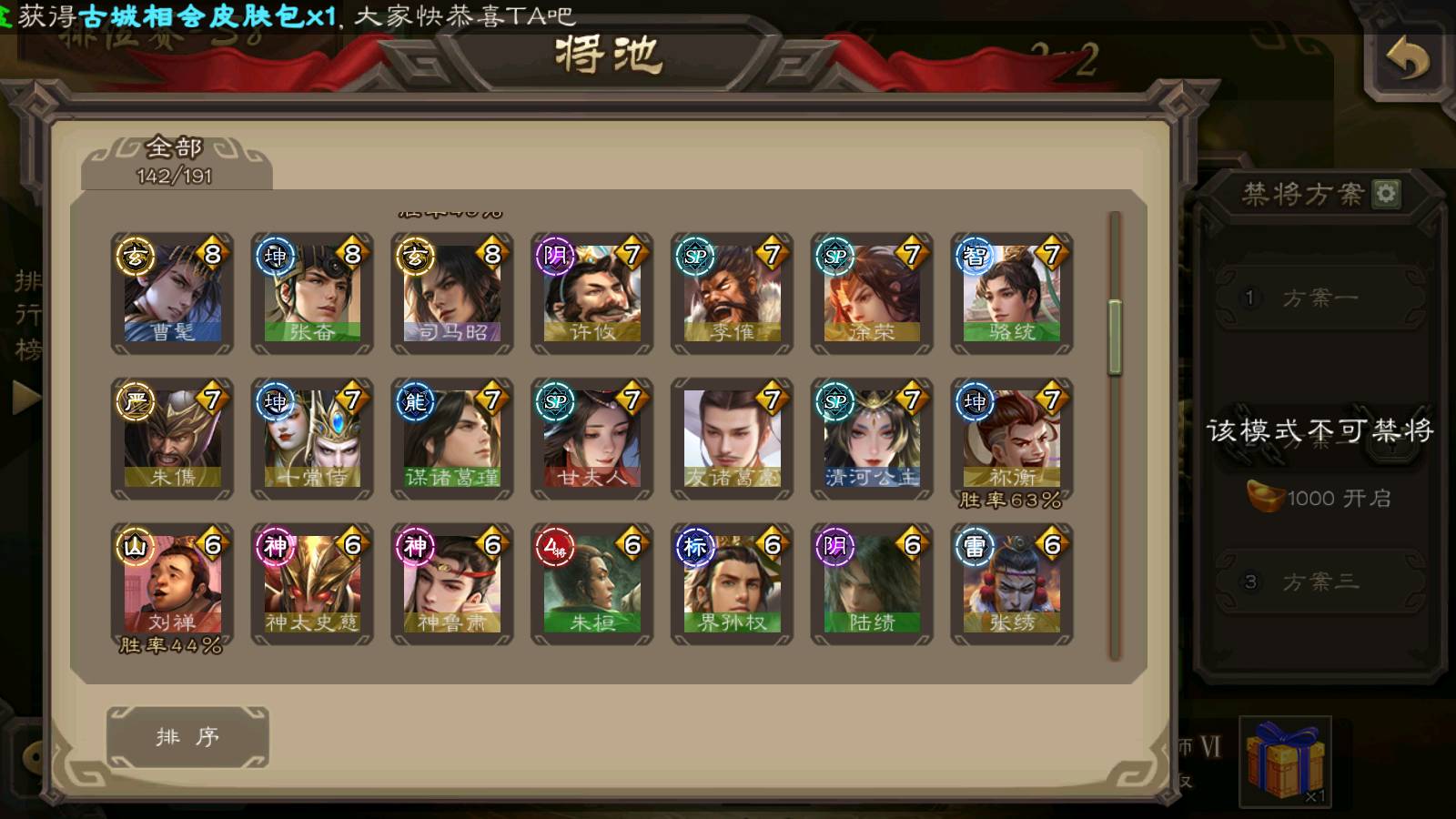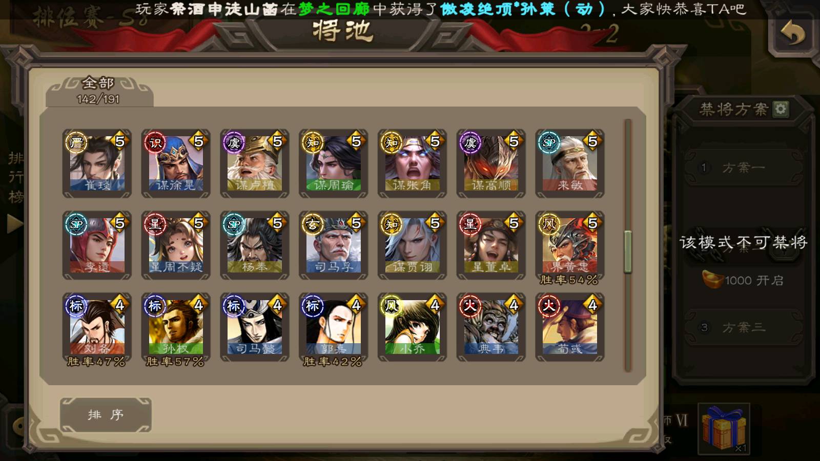 (群雄):刘焉,徐荣,杜预,祢衡,友诸葛亮,界左慈,界沮授,麴义,许攸,十常侍,星董卓,司马昭,张让,界李儒,苏飞,庞德公,星甘宁,势于吉,张琪瑛,卑弥呼,士燮,谋张角,王允,公孙康,郑玄,陶谦,审配,星黄忠,司马徽,左慈,沮授,兀突骨