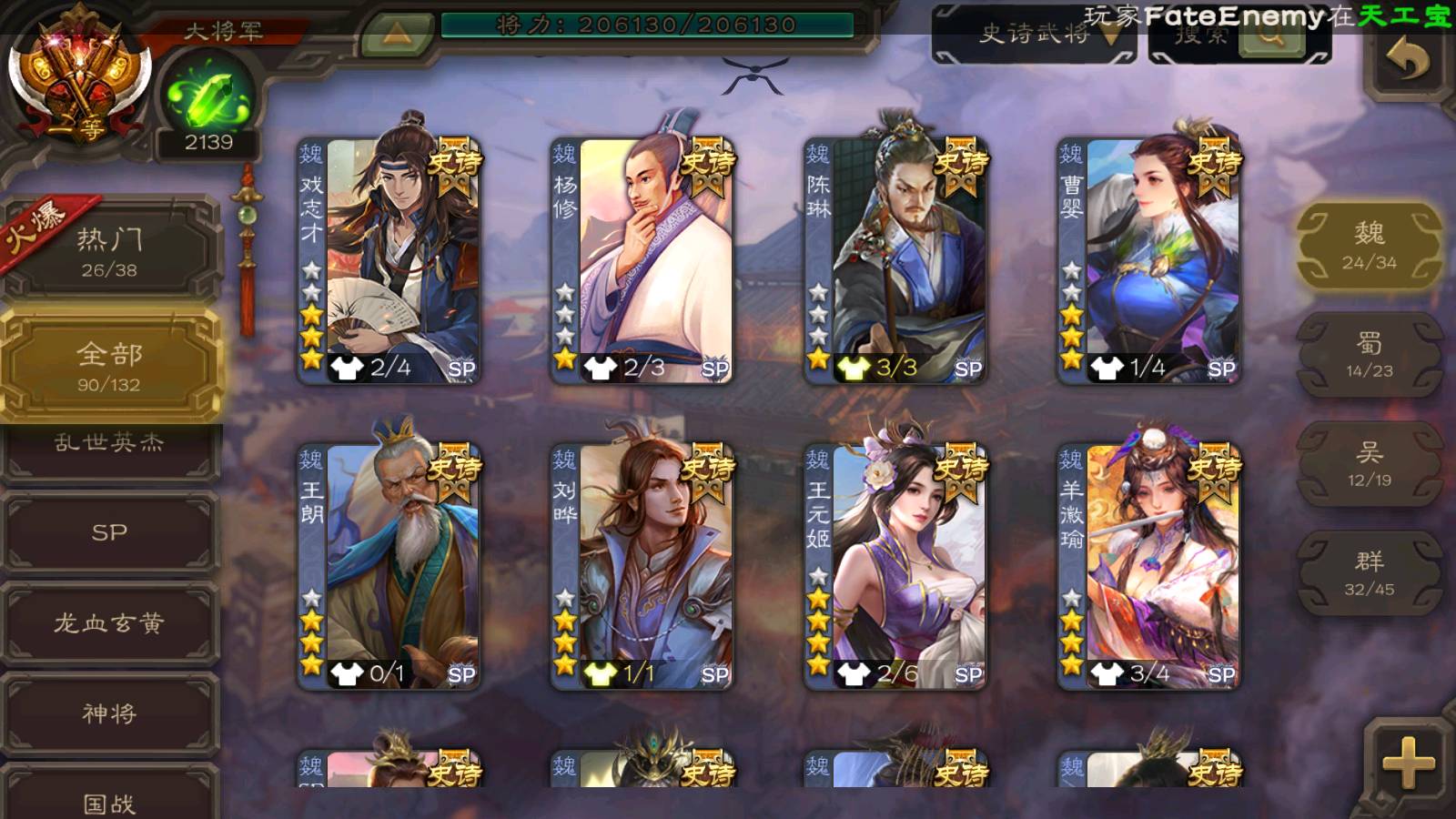 (魏国):曹婴,马钧,王元姬,羊徽瑜,文鸯,戏志才,界钟会,曹髦,SP司马昭,司马师,王朗,清河公主,界于禁,郝昭,王粲,王凌,星周不疑,程昱,曹纯,杨修,陈琳,嵇康,刘晔