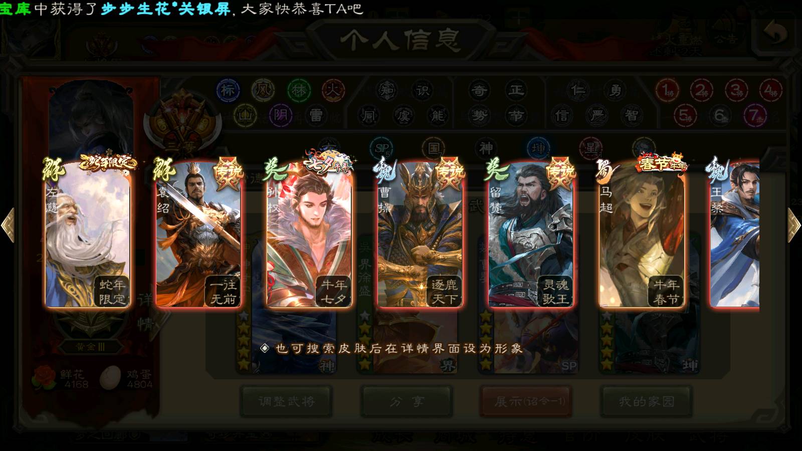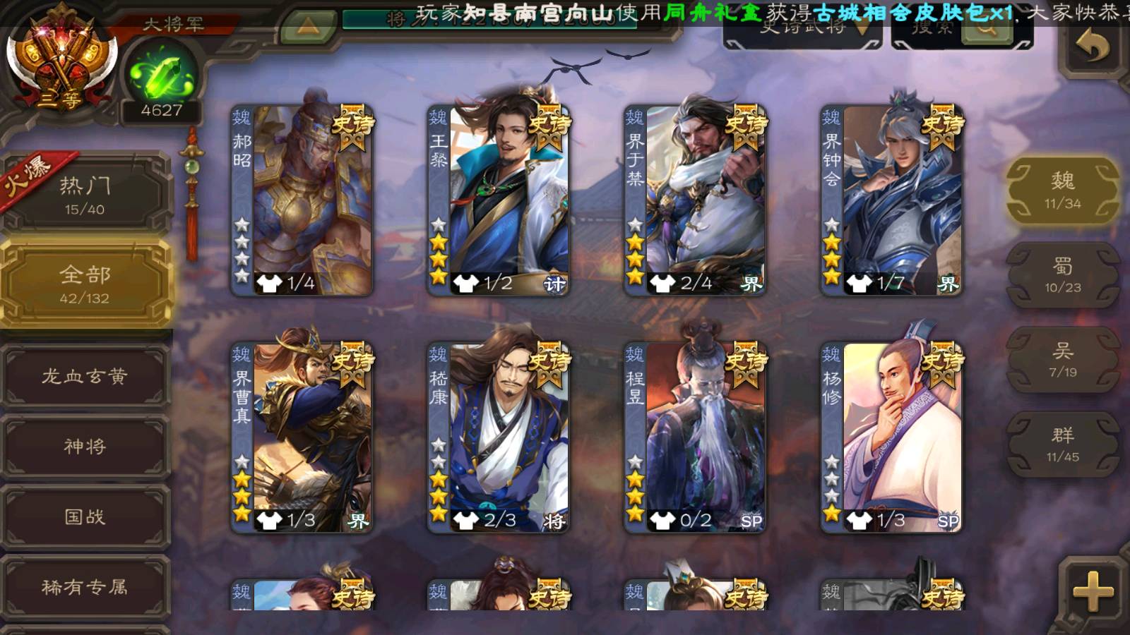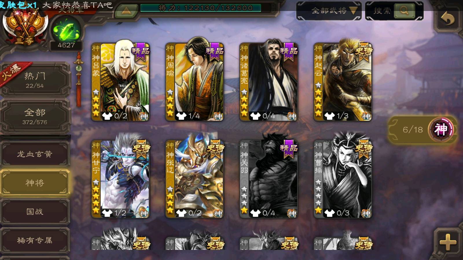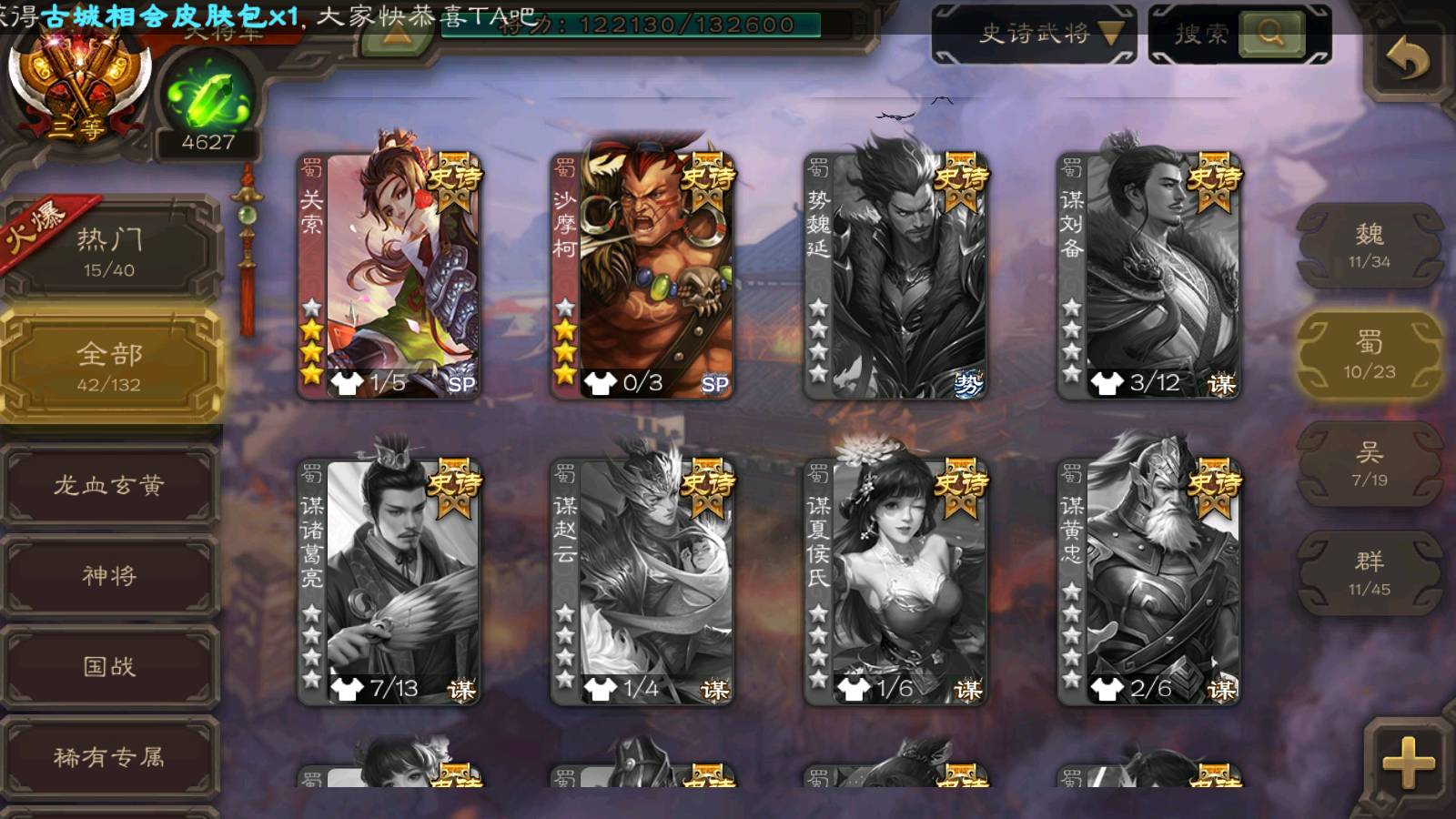 商品编号22492 全部皮肤386,动态皮肤26,全部武将372,排位武将96,国战武将93,史诗武将42,界钟会回廊,界徐盛回廊,心愿积分9.7k,金票15.4w,将魂4.6k