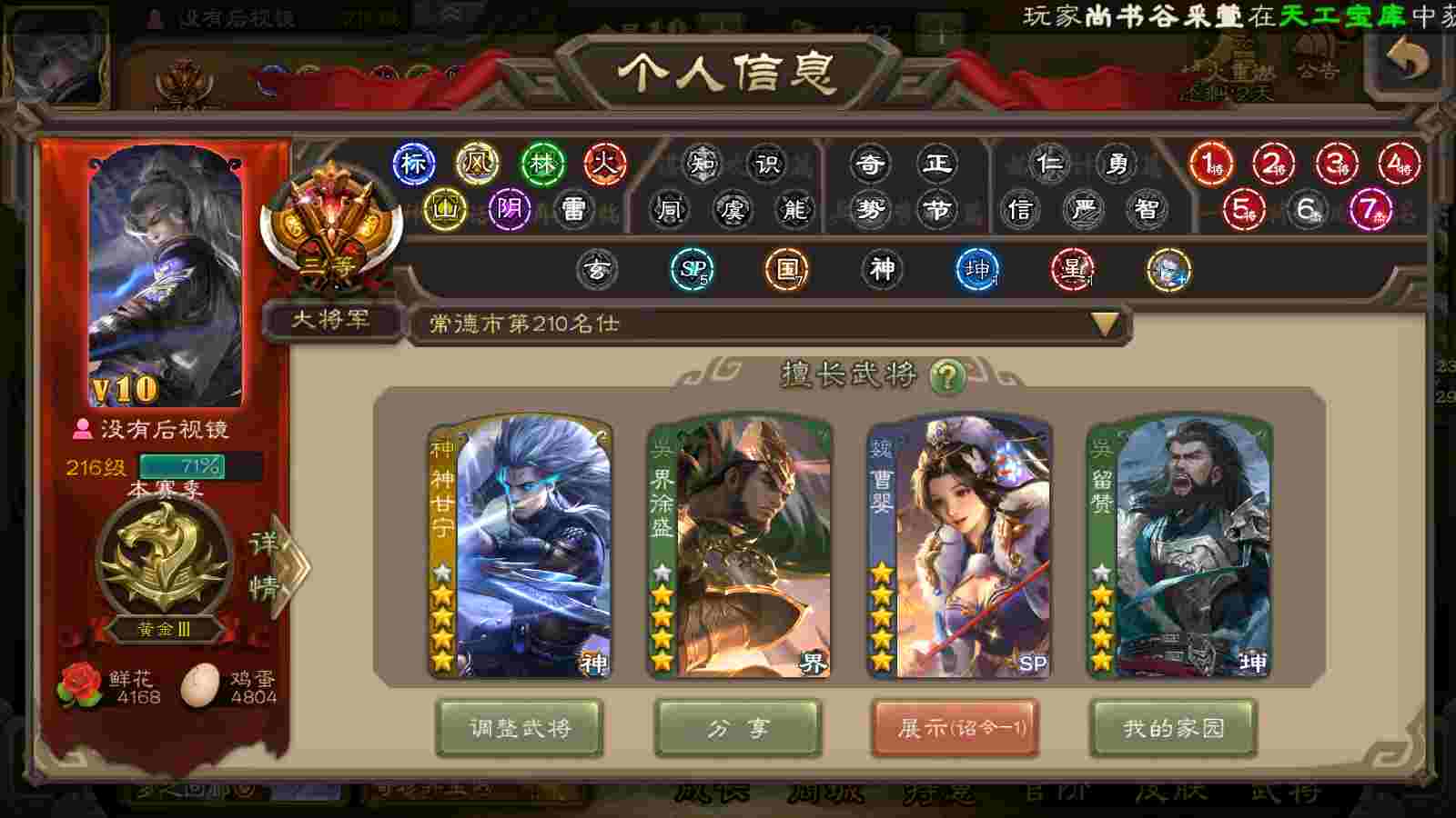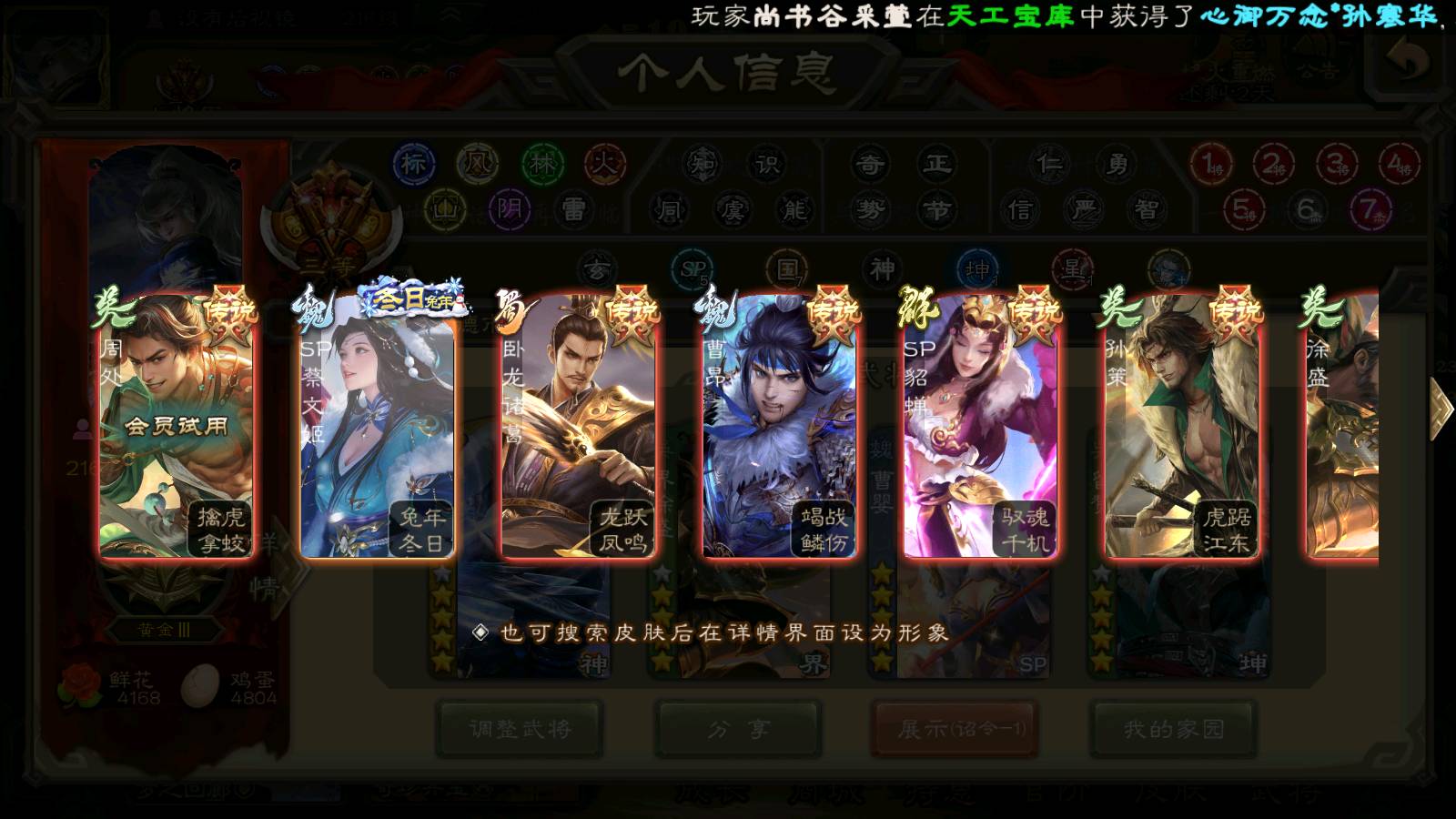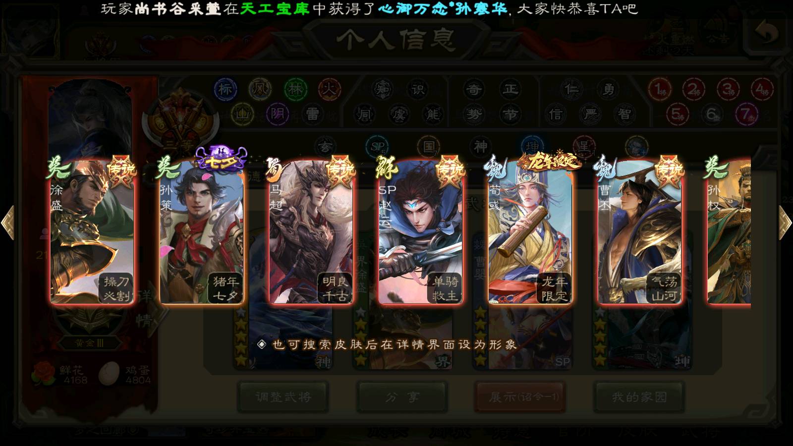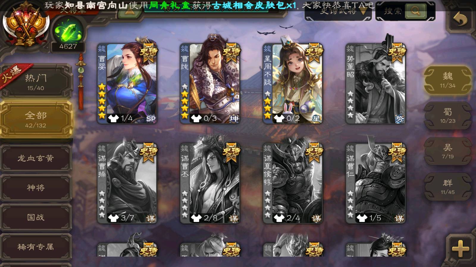 商品编号22492 全部皮肤386,动态皮肤26,全部武将372,排位武将96,国战武将93,史诗武将42,界钟会回廊,界徐盛回廊,心愿积分9.7k,金票15.4w,将魂4.6k
