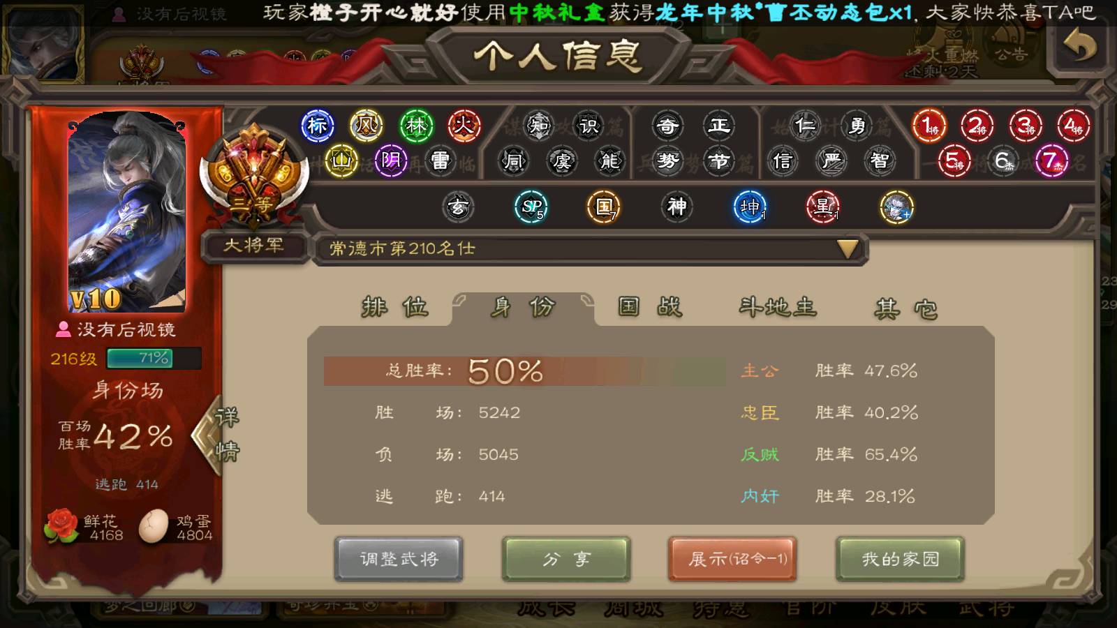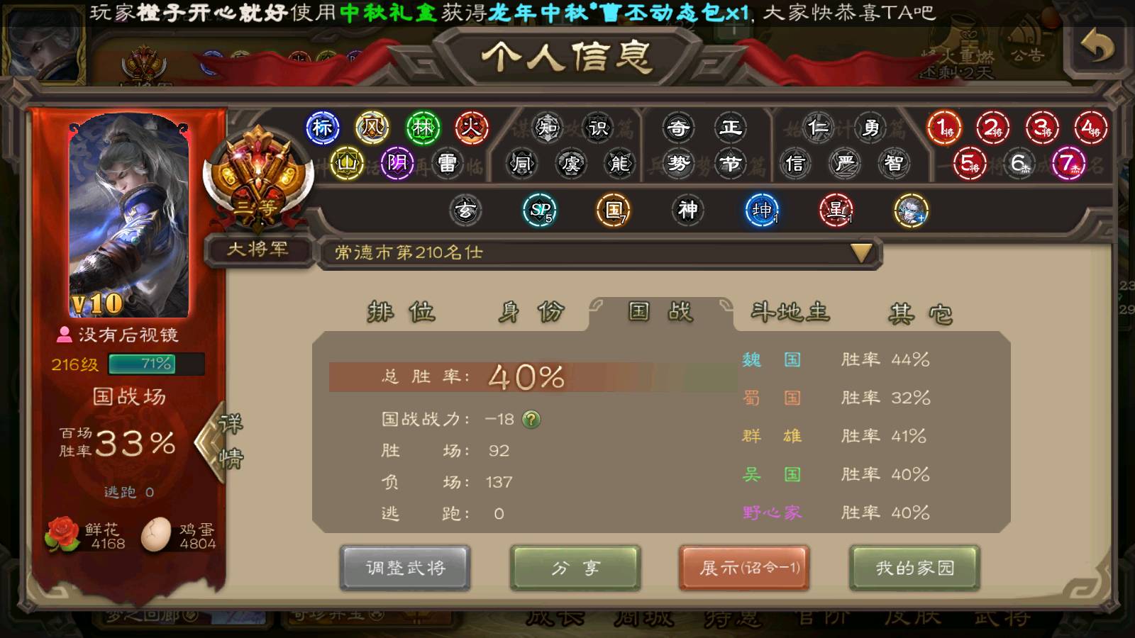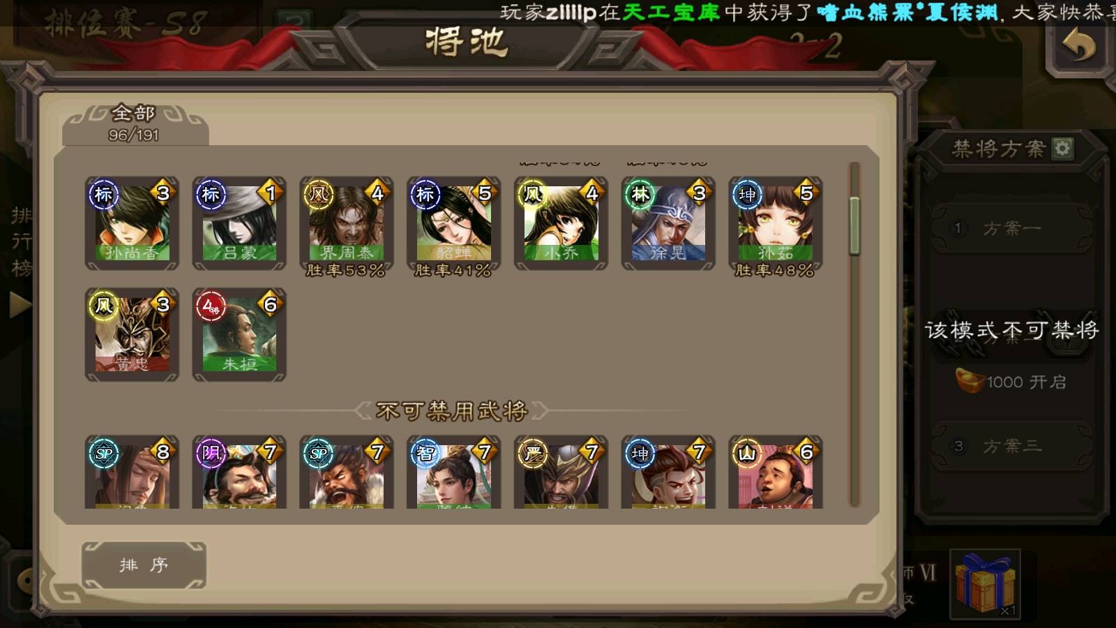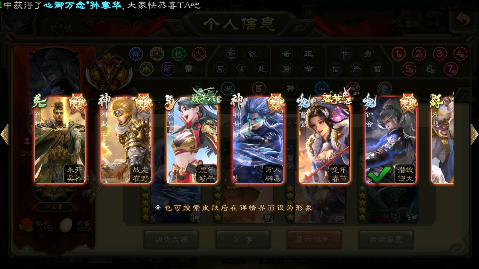 商品编号22492 全部皮肤386,动态皮肤26,全部武将372,排位武将96,国战武将93,史诗武将42,界钟会回廊,界徐盛回廊,心愿积分9.7k,金票15.4w,将魂4.6k