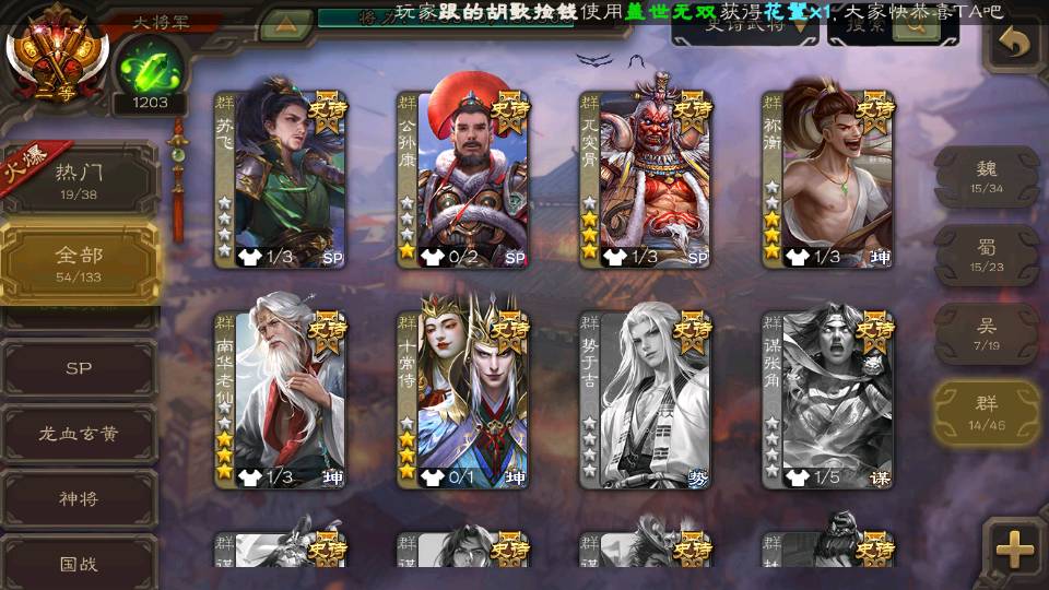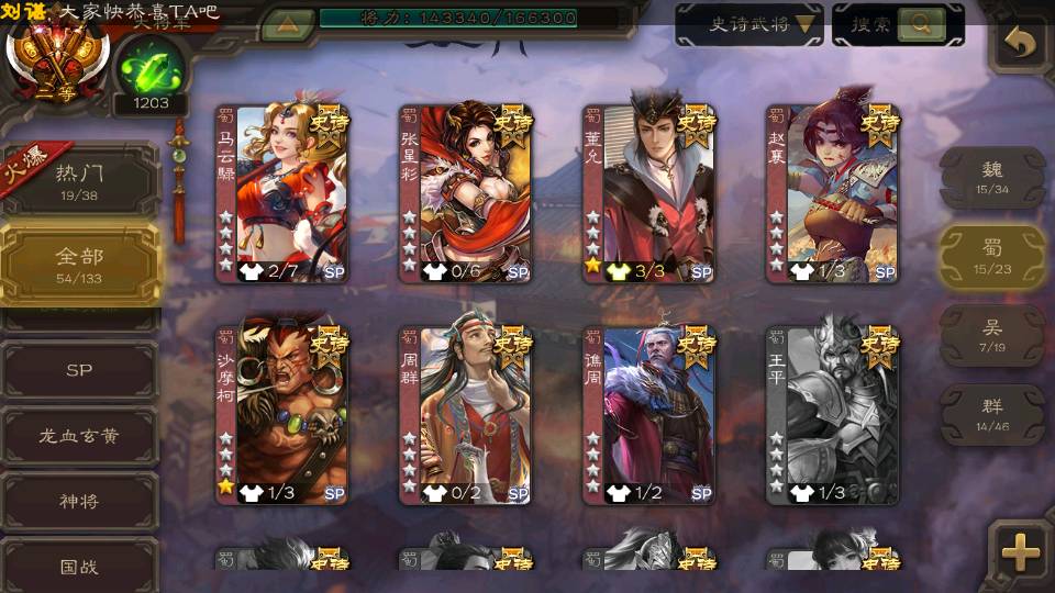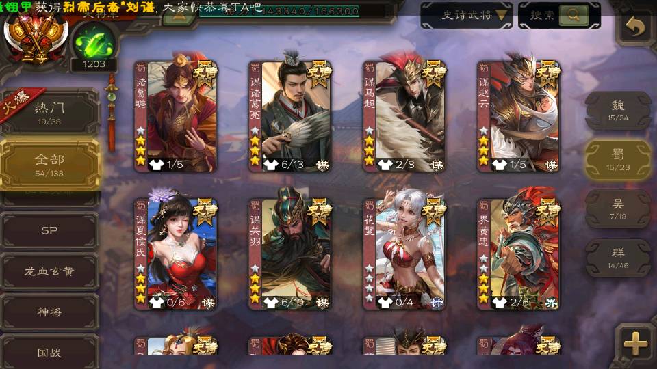 (蜀国):界黄忠,周群,谋诸葛亮,谋关羽,诸葛瞻,谋赵云,花鬘,沙摩柯,谋夏侯氏,谯周,谋马超,张星彩,马云騄,董允,赵襄