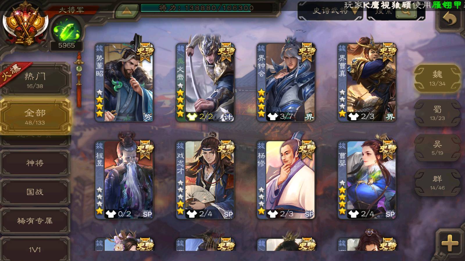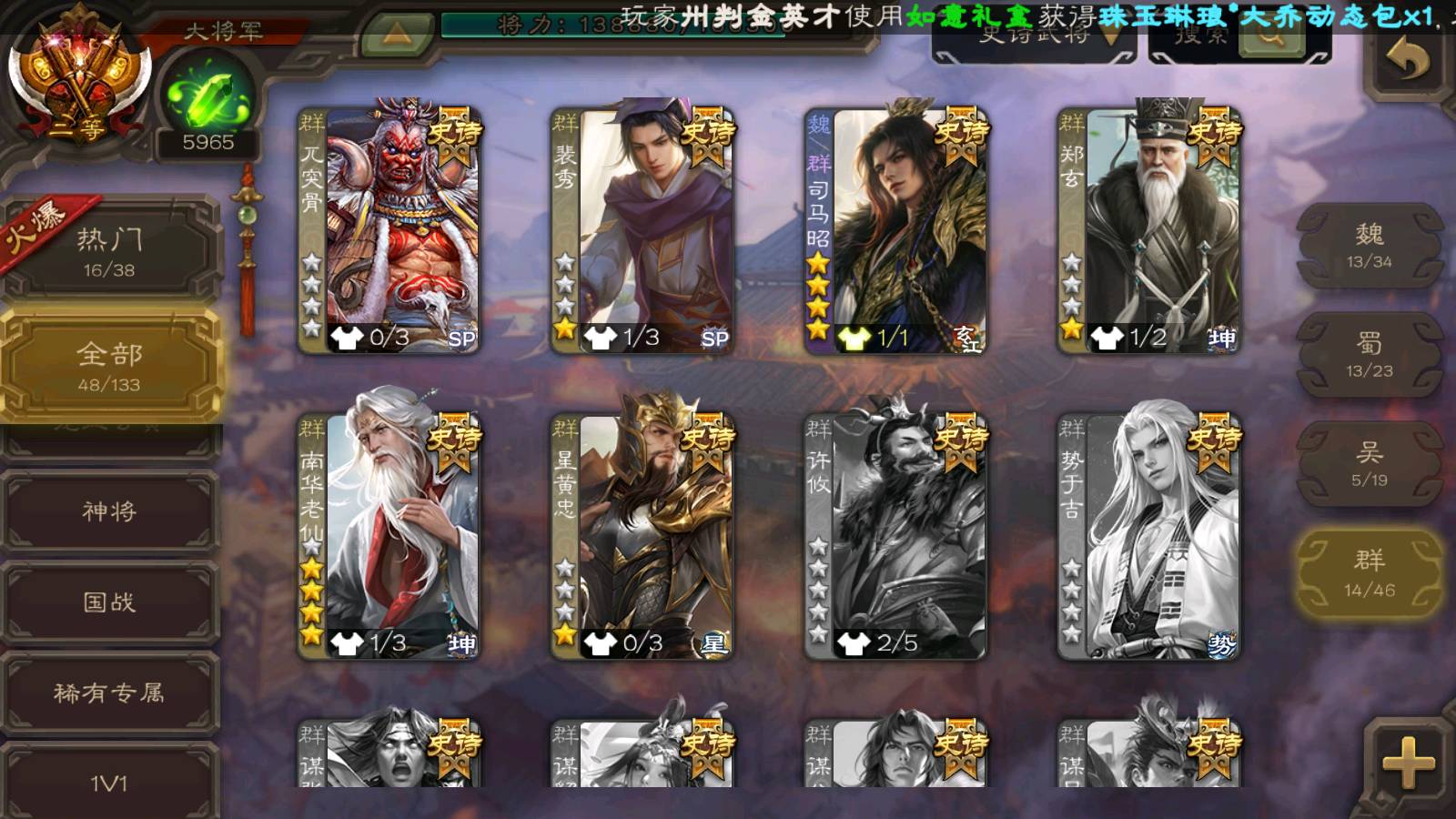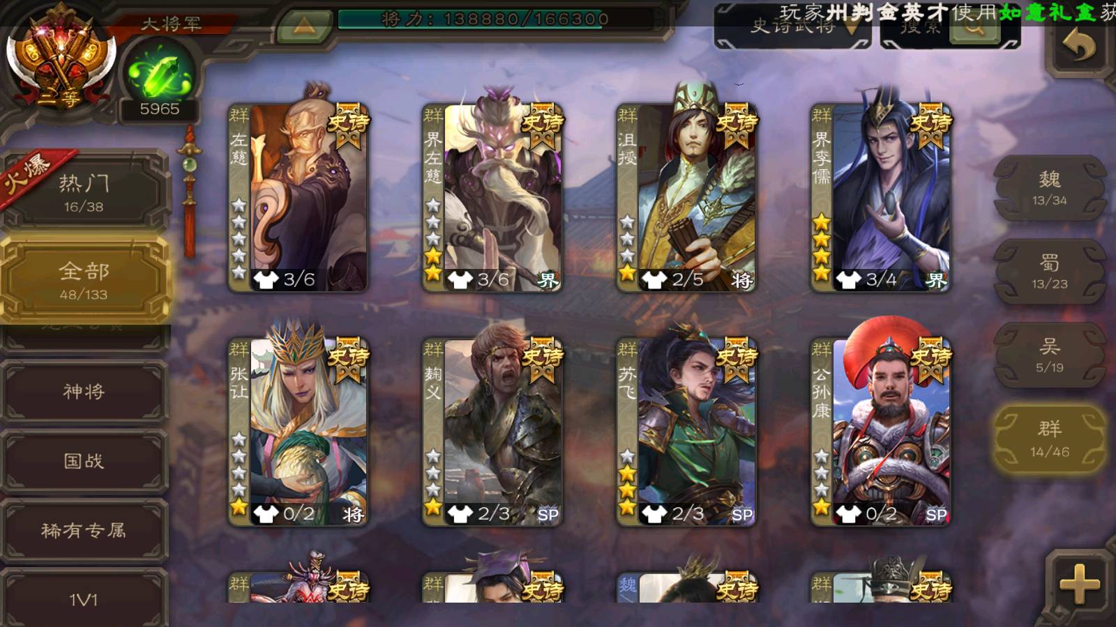 (群雄):界左慈,南华老仙,麴义,司马昭,张让,界李儒,苏飞,裴秀,公孙康,郑玄,星黄忠,左慈,沮授,兀突骨