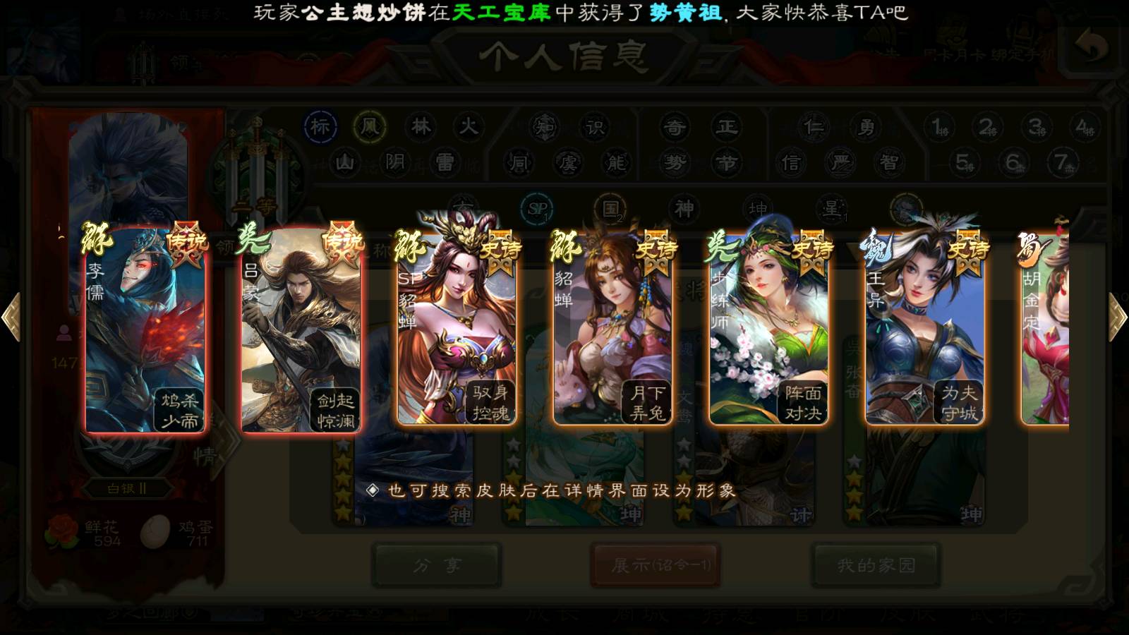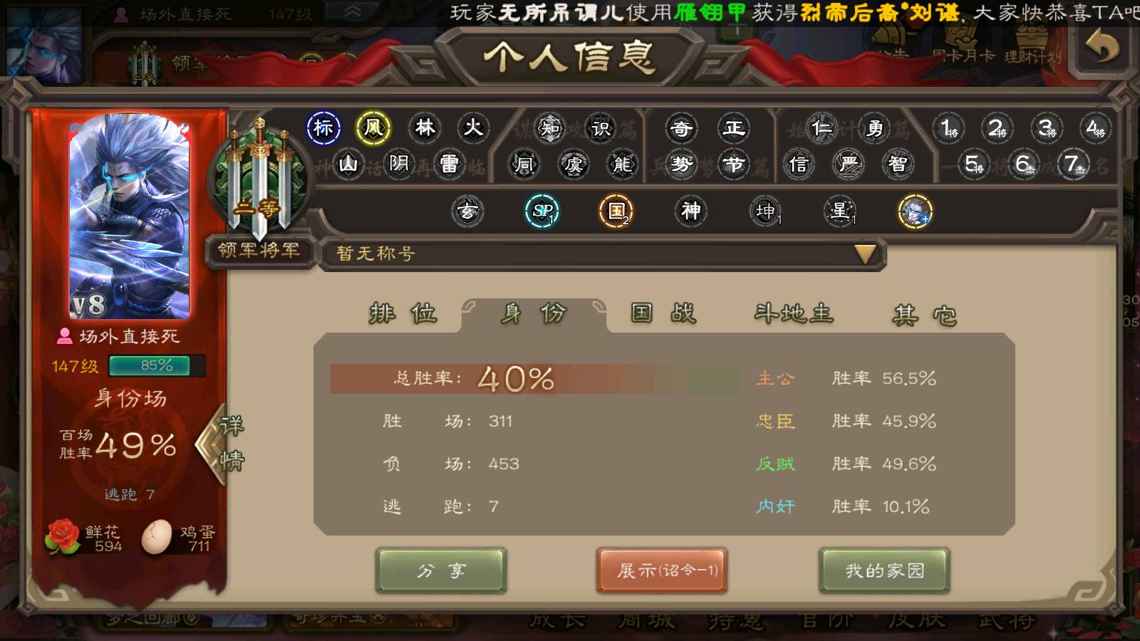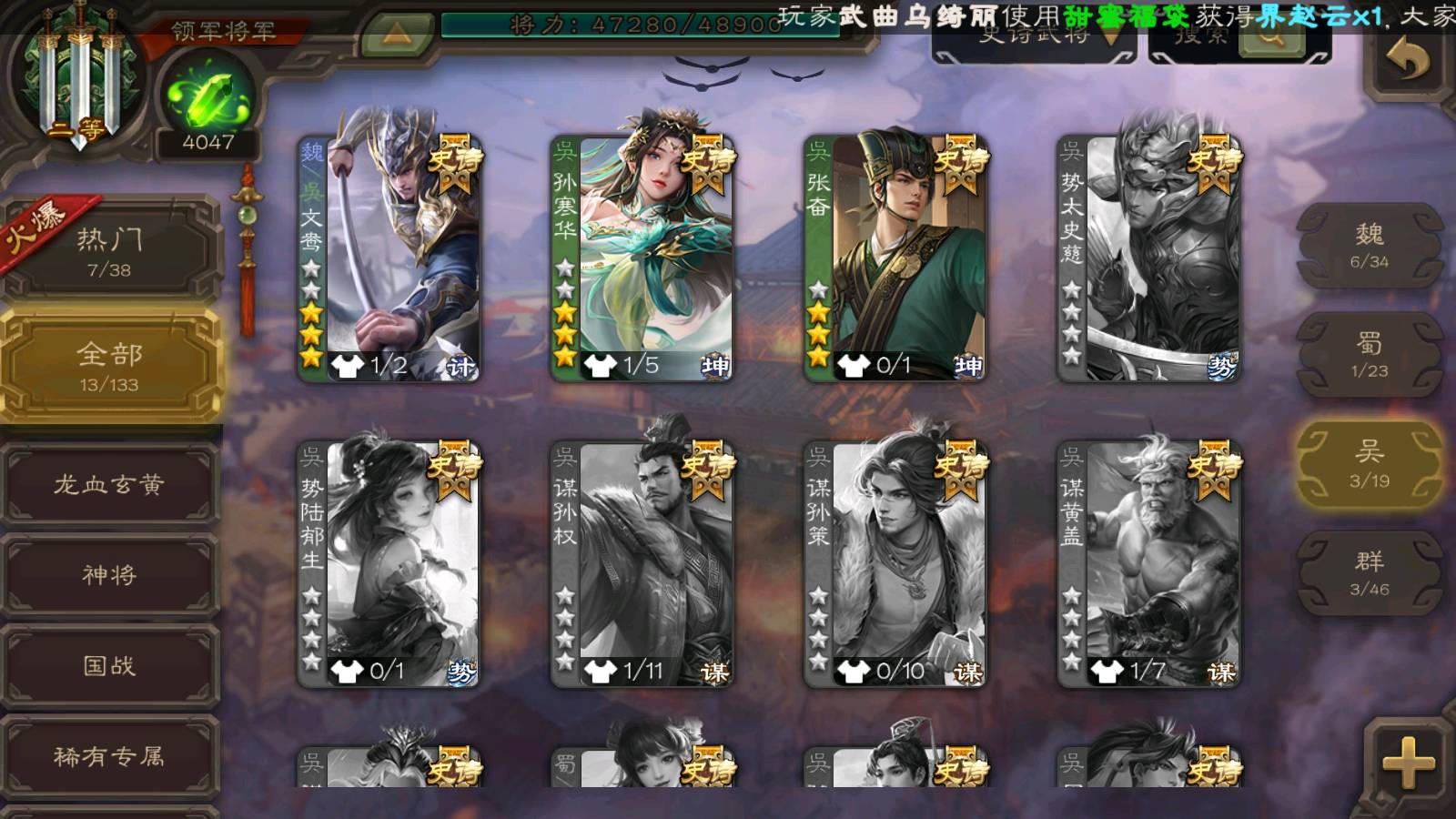 商品编号22515 全部皮肤189,动态皮肤8,全部武将219,排位武将65,国战武将69,史诗武将13,文鸯新回廊,孙寒华动皮,将魂4k