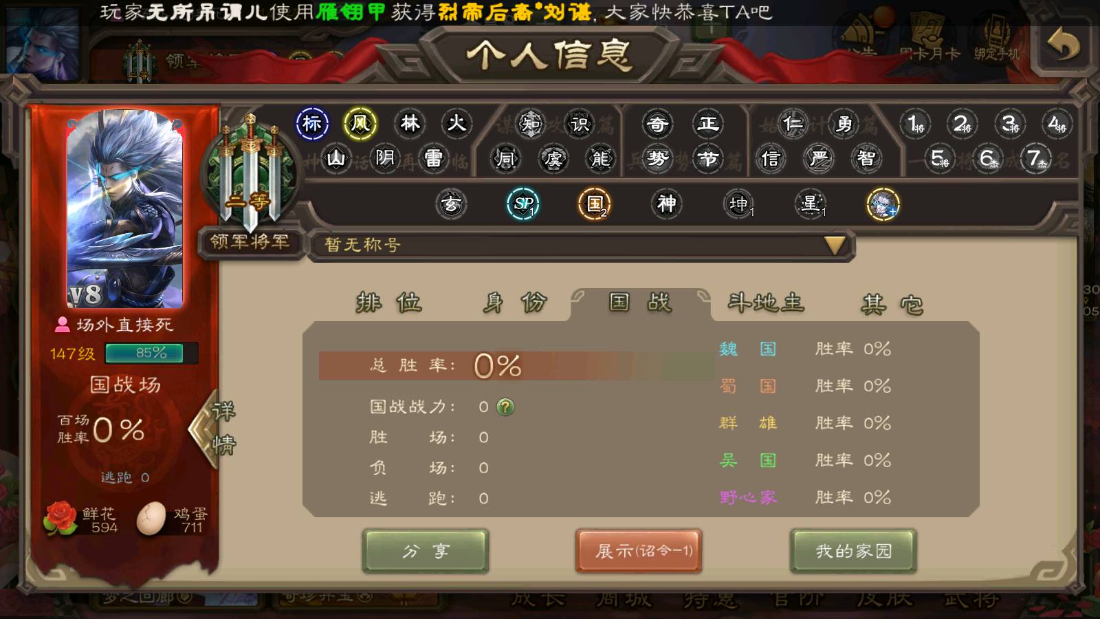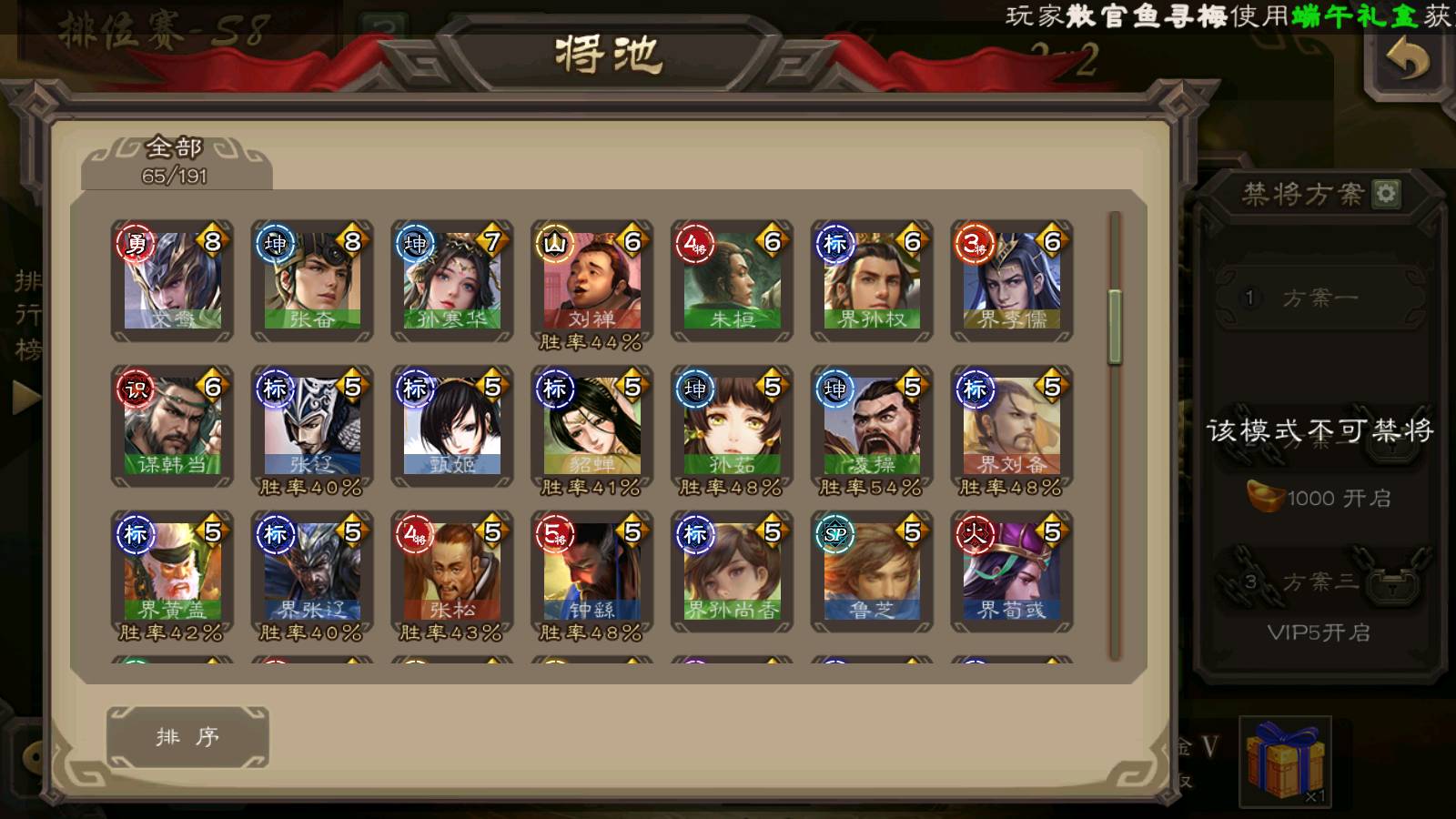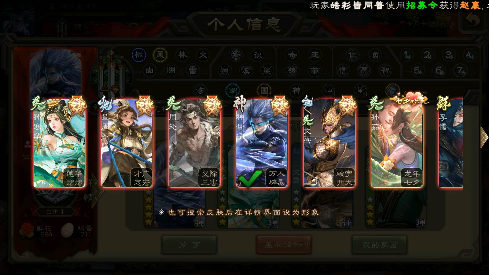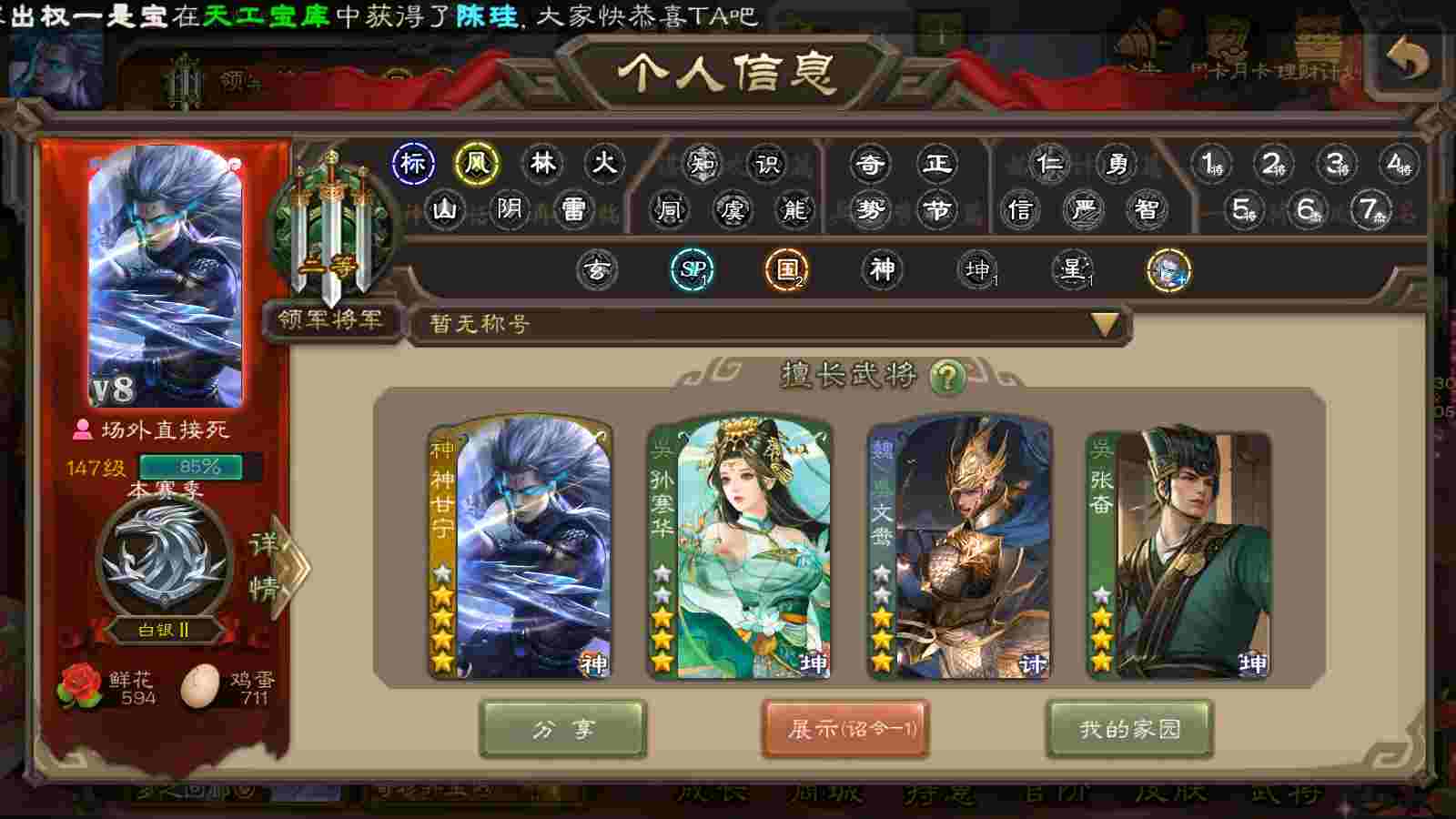 商品编号22515 全部皮肤189,动态皮肤8,全部武将219,排位武将65,国战武将69,史诗武将13,文鸯新回廊,孙寒华动皮,将魂4k