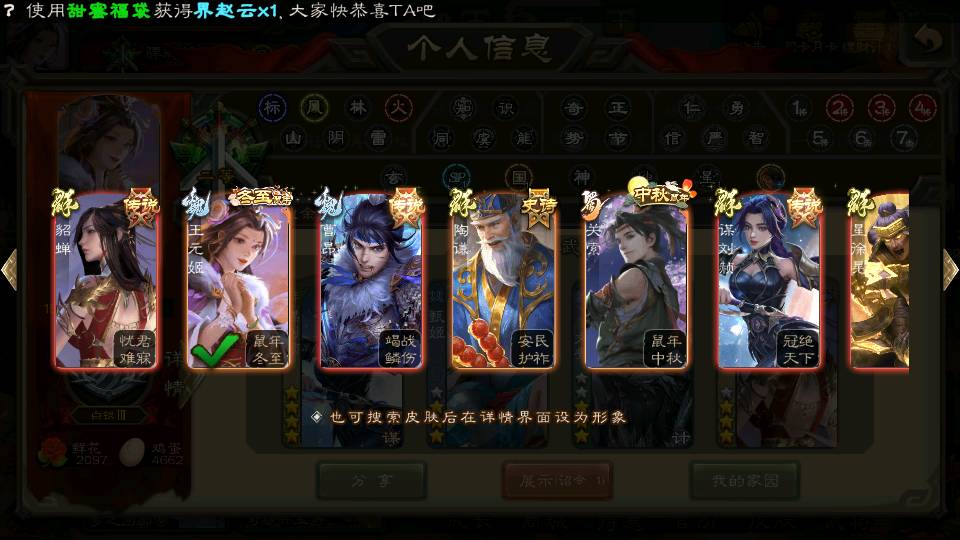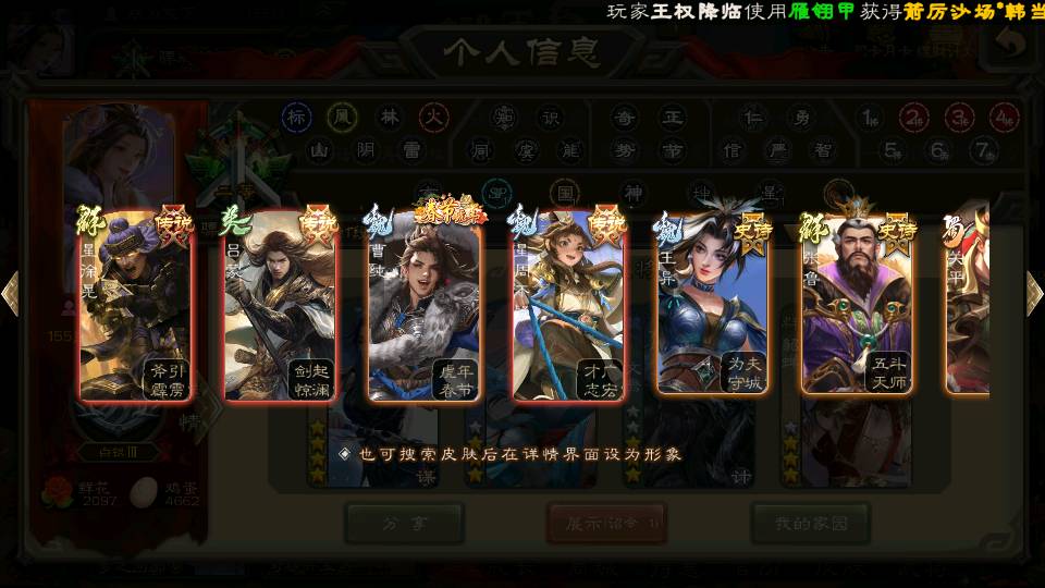 商品编号22522 全部皮肤279,动态皮肤17,全部武将267,排位武将94,国战武将75,史诗武将28,文鸯动皮