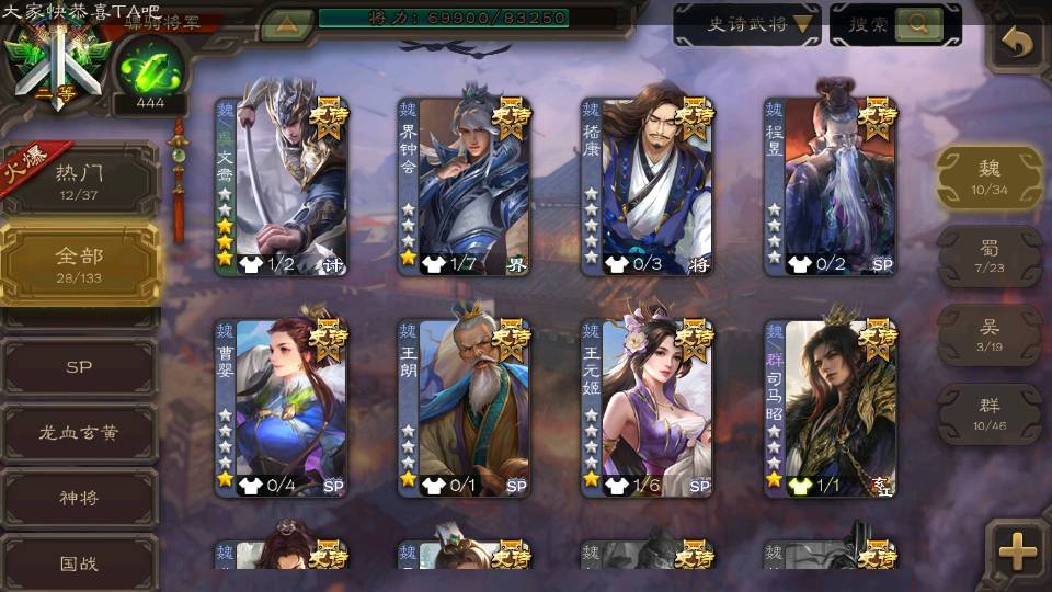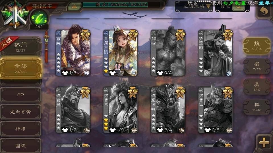 (魏国):曹婴,王元姬,文鸯,界钟会,王朗,星周不疑,程昱,曹纯,嵇康