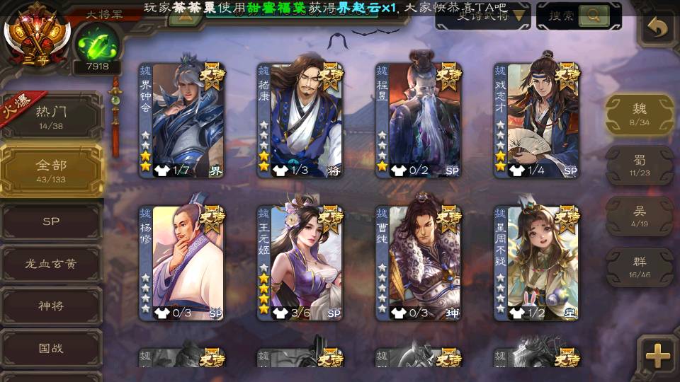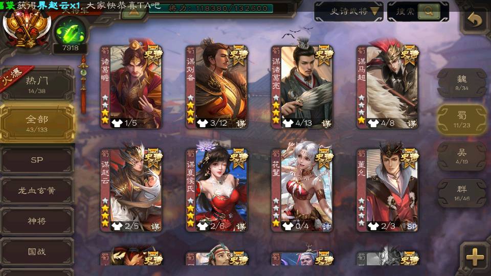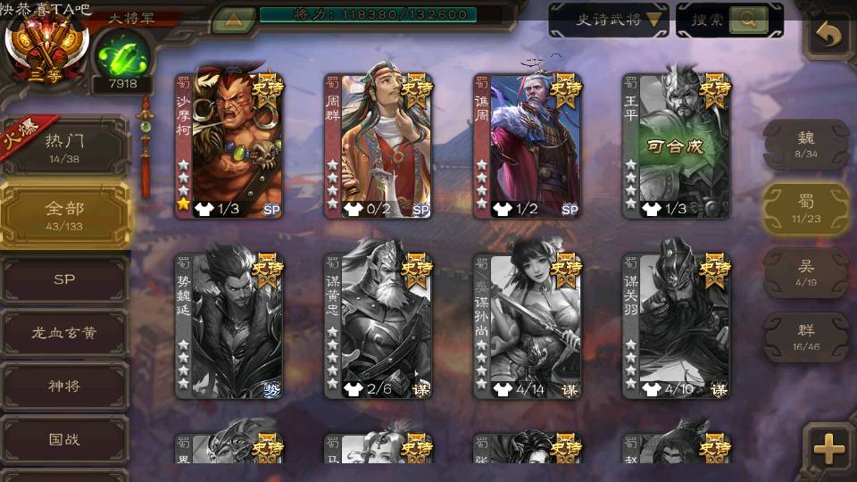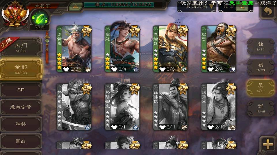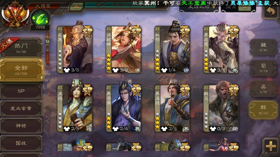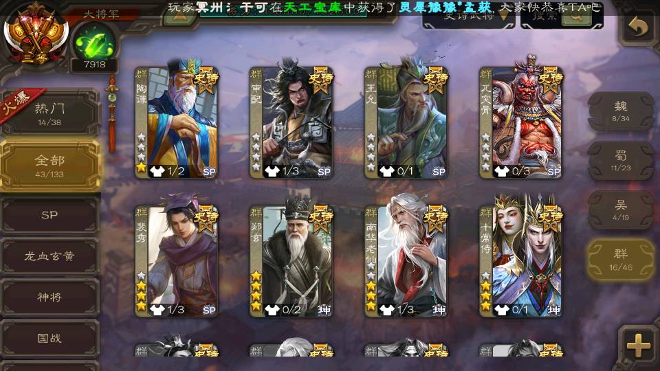 (群雄):杜预,界左慈,界沮授,南华老仙,麴义,十常侍,谋貂蝉,界李儒,裴秀,王允,郑玄,陶谦,审配,左慈,沮授,兀突骨