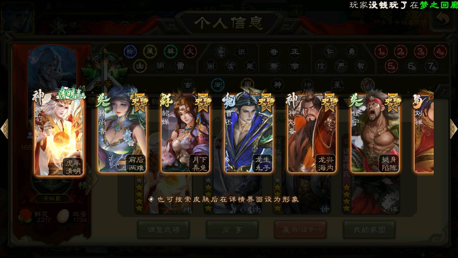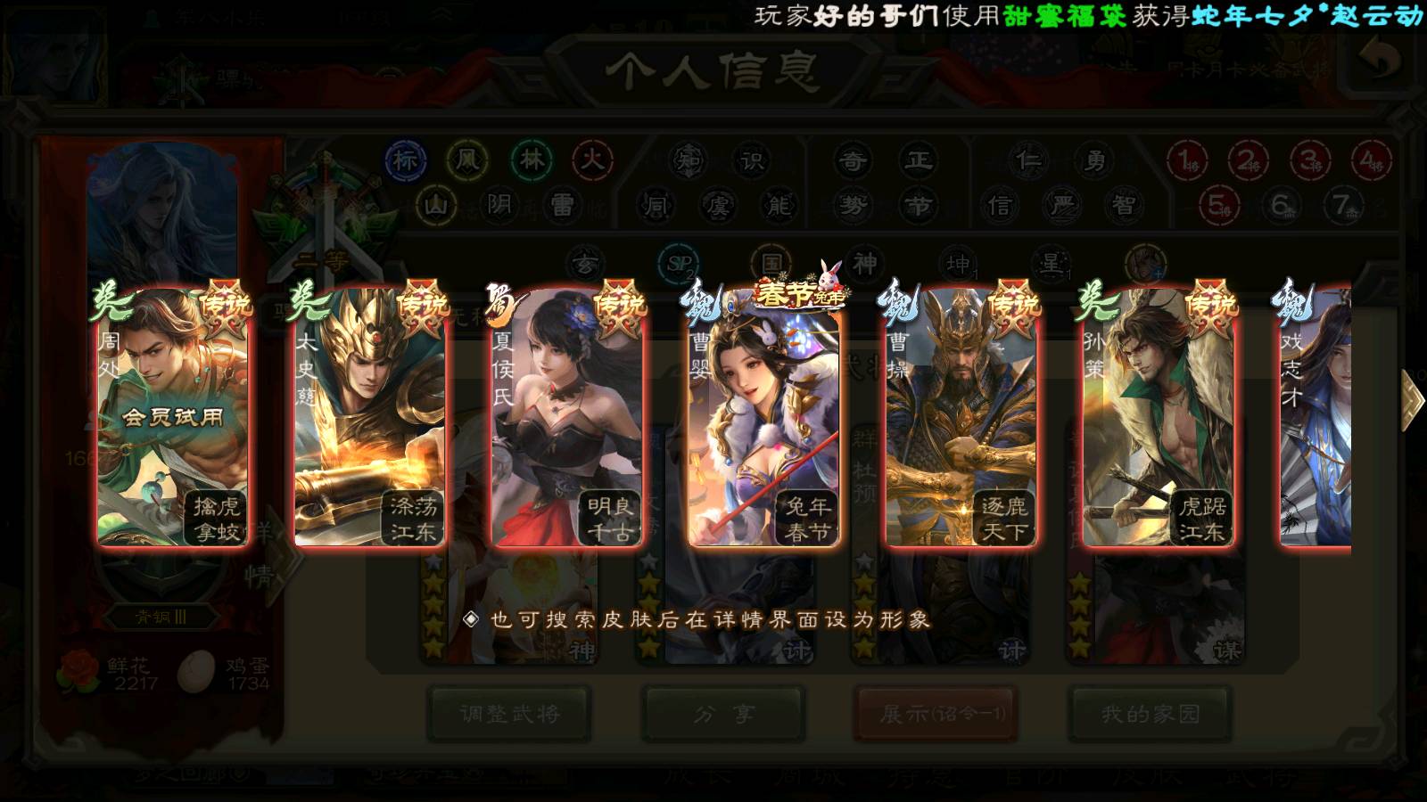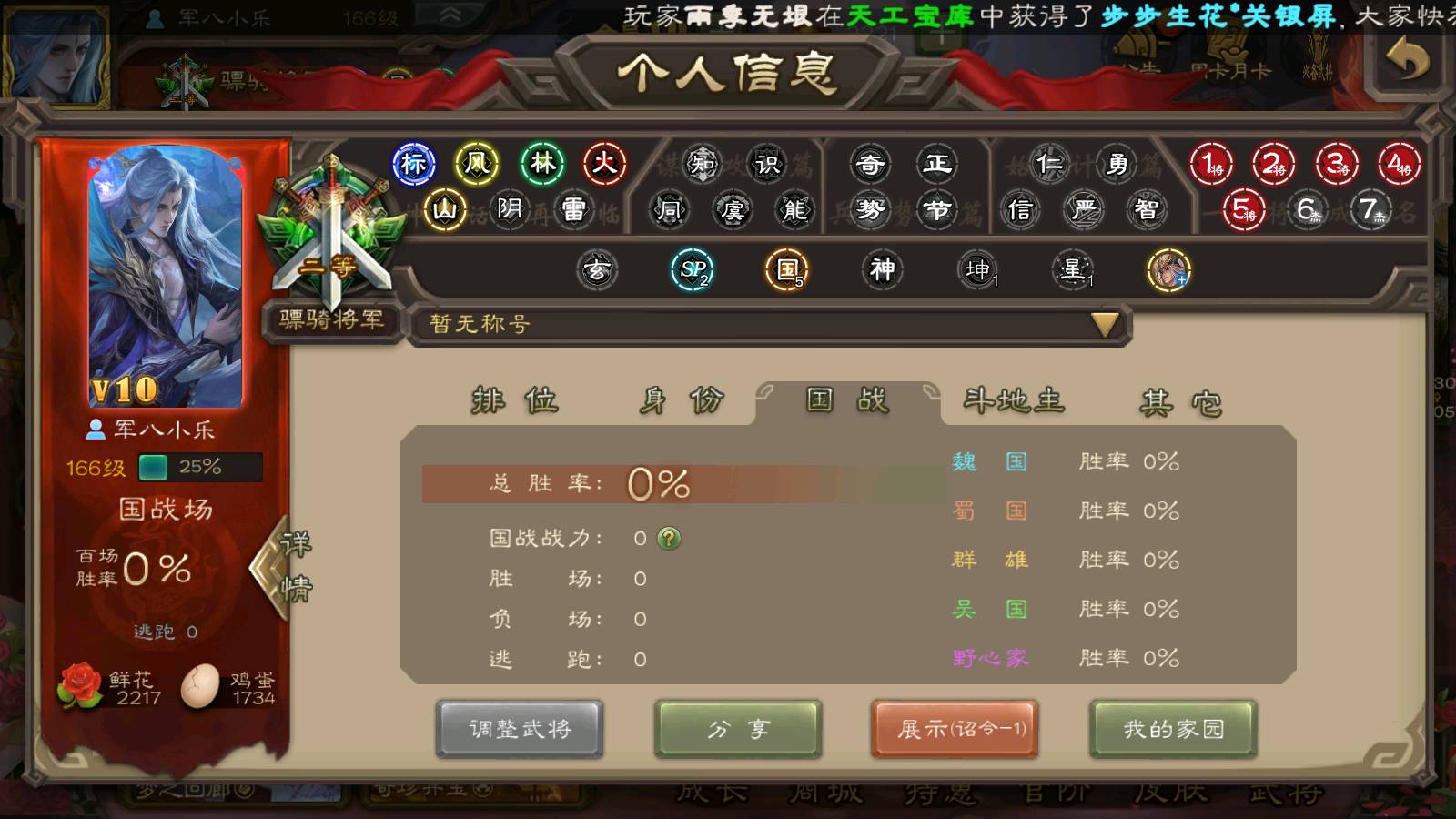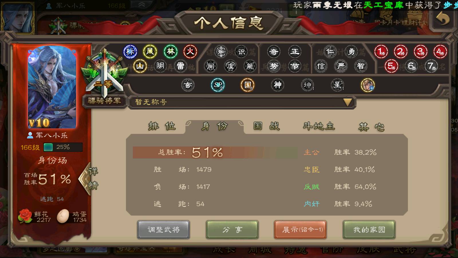 商品编号22538 全部皮肤287,动态皮肤12,全部武将301,排位武将85,国战武将86,史诗武将20,欢乐豆4.9w,心愿积分9.7k