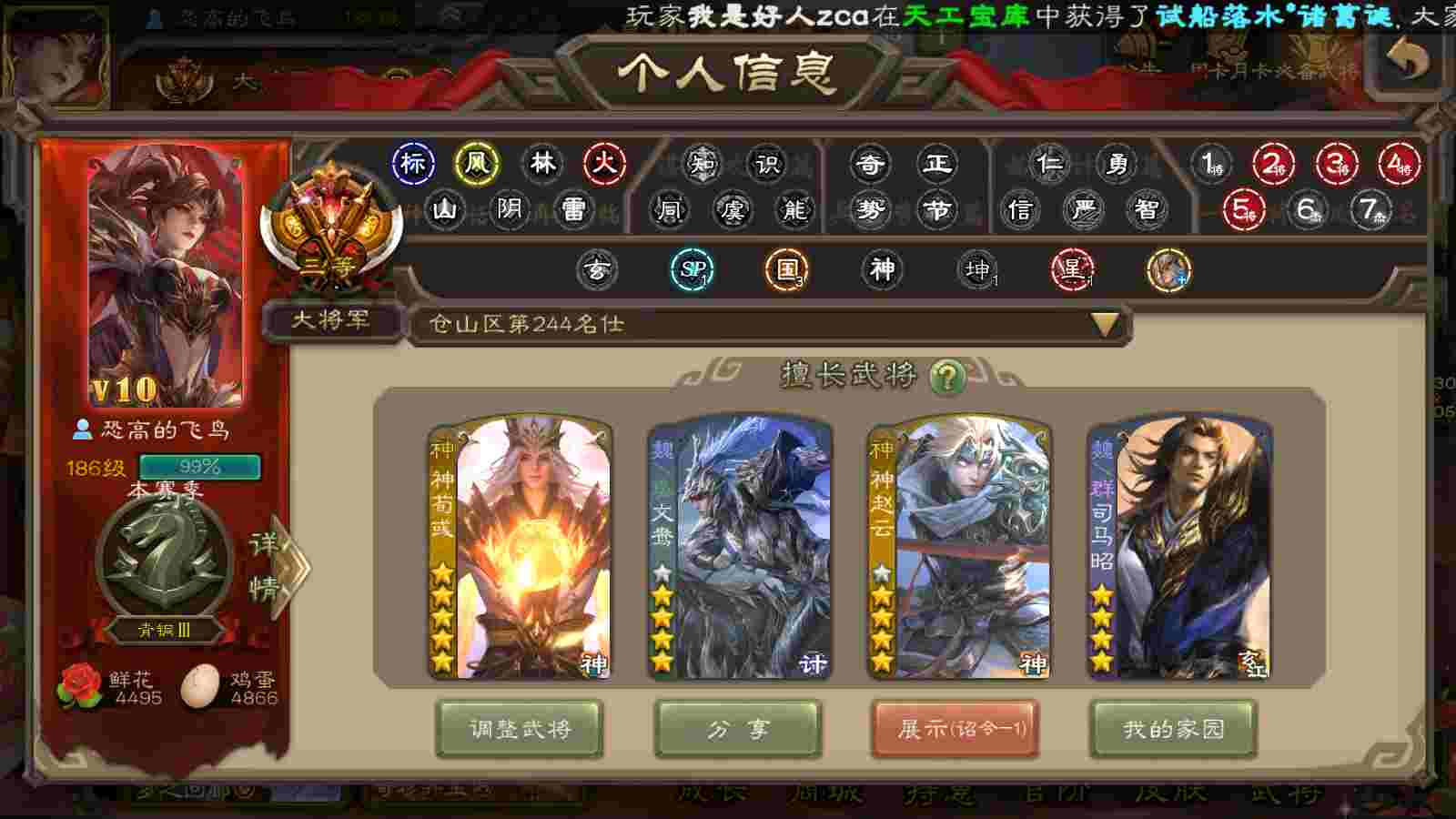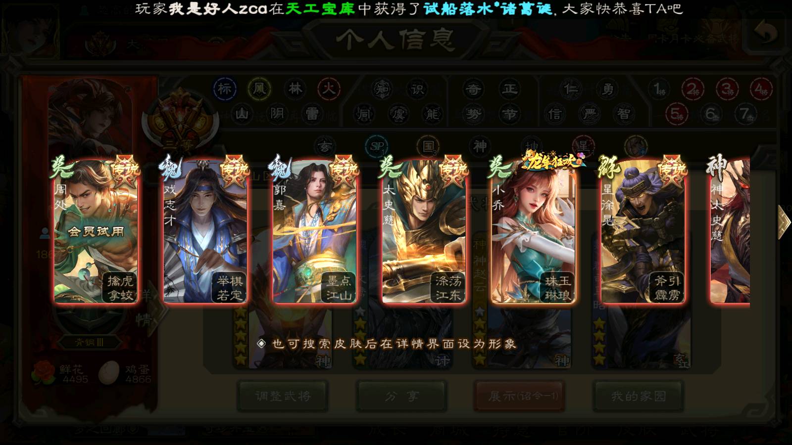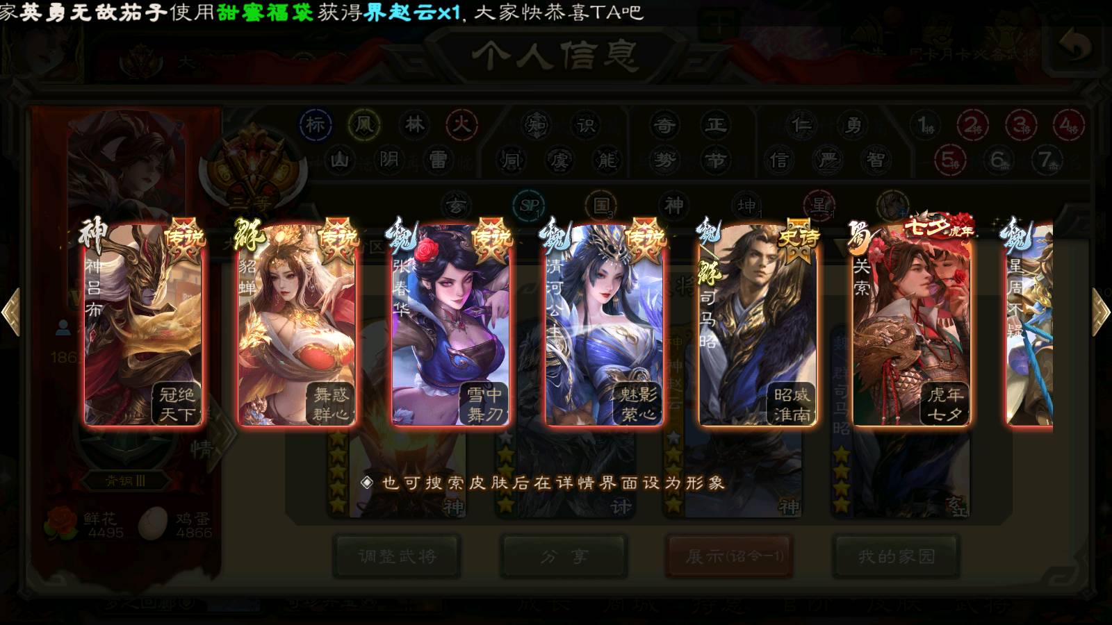 商品编号22540 全部皮肤425,动态皮肤34,全部武将324,排位武将94,国战武将88,史诗武将39,神赵云回廊,界钟会回廊,神荀彧动皮,文鸯动皮,谋貂蝉回廊,元宝1.8w,欢乐豆7.3w,宝珠19