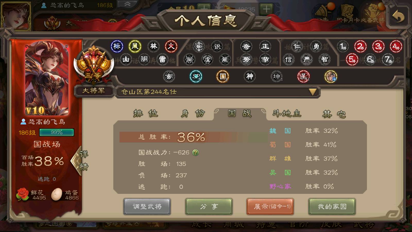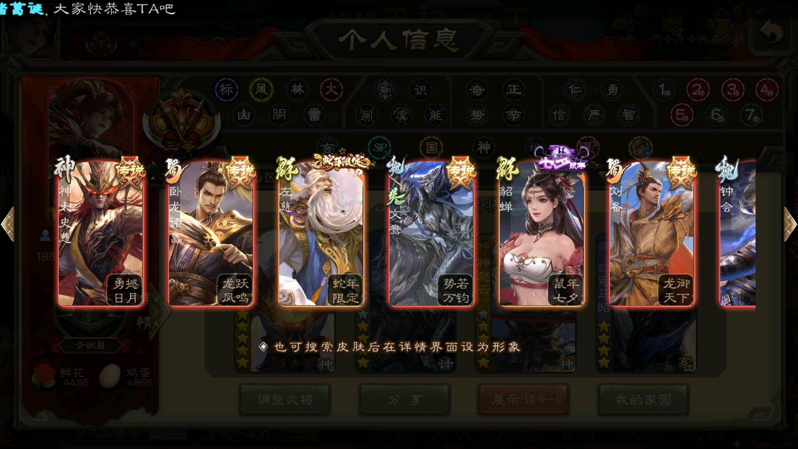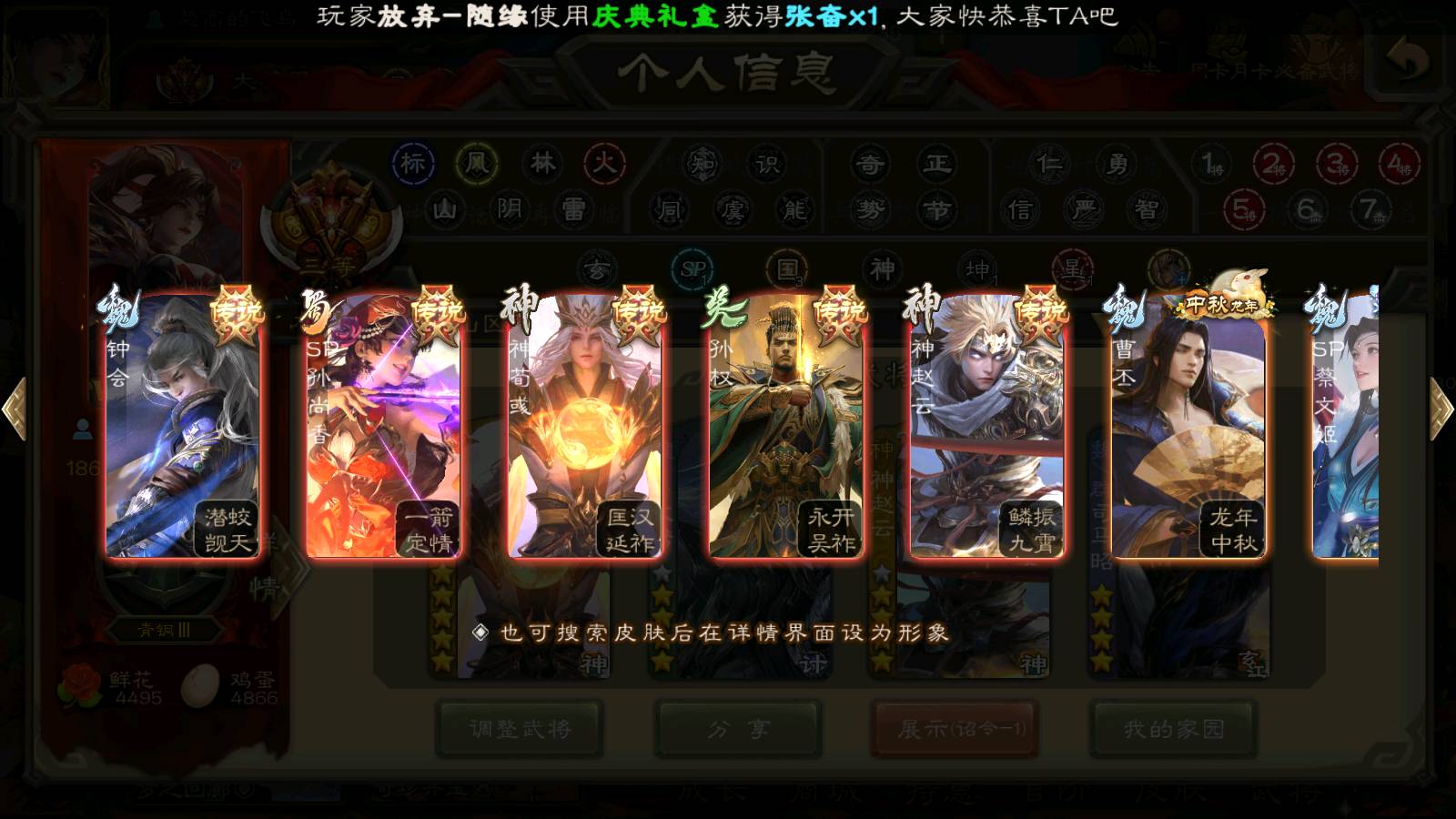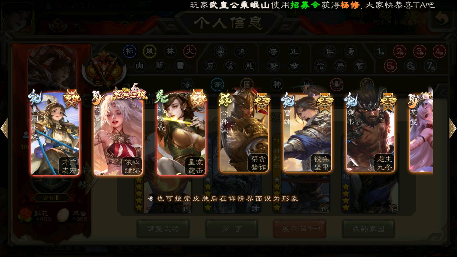 商品编号22540 全部皮肤425,动态皮肤34,全部武将324,排位武将94,国战武将88,史诗武将39,神赵云回廊,界钟会回廊,神荀彧动皮,文鸯动皮,谋貂蝉回廊,元宝1.8w,欢乐豆7.3w,宝珠19