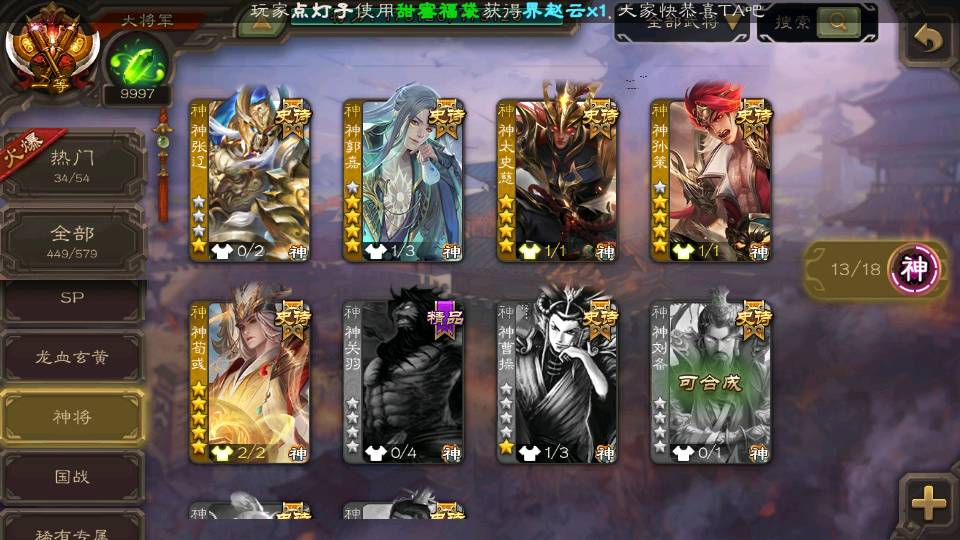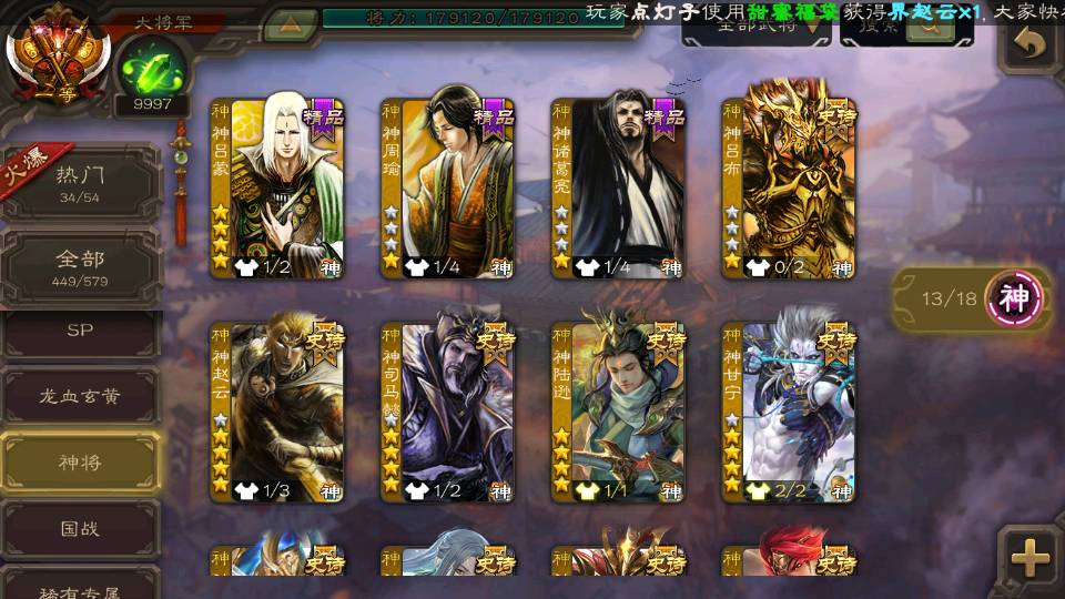 (神将):神荀彧,神郭嘉,神甘宁,神孙策,神司马懿,神太史慈,神陆逊,神赵云,神吕布,神张辽