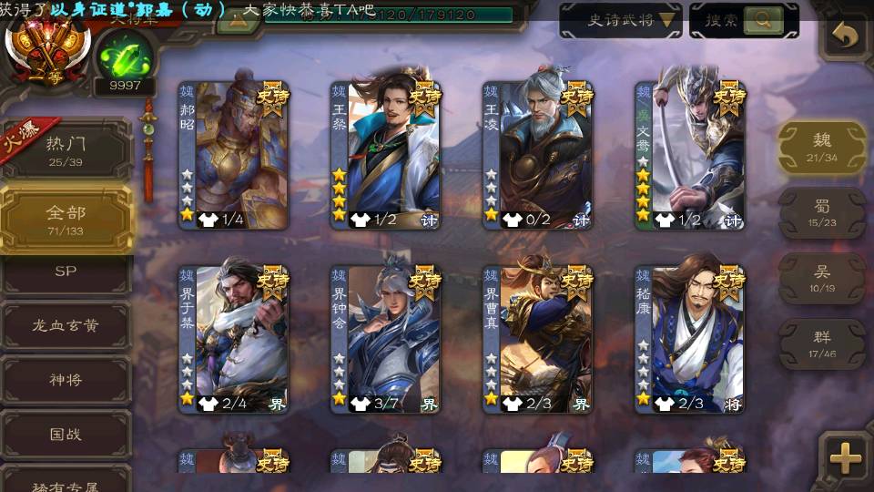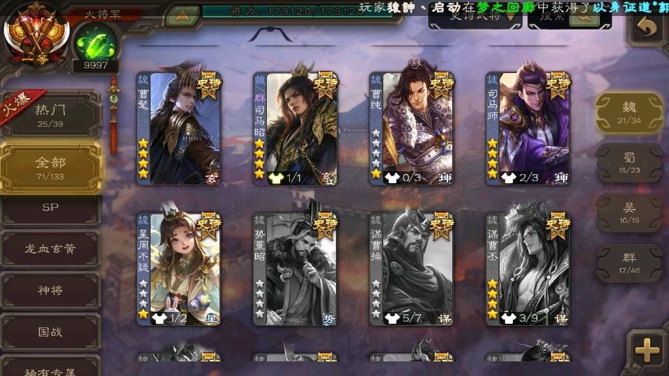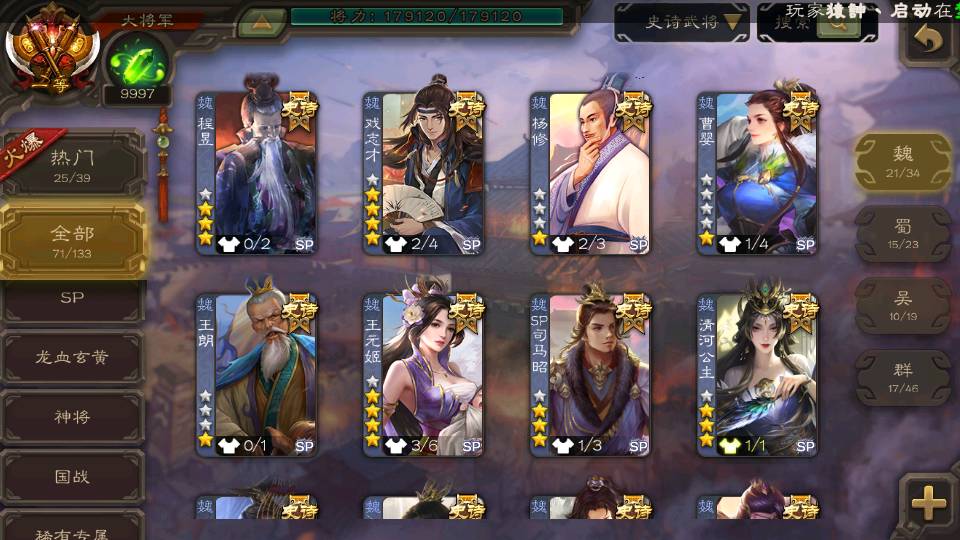 (魏国):曹婴,王元姬,文鸯,戏志才,界钟会,曹髦,SP司马昭,司马师,王朗,清河公主,界于禁,郝昭,王粲,界曹真,王凌,星周不疑,程昱,曹纯,杨修,嵇康