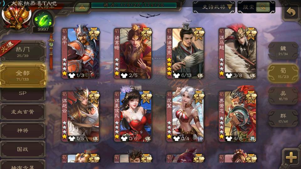 (蜀国):界黄忠,周群,谋诸葛亮,诸葛瞻,谋赵云,花鬘,沙摩柯,谋夏侯氏,谯周,谋马超,关索,王平,马云騄,董允,赵襄