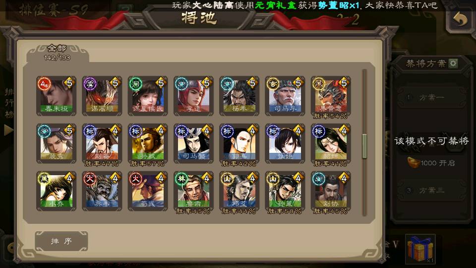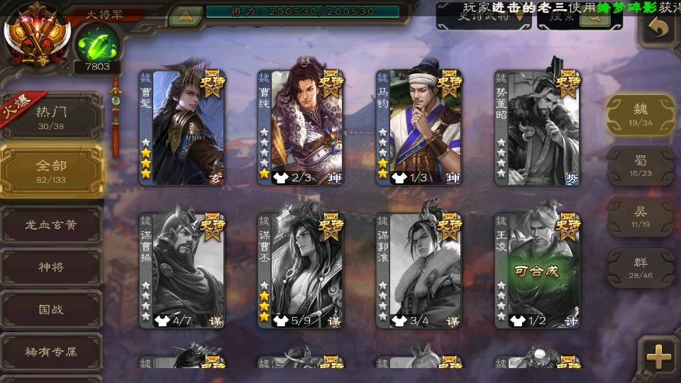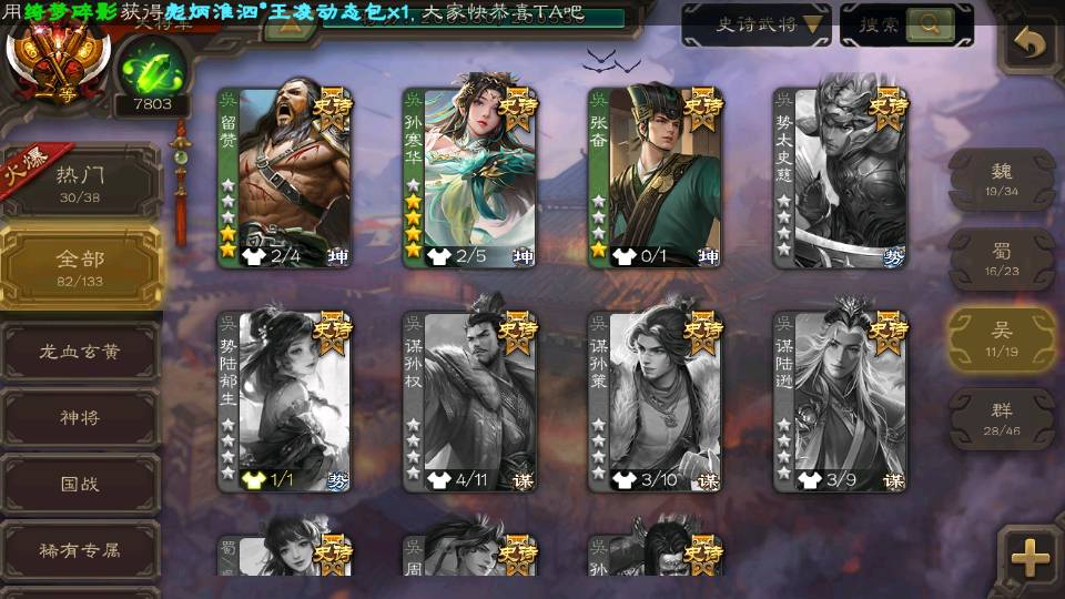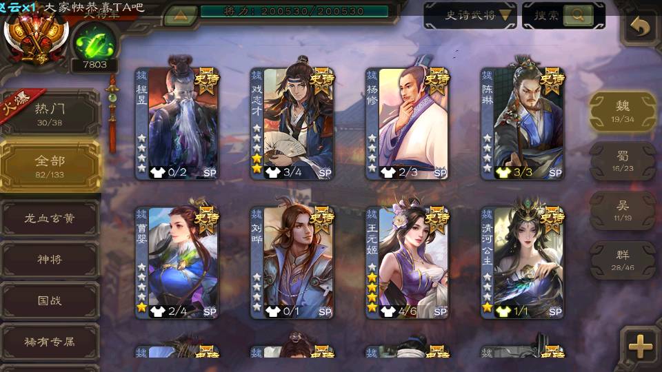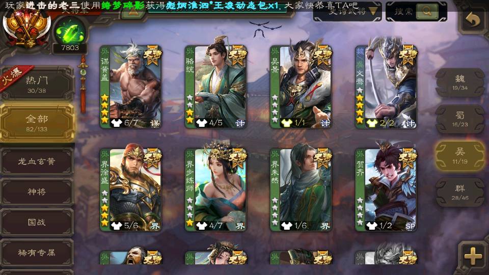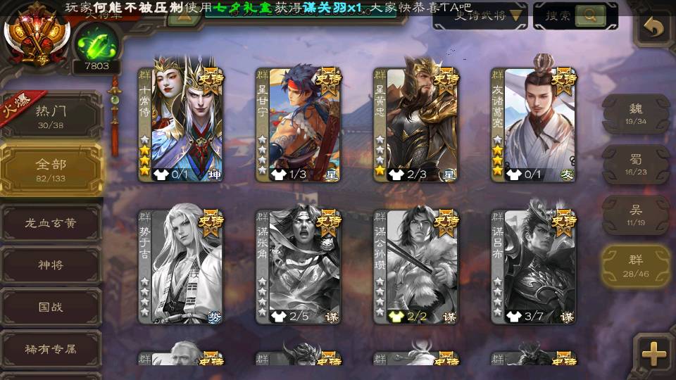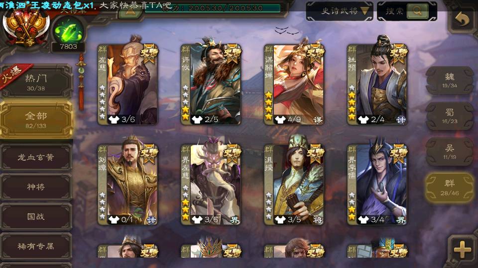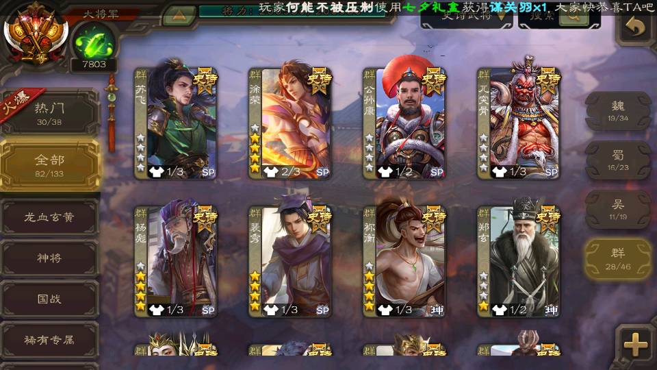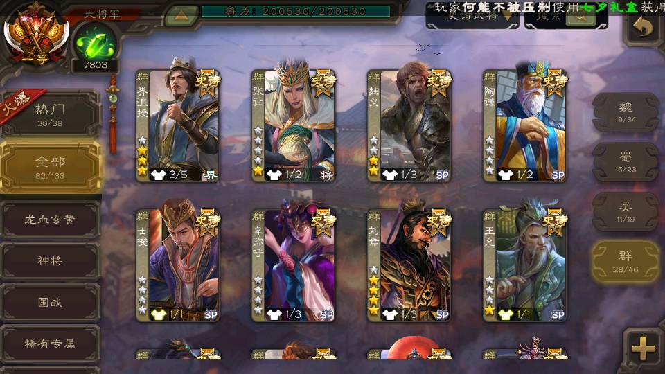 (群雄):刘焉,徐荣,杨彪,杜预,祢衡,友诸葛亮,界左慈,界沮授,麴义,许攸,十常侍,谋貂蝉,张让,界李儒,苏飞,星甘宁,裴秀,卑弥呼,士燮,王允,公孙康,刘璋,郑玄,陶谦,星黄忠,左慈,沮授,兀突骨