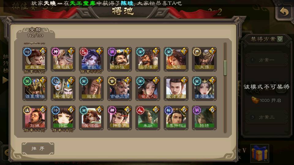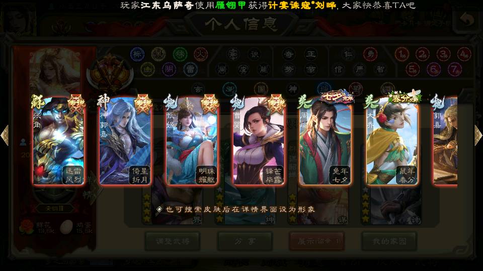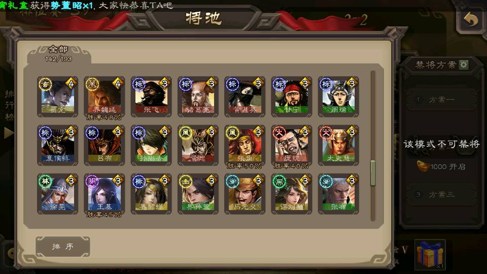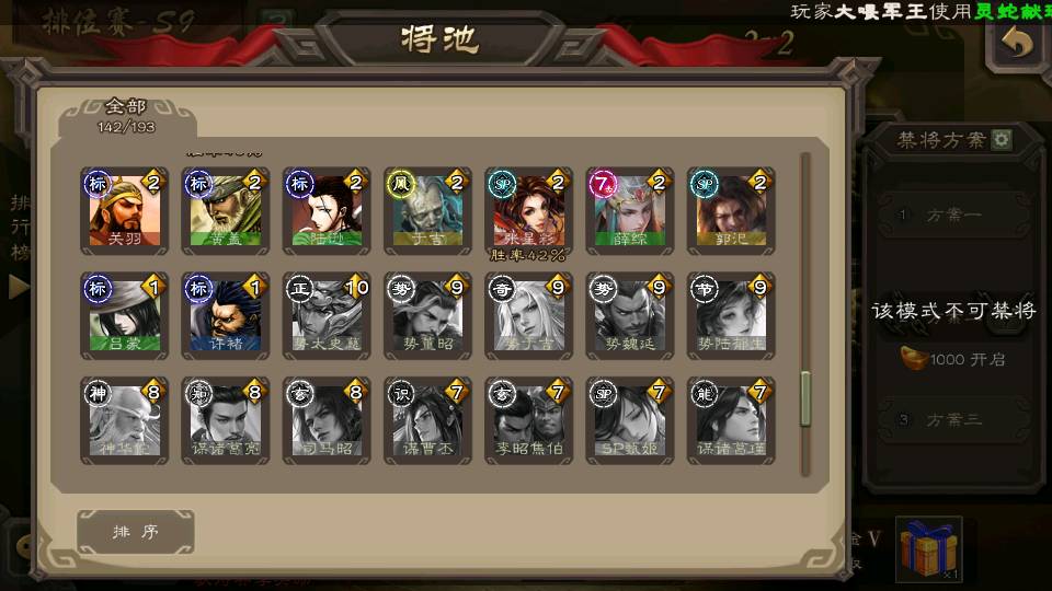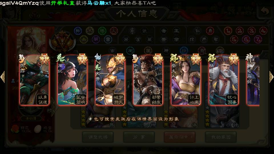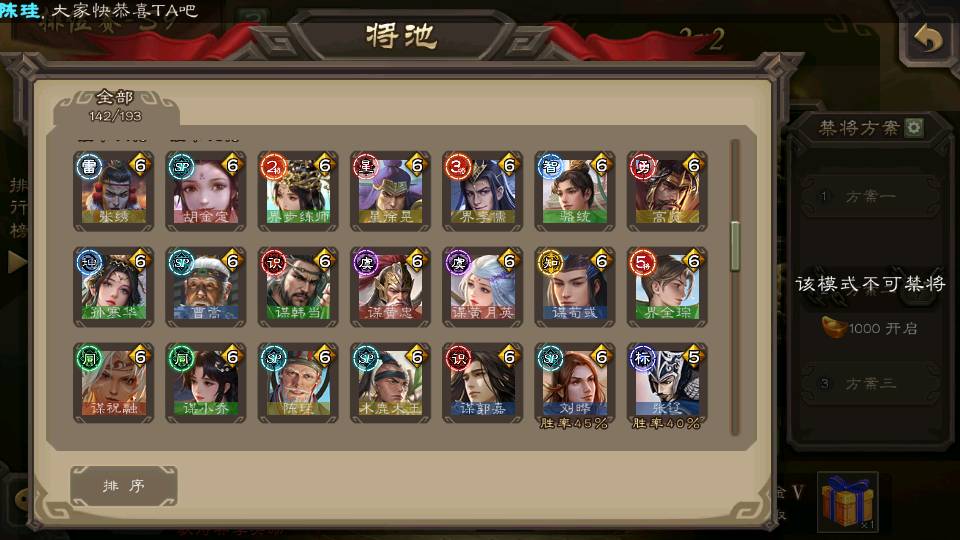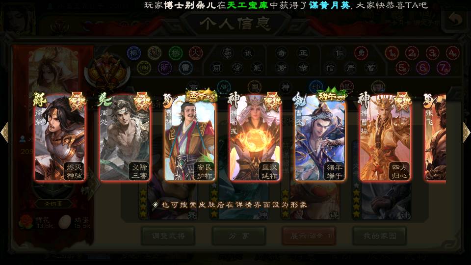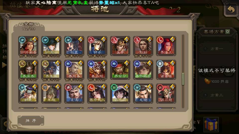 (群雄):刘焉,徐荣,杨彪,杜预,祢衡,友诸葛亮,界左慈,界沮授,麴义,许攸,十常侍,谋貂蝉,张让,界李儒,苏飞,星甘宁,裴秀,卑弥呼,士燮,王允,公孙康,刘璋,郑玄,陶谦,星黄忠,左慈,沮授,兀突骨