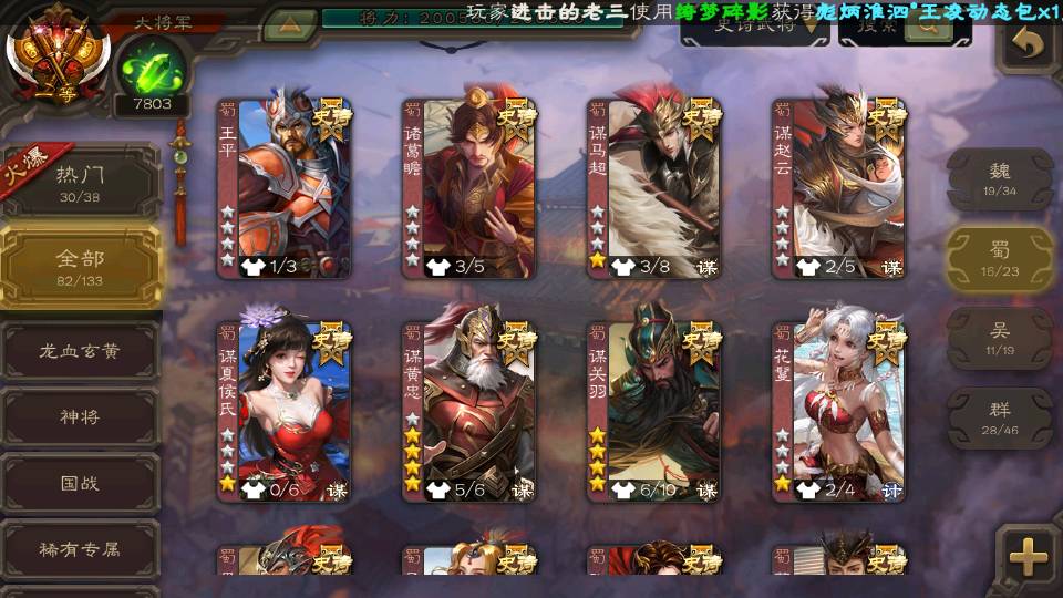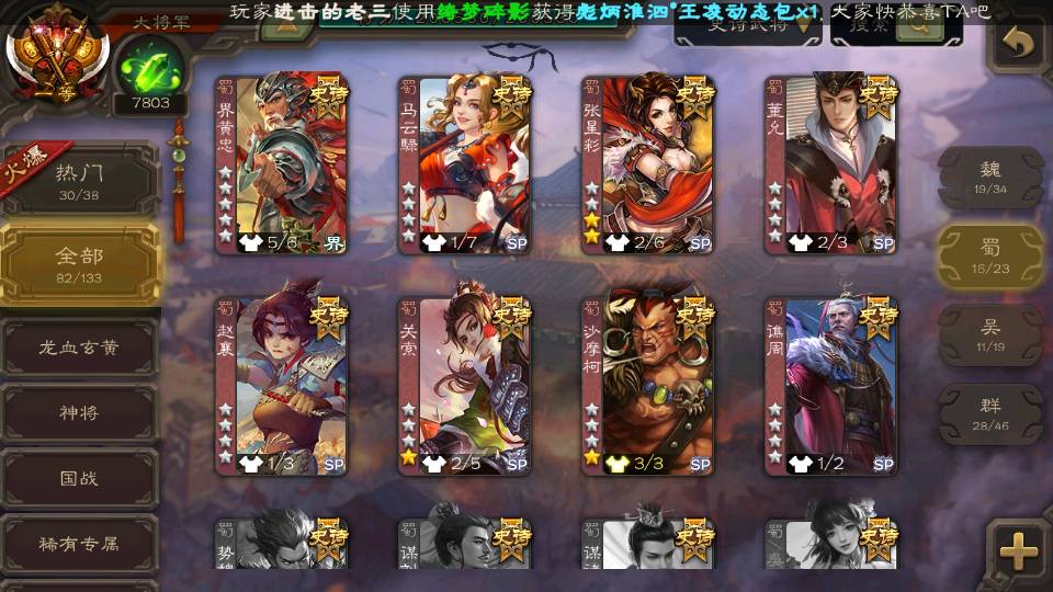 (蜀国):界黄忠,谋黄忠,谋关羽,诸葛瞻,谋赵云,花鬘,沙摩柯,谋夏侯氏,谯周,谋马超,关索,张星彩,王平,马云騄,董允,赵襄