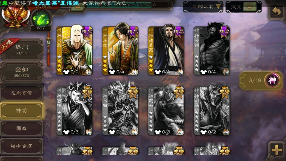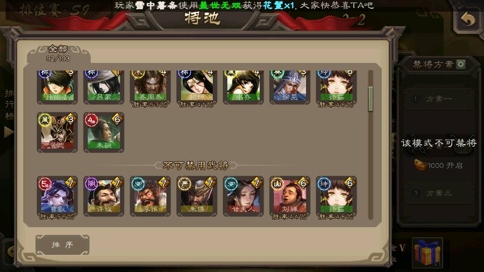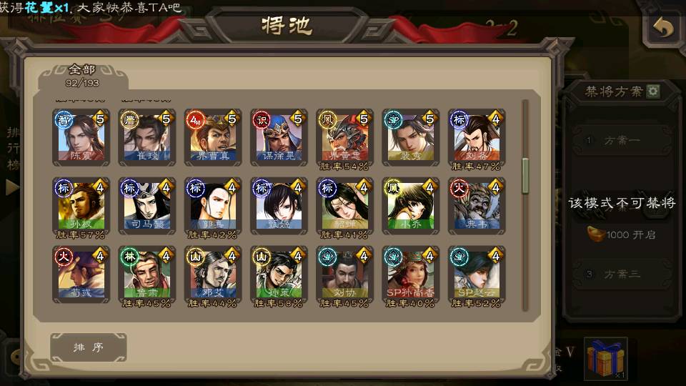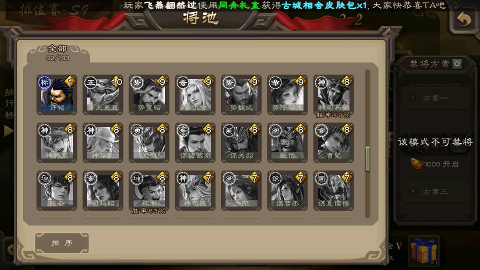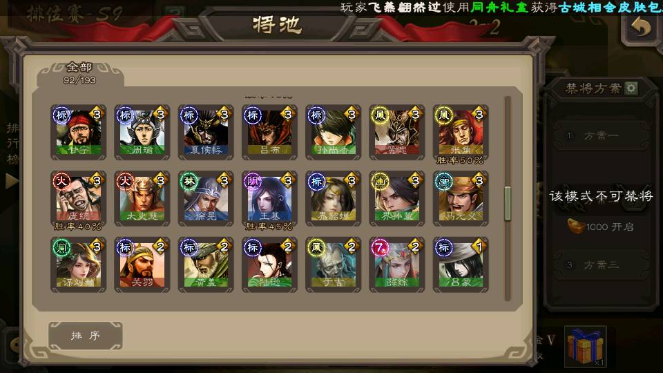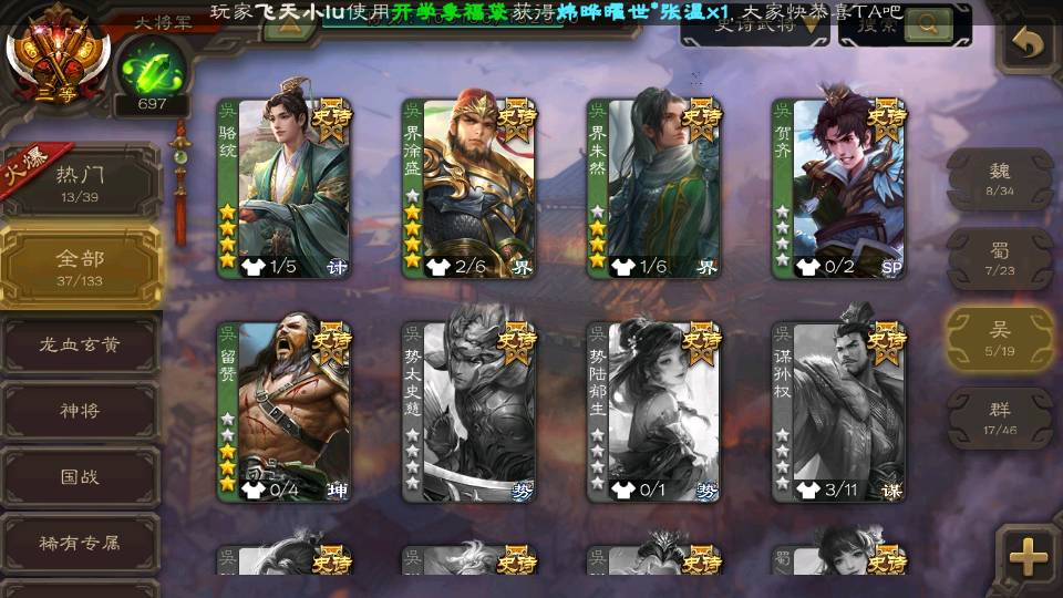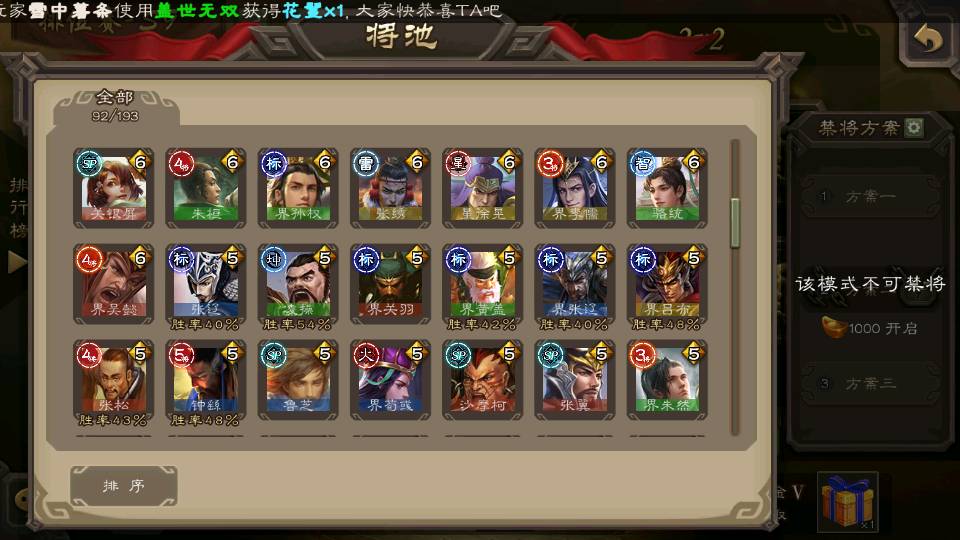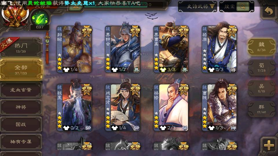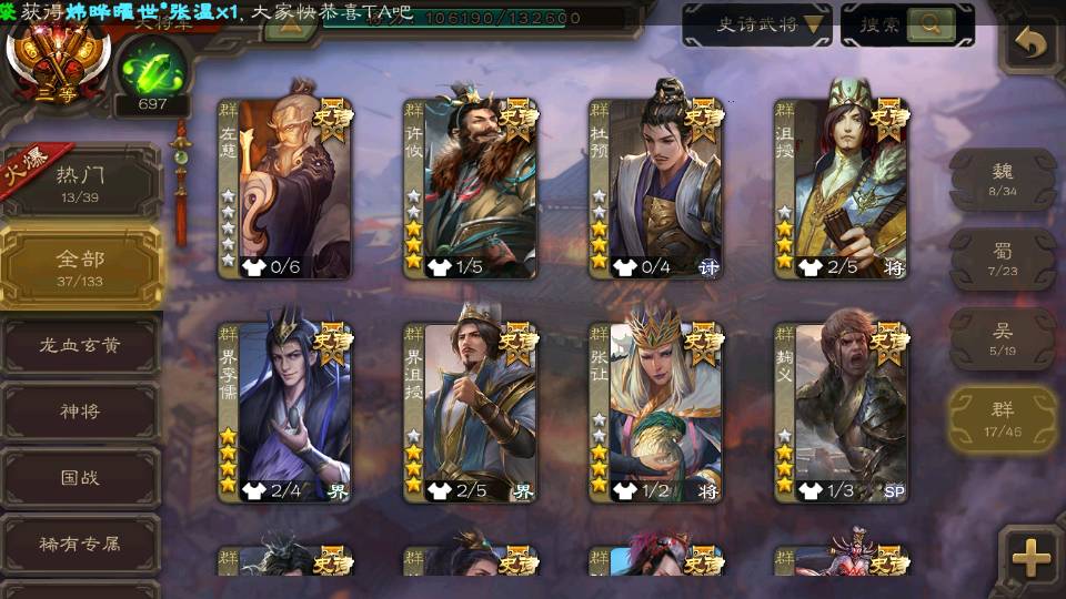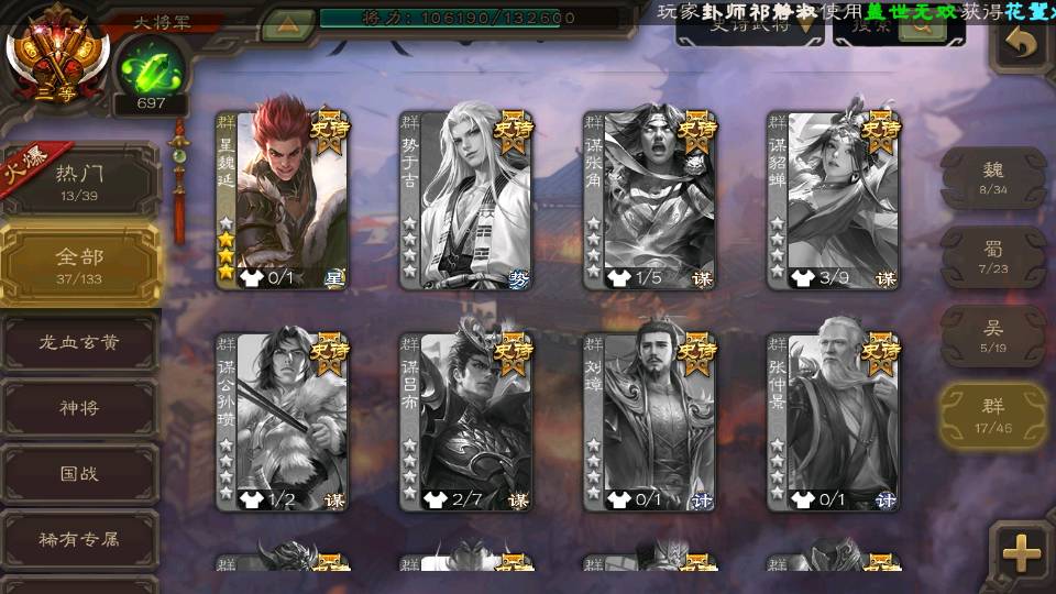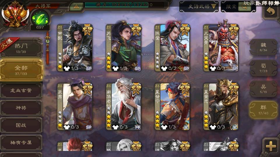 (群雄):杜预,界沮授,南华老仙,麴义,许攸,张让,界李儒,苏飞,星甘宁,裴秀,星魏延,审配,星黄忠,陈登,左慈,沮授,兀突骨