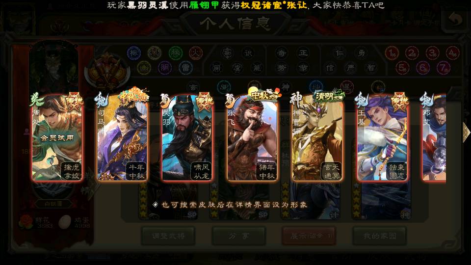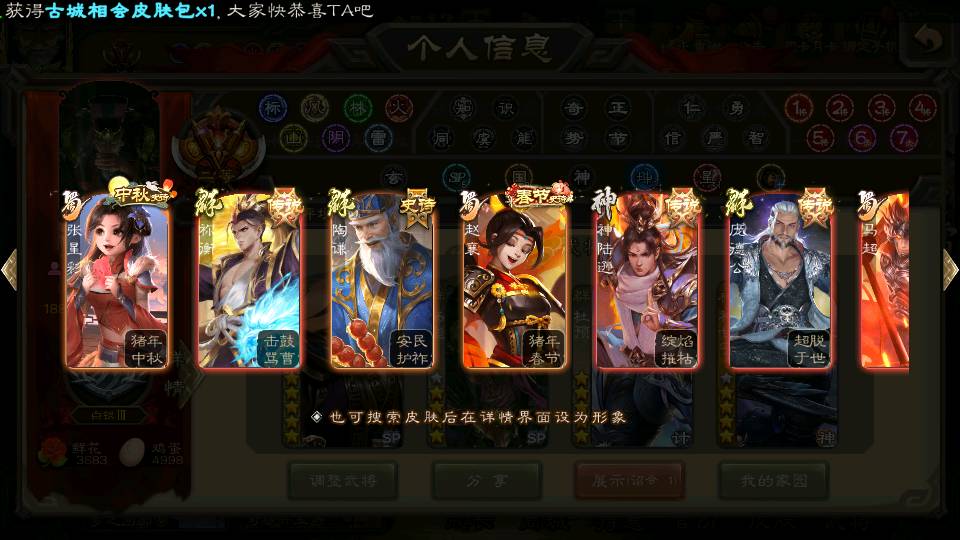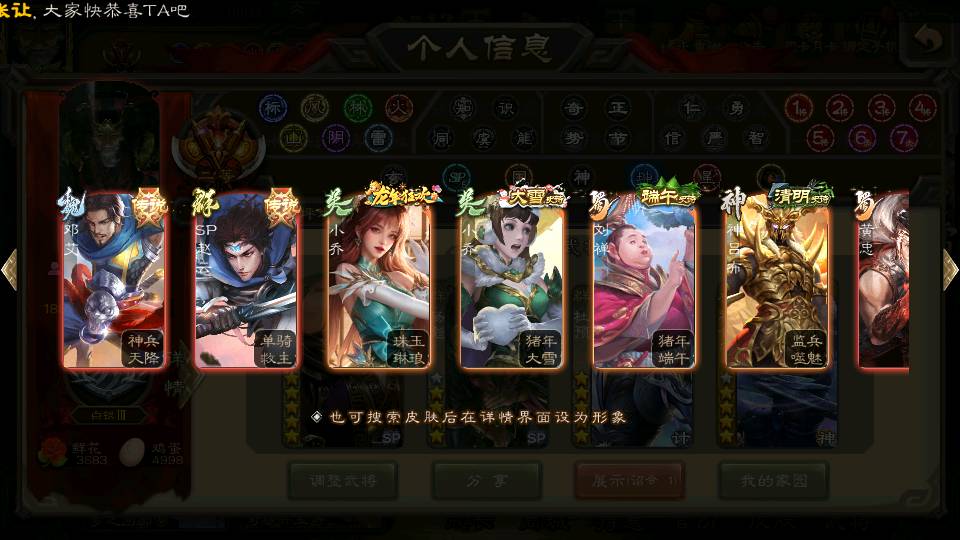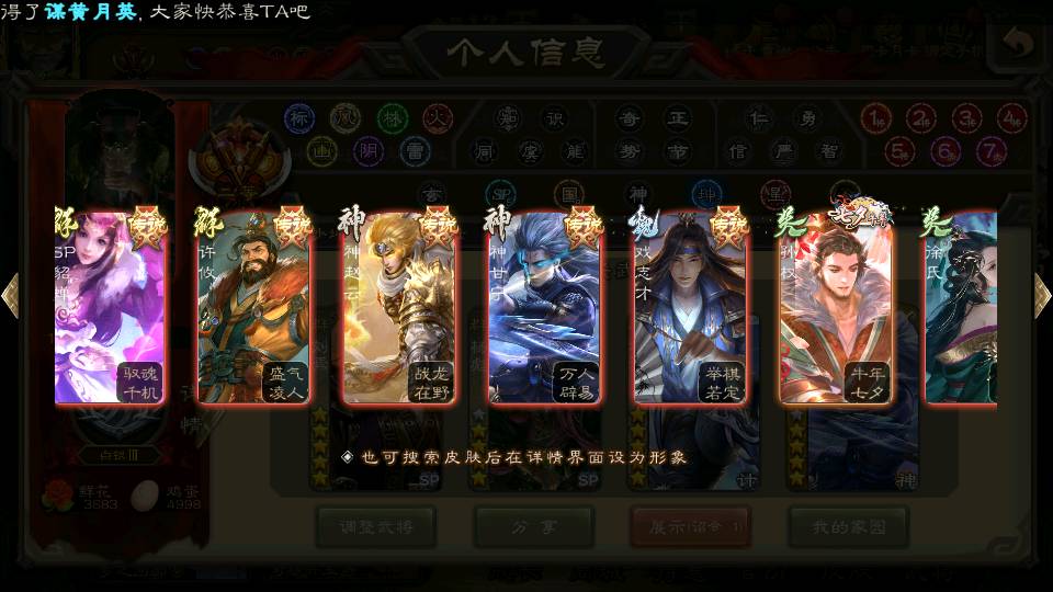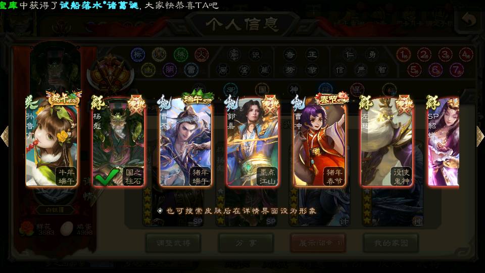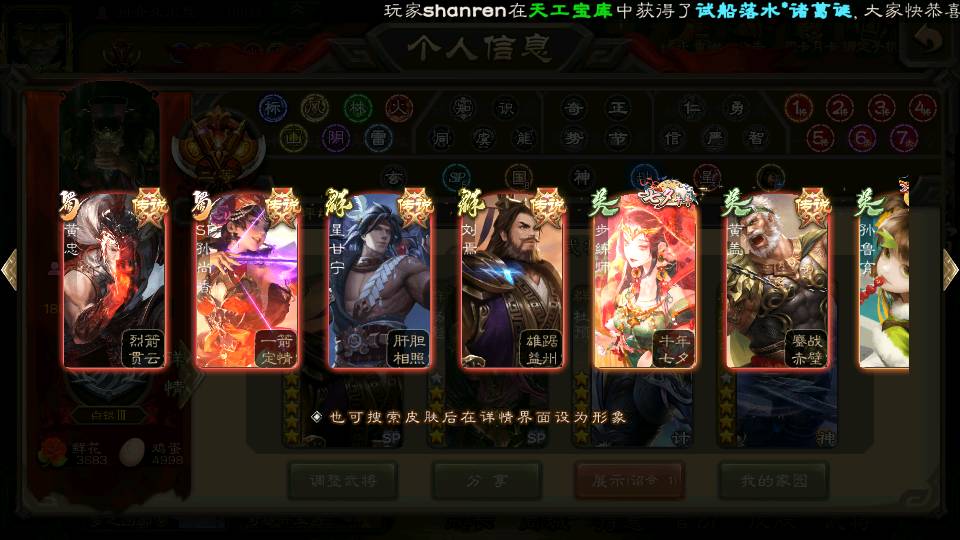 商品编号22642 全部皮肤380,动态皮肤46,全部武将387,排位武将99,国战武将97,史诗武将58,vip:12,杨彪回廊