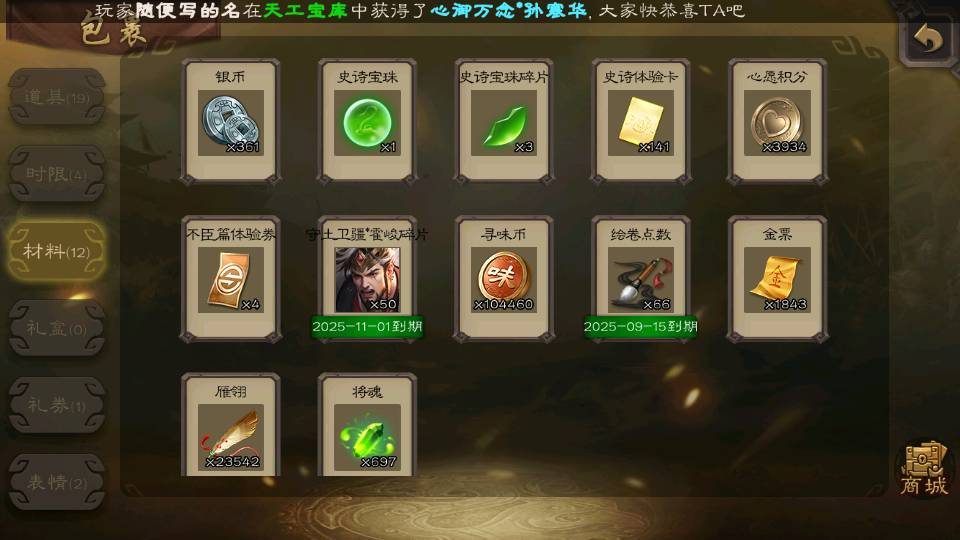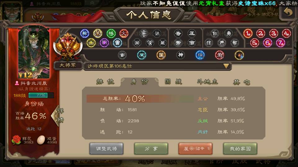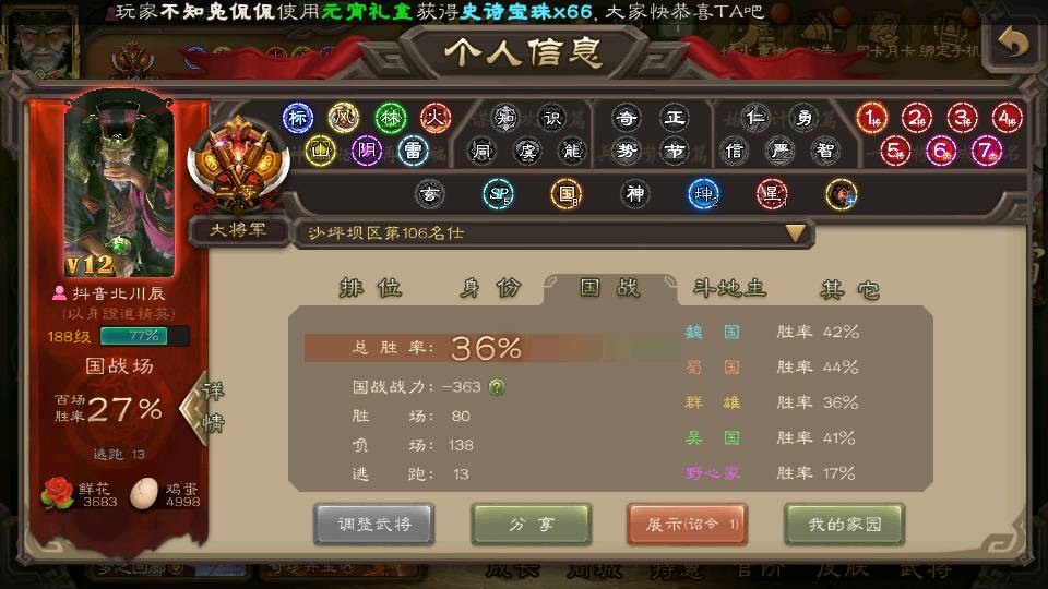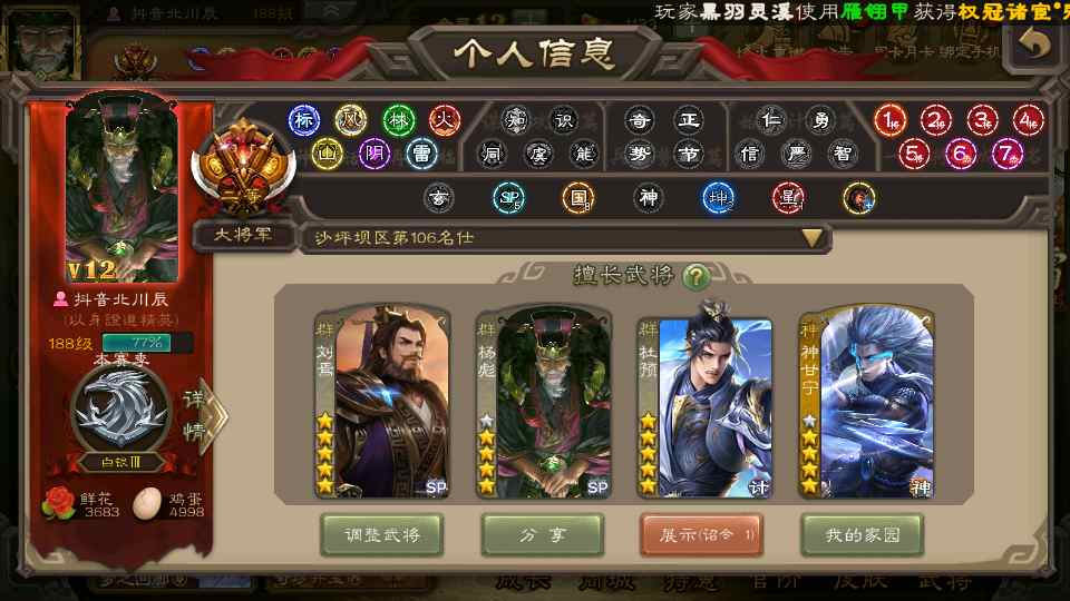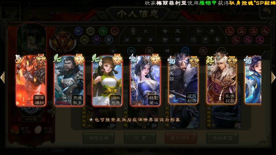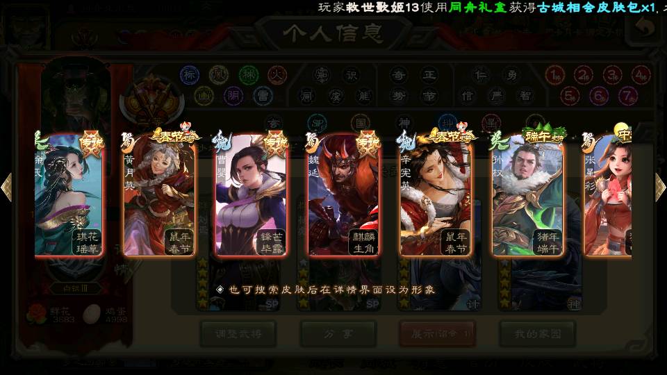商品编号22642 全部皮肤380,动态皮肤46,全部武将387,排位武将99,国战武将97,史诗武将58,vip:12,杨彪回廊