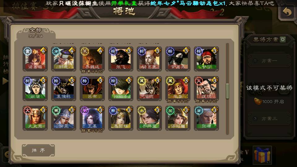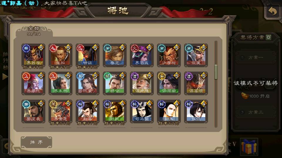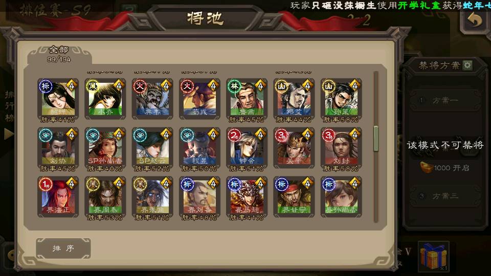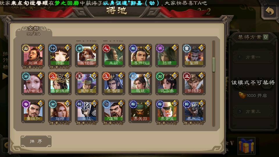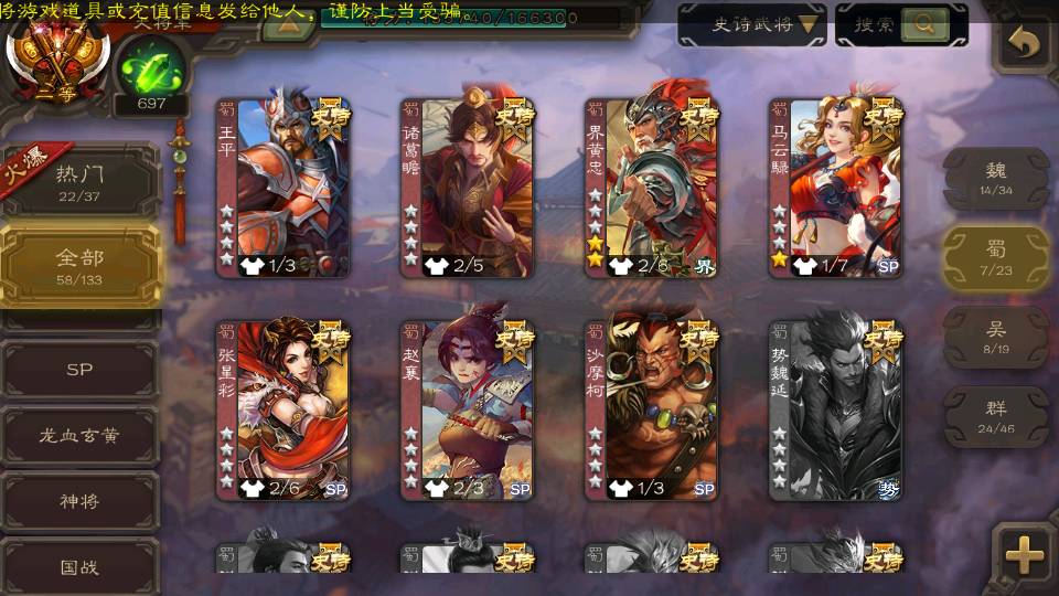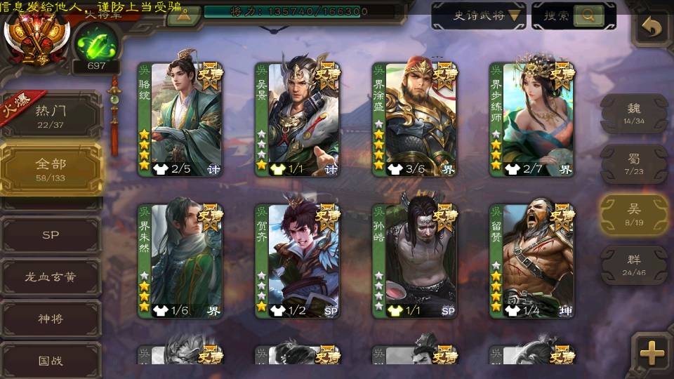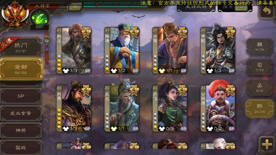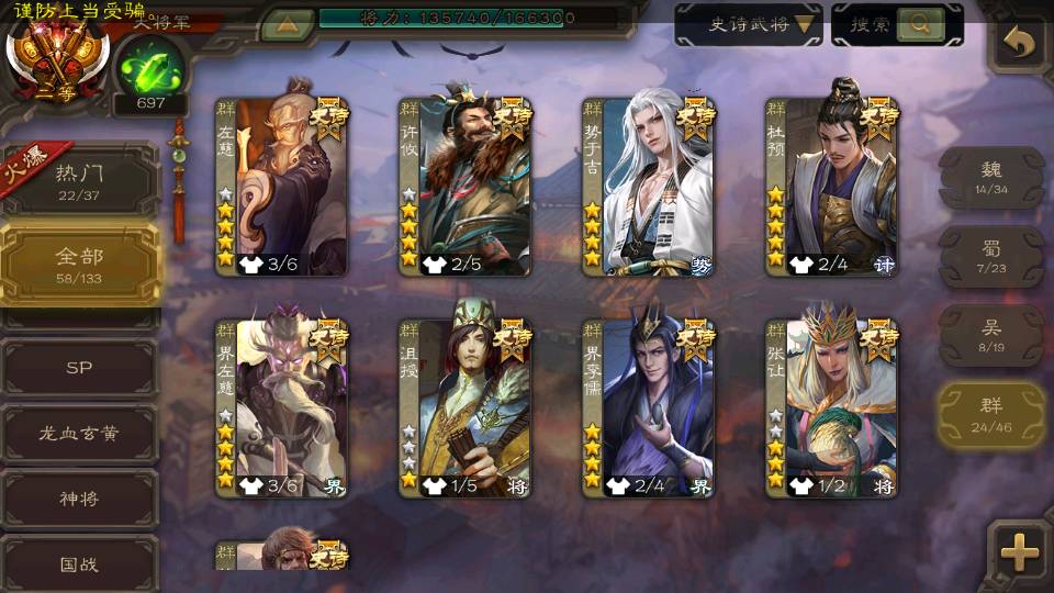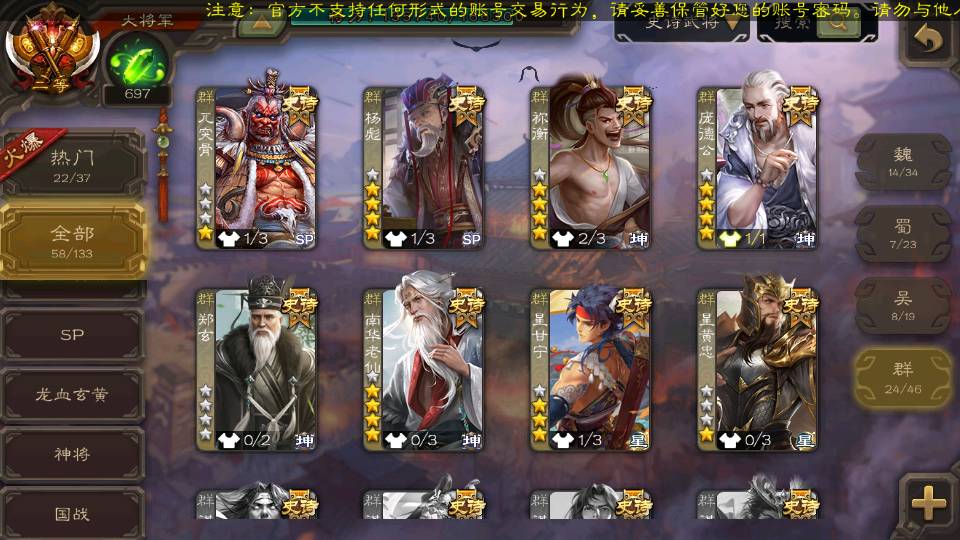(群雄):刘焉,杨彪,杜预,祢衡,界左慈,南华老仙,麴义,许攸,张让,界李儒,苏飞,庞德公,星甘宁,势于吉,士燮,王允,公孙康,郑玄,陶谦,审配,星黄忠,左慈,沮授,兀突骨