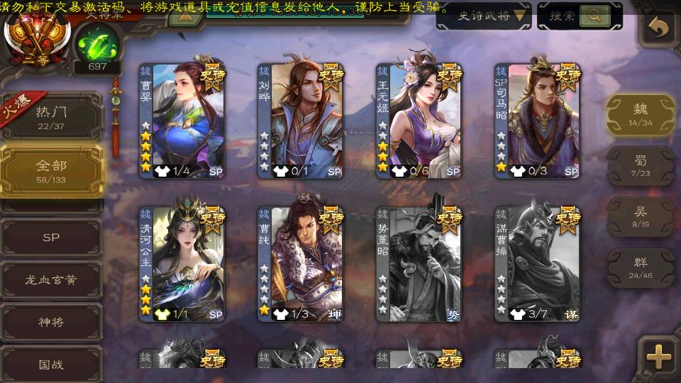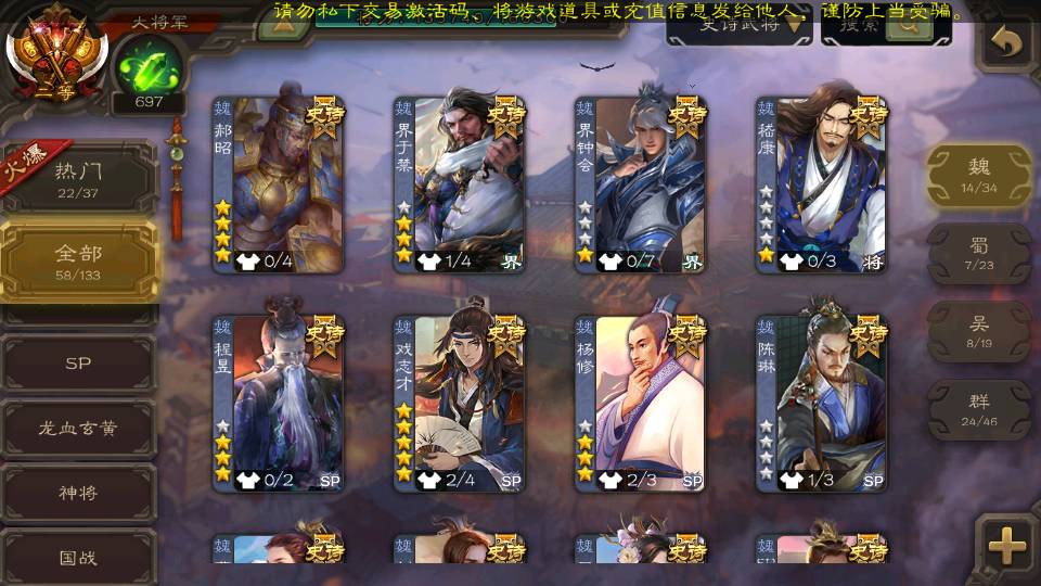 (魏国):曹婴,王元姬,戏志才,界钟会,SP司马昭,清河公主,界于禁,郝昭,程昱,曹纯,杨修,陈琳,嵇康,刘晔