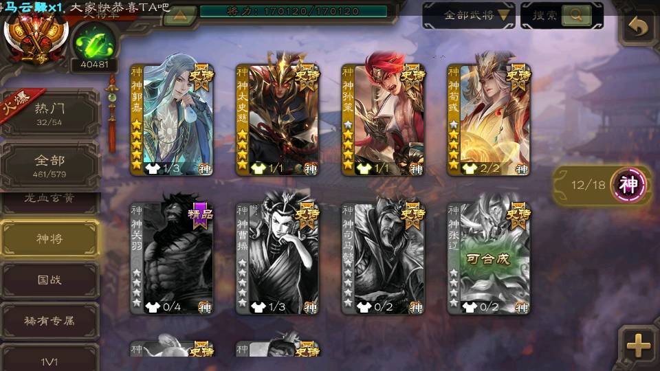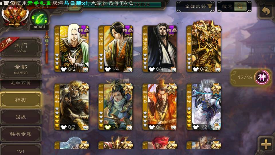 (神将):神荀彧,神郭嘉,神甘宁,神孙策,神太史慈,神陆逊,神赵云,神吕布,神刘备
