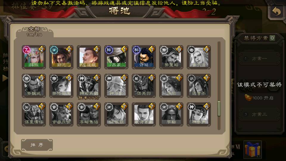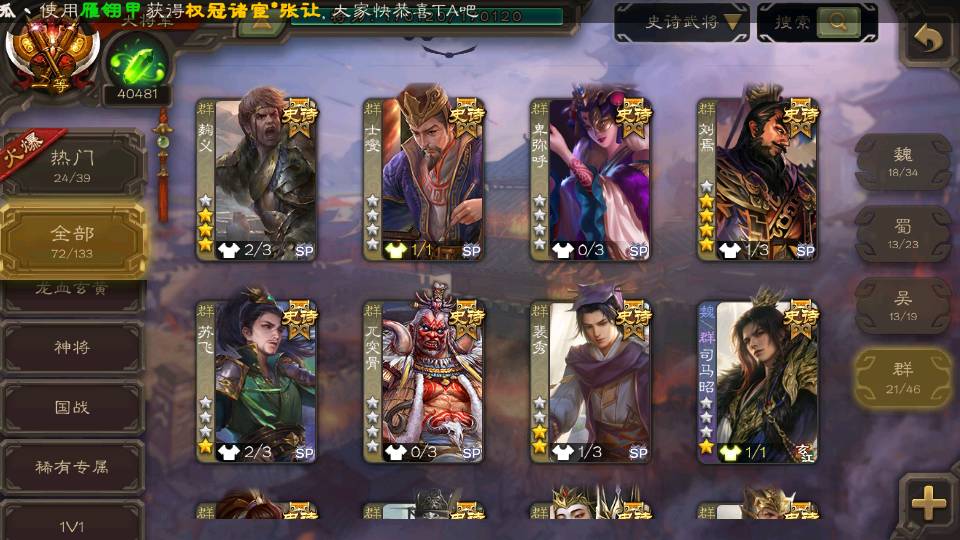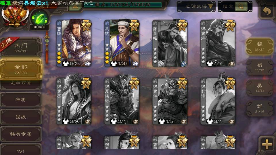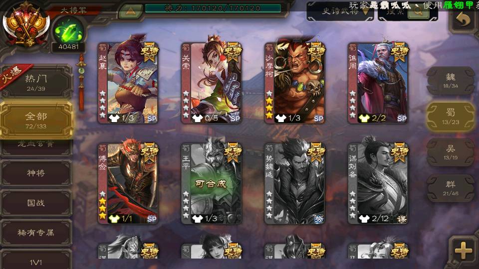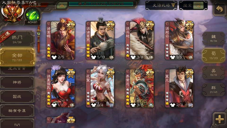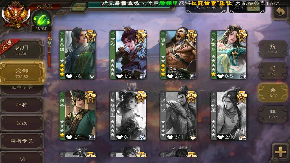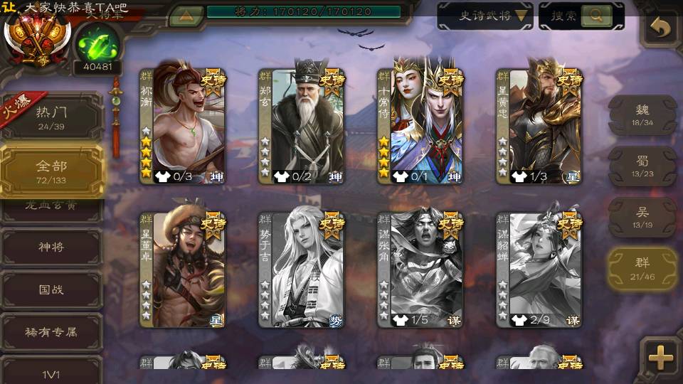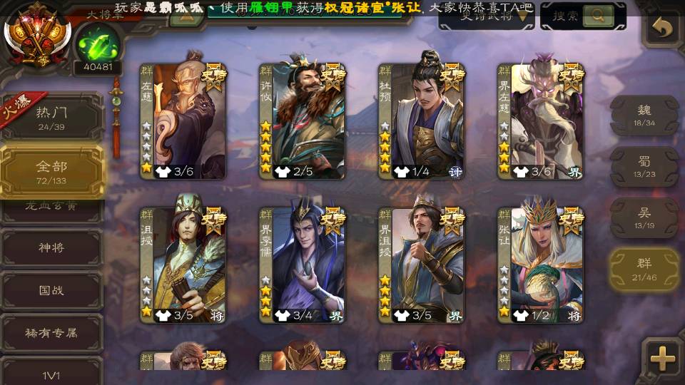 (群雄):刘焉,杜预,祢衡,界左慈,界沮授,麴义,许攸,十常侍,司马昭,张让,界李儒,苏飞,星董卓,裴秀,卑弥呼,士燮,郑玄,星黄忠,左慈,沮授,兀突骨