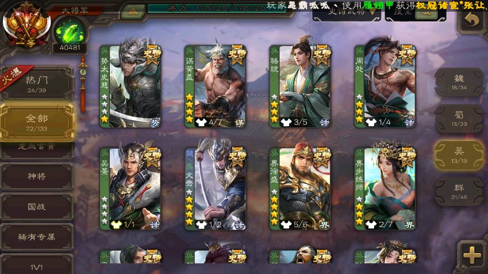 (吴国):界徐盛,留赞,孙寒华,谋黄盖,张奋,势太史慈,周处,骆统,界朱然,界步练师,吴景,贺齐