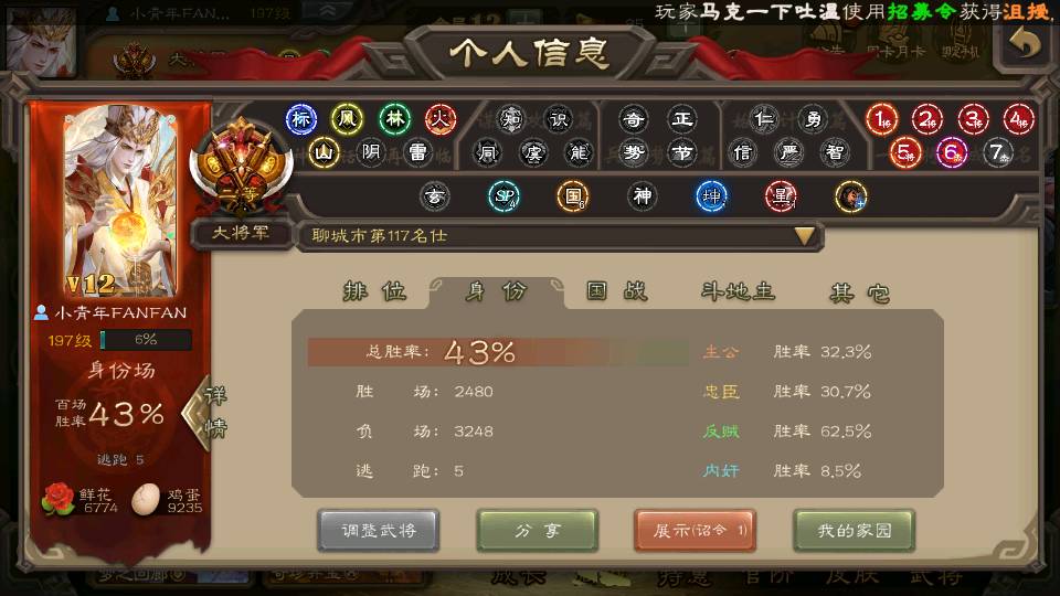 商品编号22660 全部皮肤472,动态皮肤45,全部武将387,排位武将111,国战武将92,史诗武将53,vip:12,界钟会回廊,心愿积分1.5w,雁翎4.3w