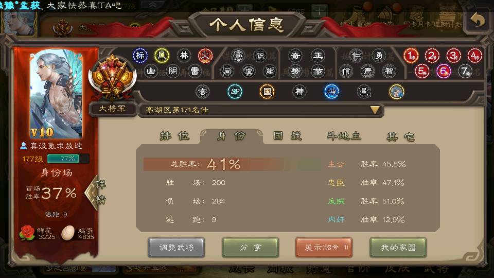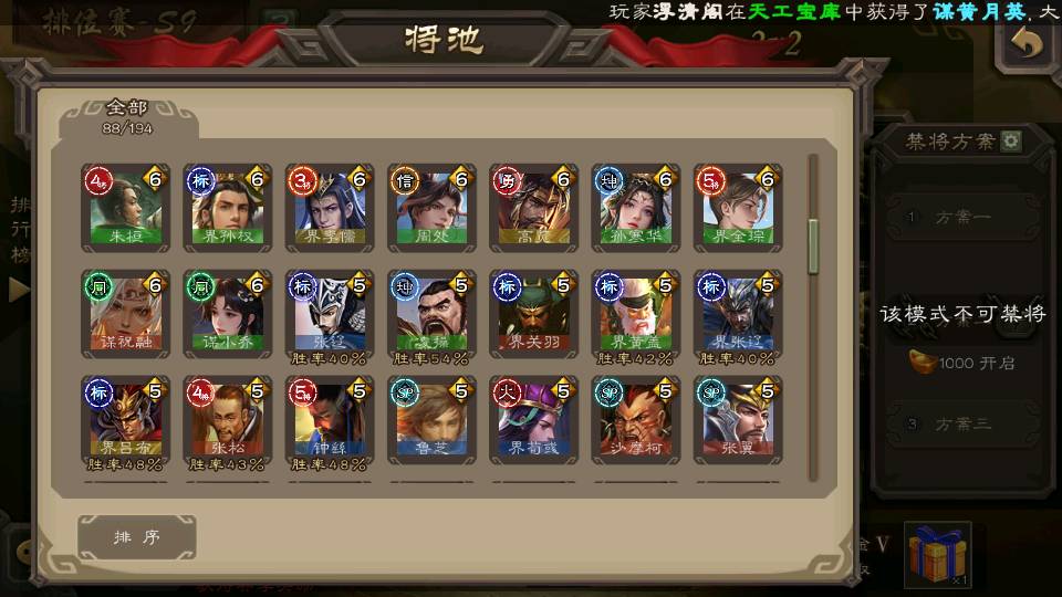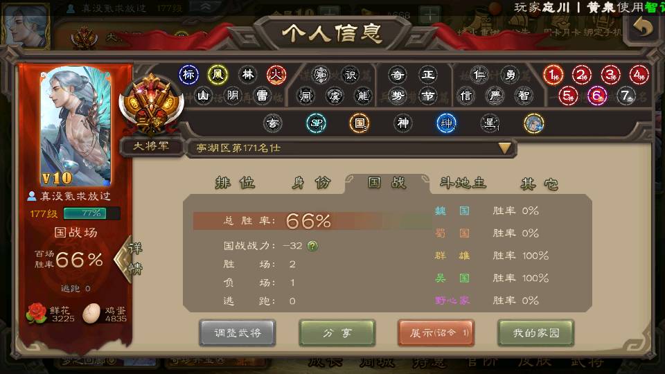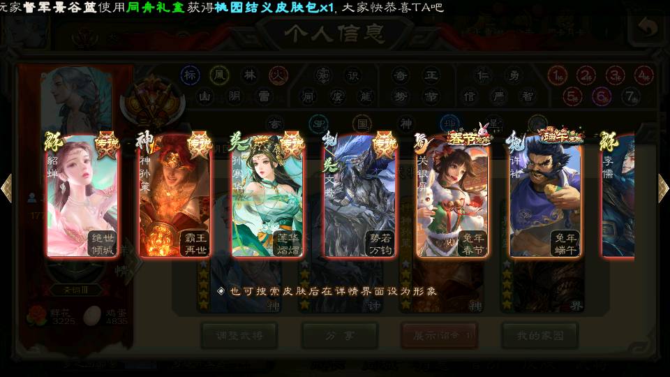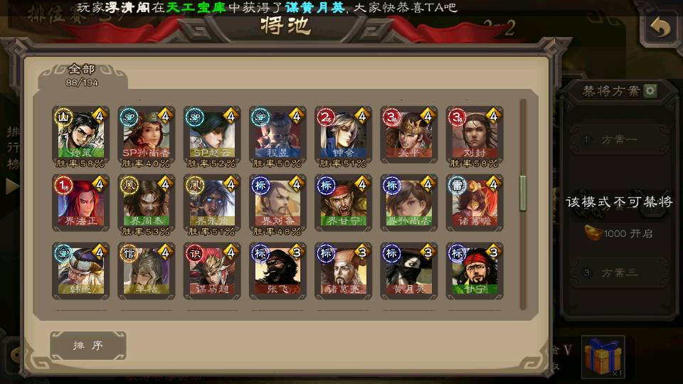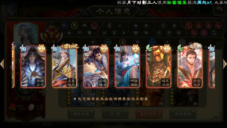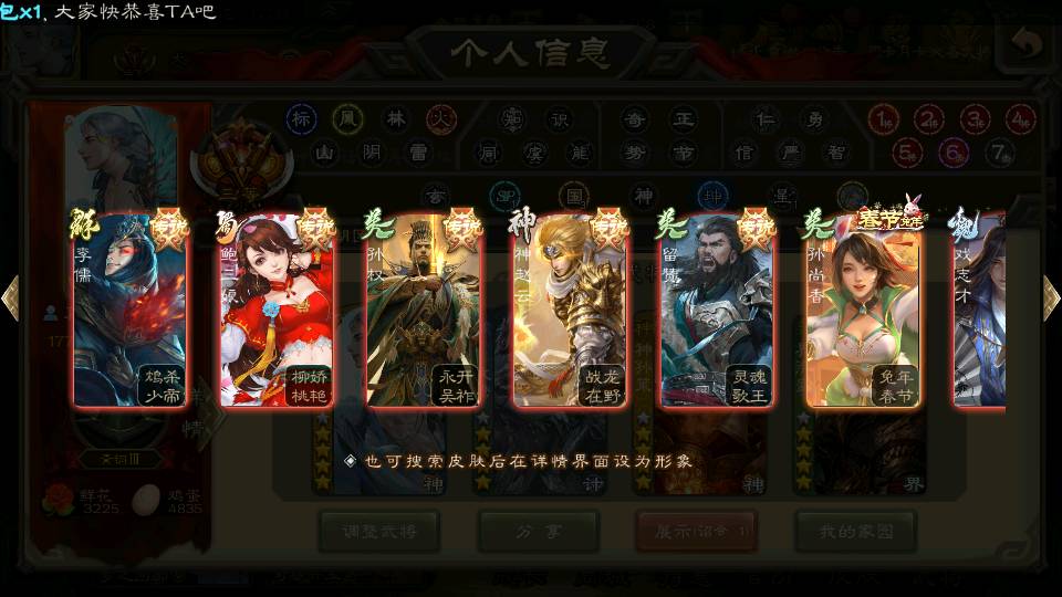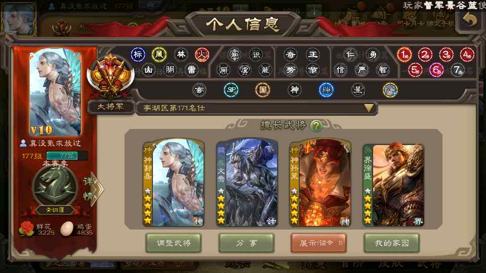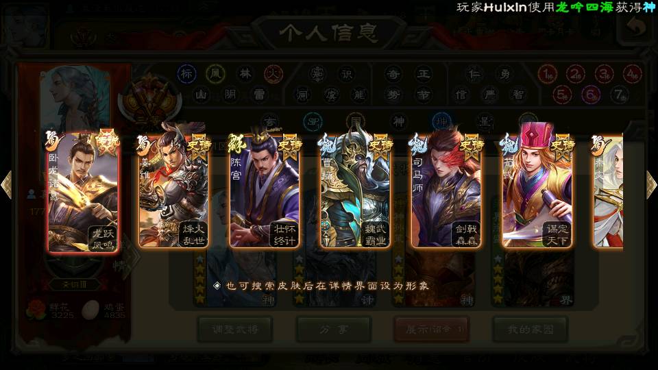 商品编号22662 全部皮肤388,动态皮肤36,全部武将330,排位武将88,国战武将85,史诗武将38,vip:10,心愿积分1.2w,金票4.8w,将魂3.8k