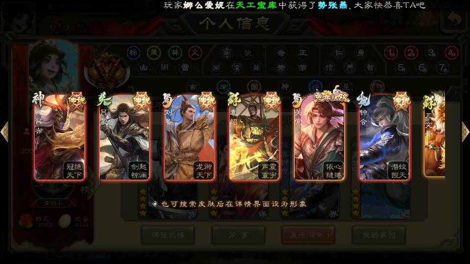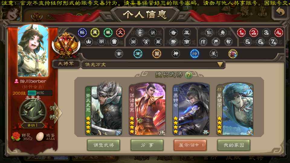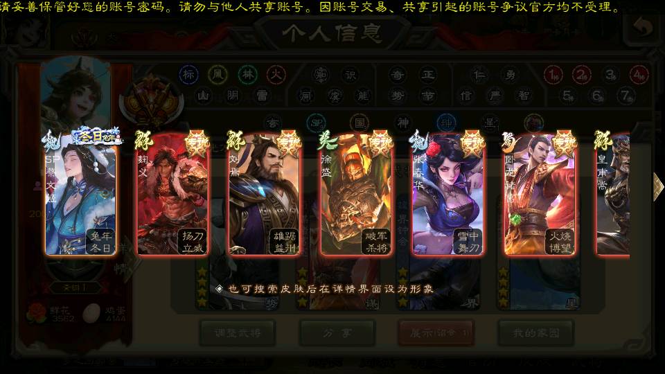 商品编号22677 全部皮肤380,动态皮肤30,全部武将324,排位武将97,国战武将83,史诗武将35,vip:8,界钟会回廊,金票8.4w,雁翎4.8w