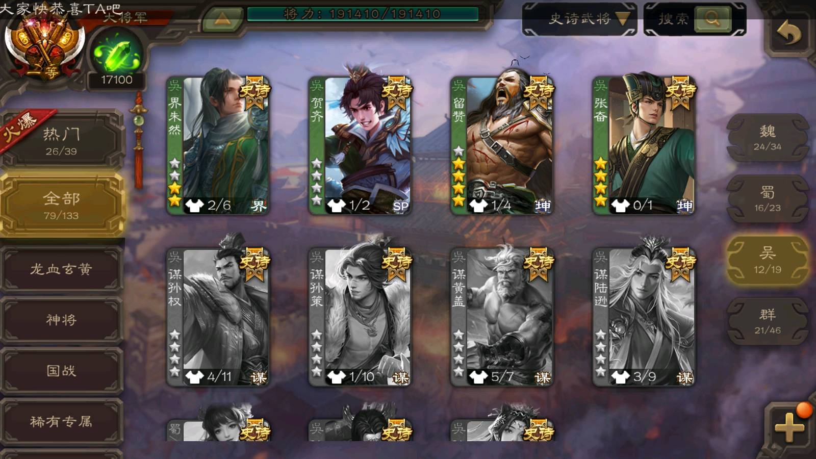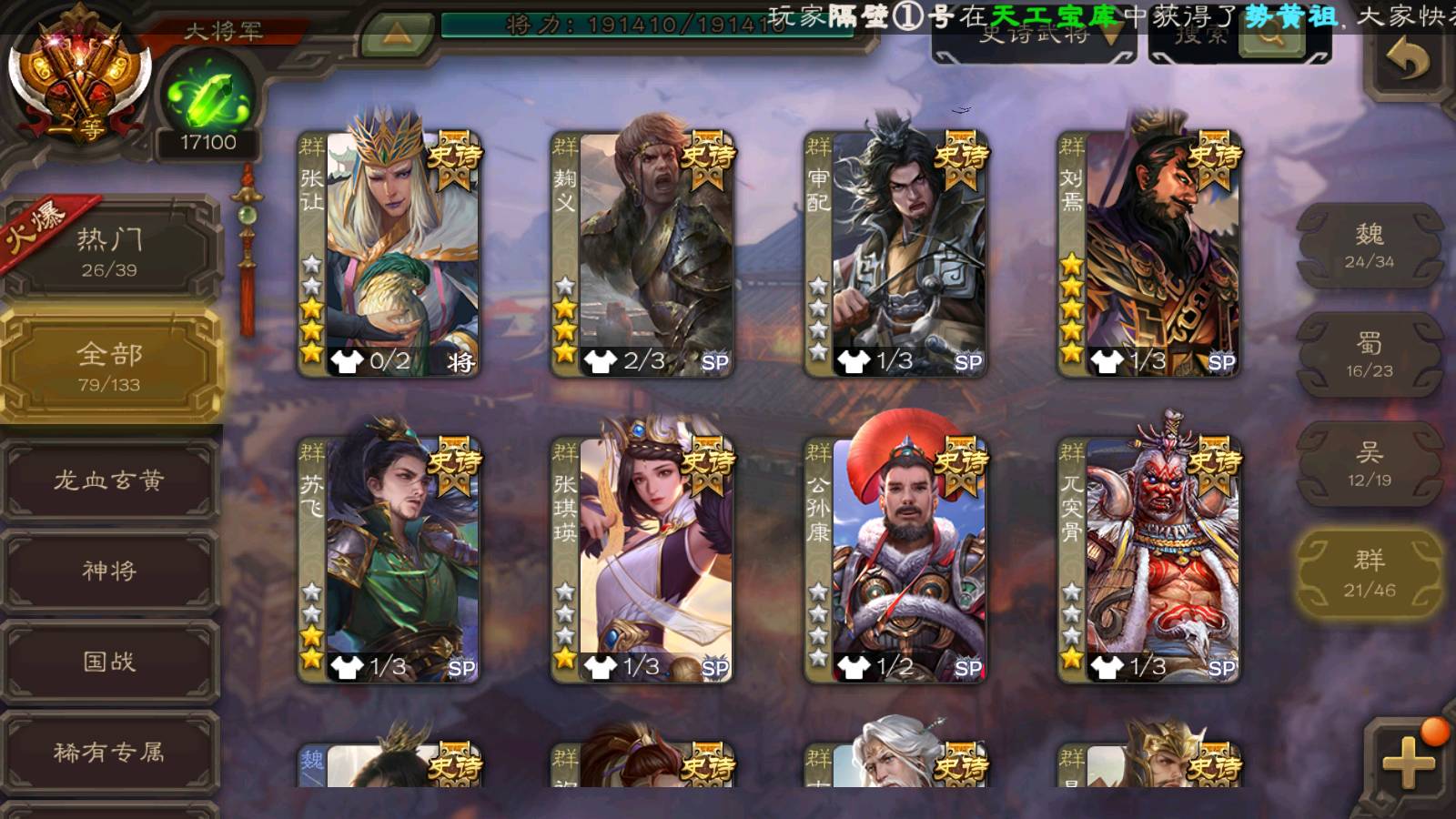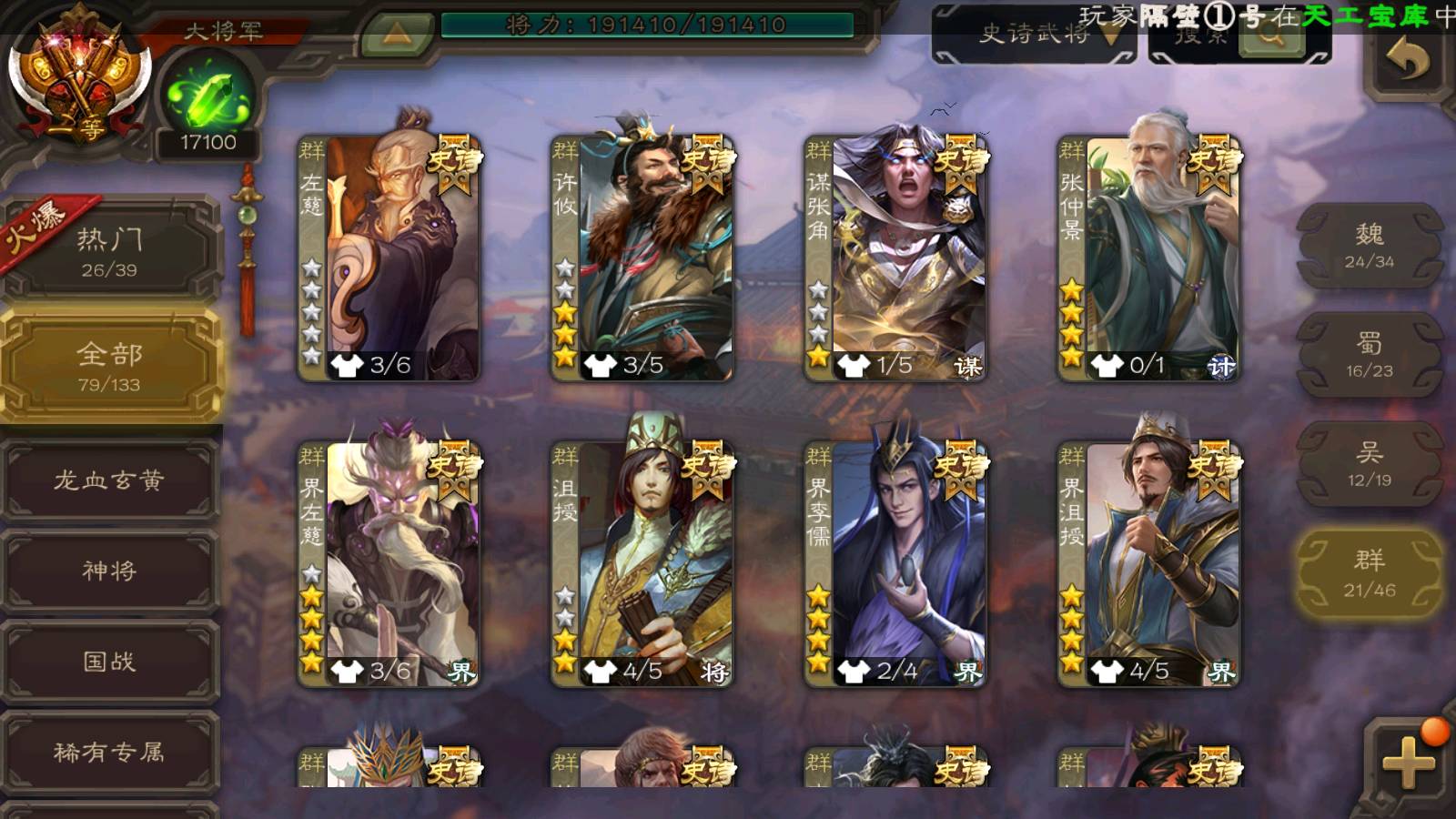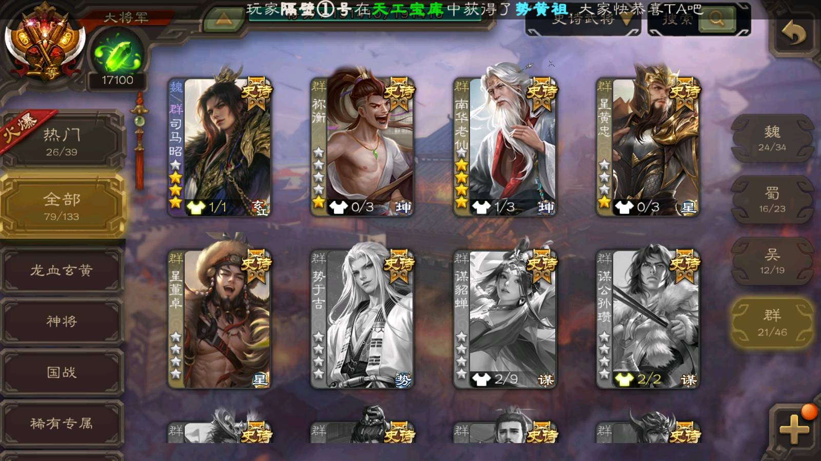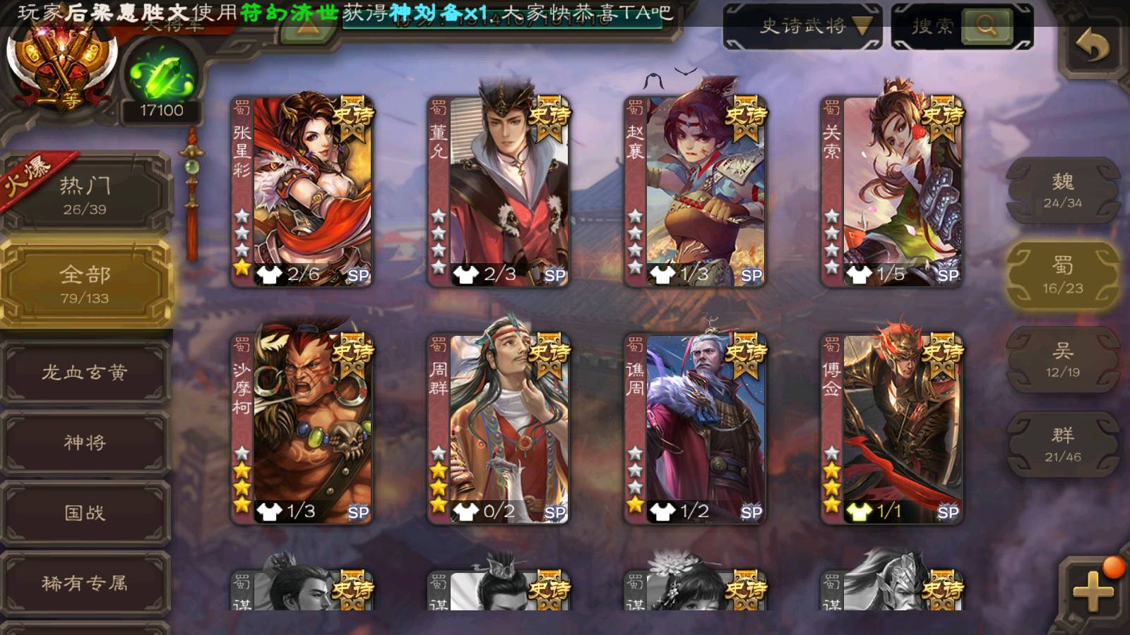 (群雄):刘焉,祢衡,界左慈,界沮授,南华老仙,麴义,许攸,张仲景,司马昭,张让,界李儒,苏飞,星董卓,张琪瑛,谋张角,公孙康,审配,星黄忠,左慈,沮授,兀突骨