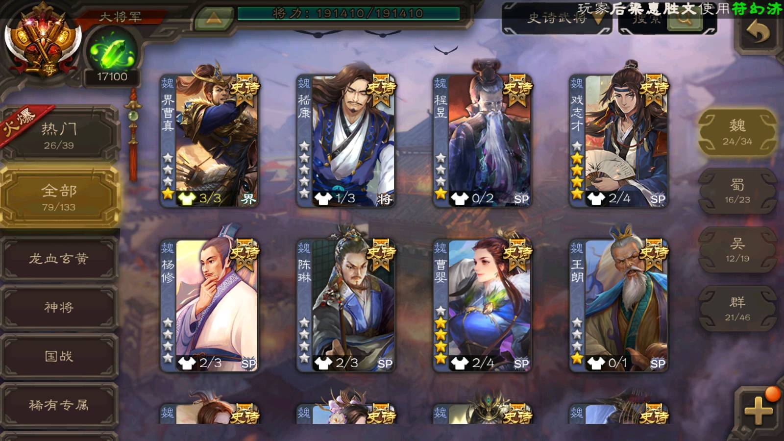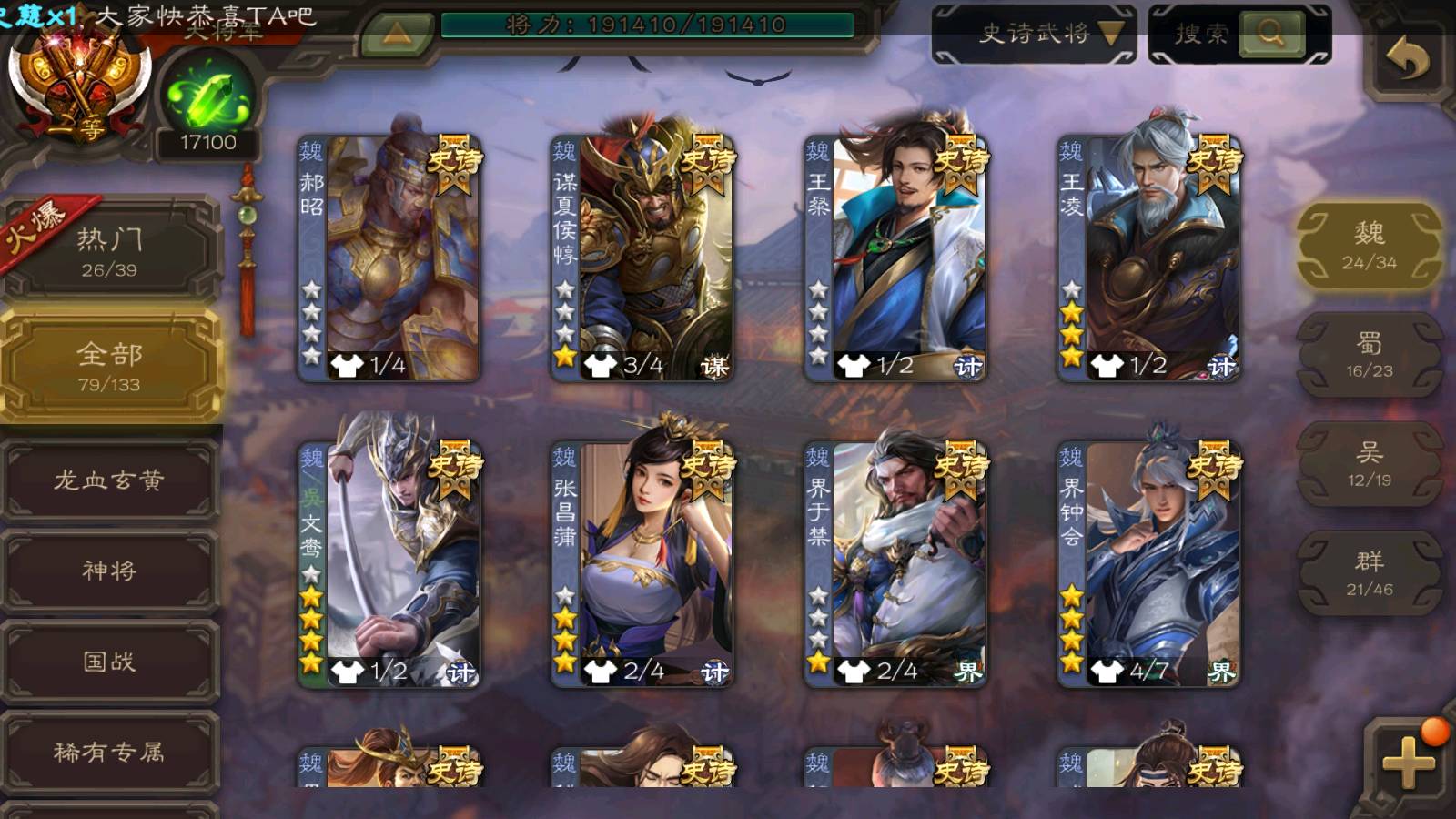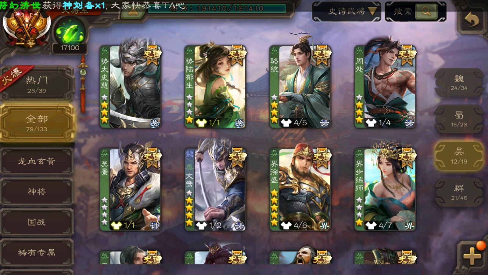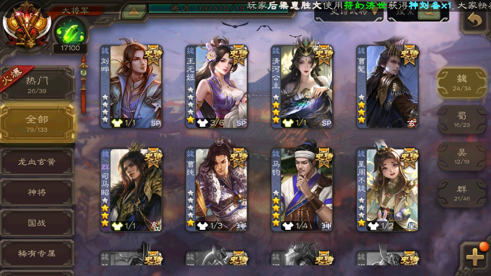 (群雄):刘焉,祢衡,界左慈,界沮授,南华老仙,麴义,许攸,张仲景,司马昭,张让,界李儒,苏飞,星董卓,张琪瑛,谋张角,公孙康,审配,星黄忠,左慈,沮授,兀突骨