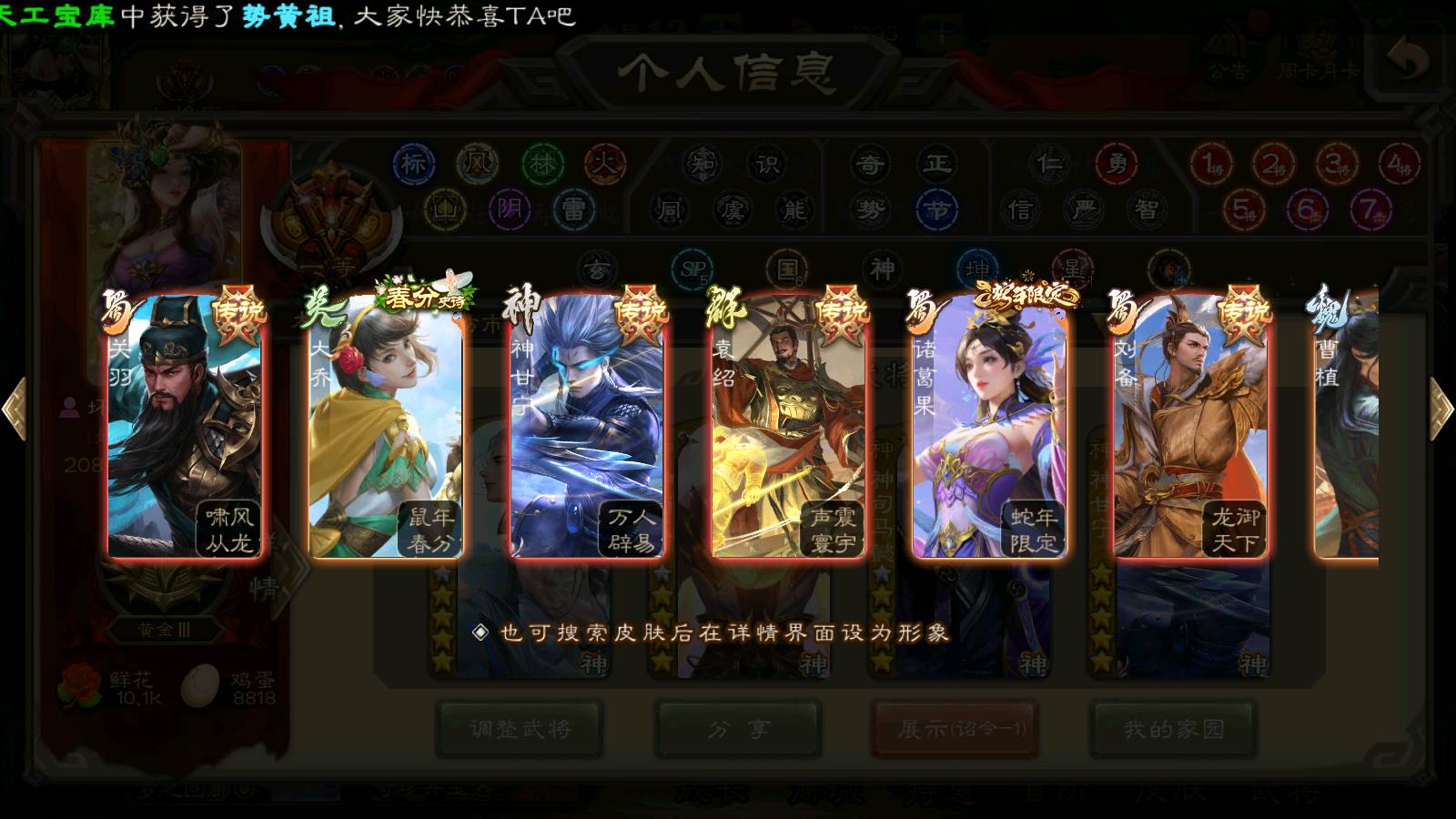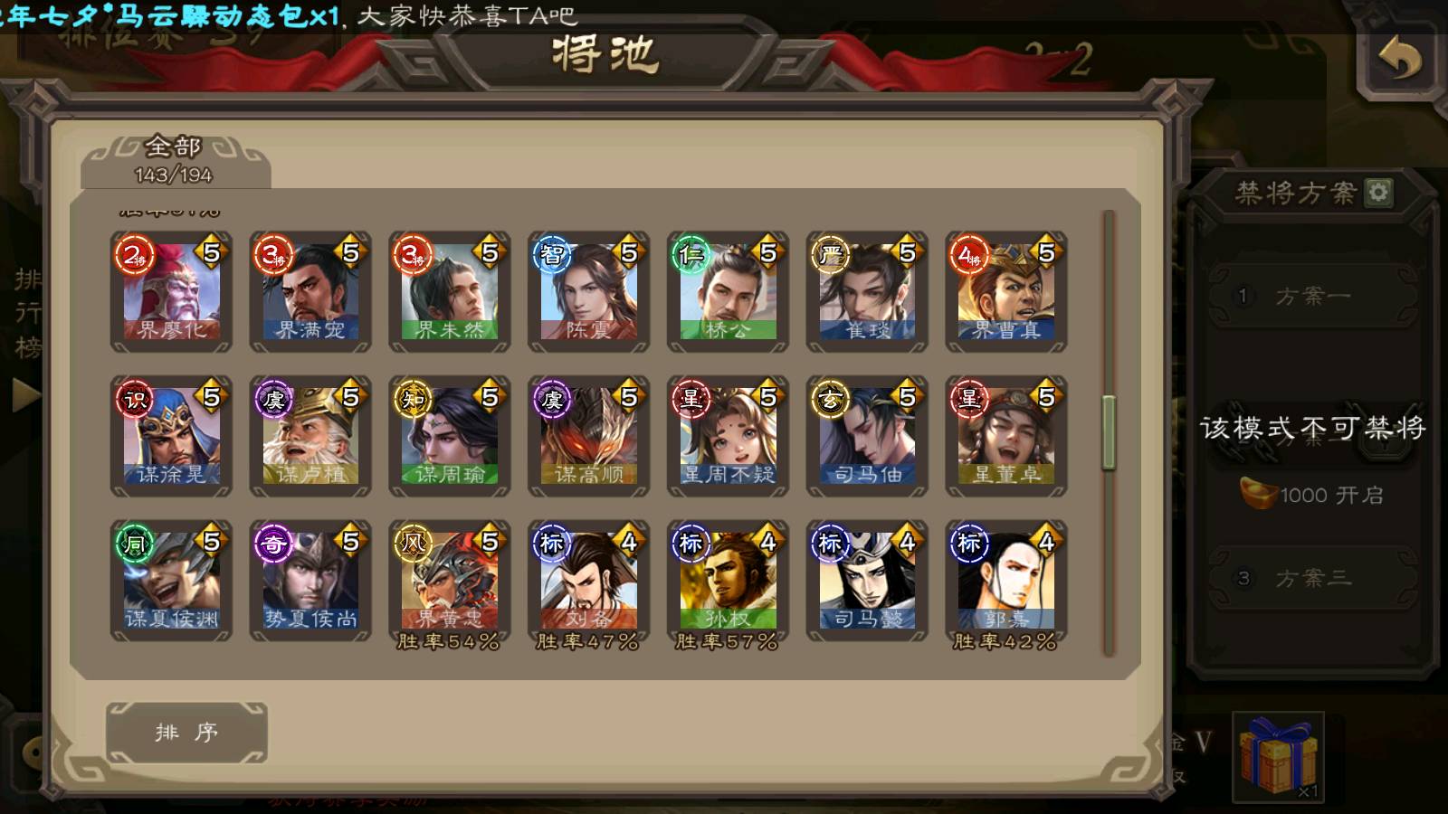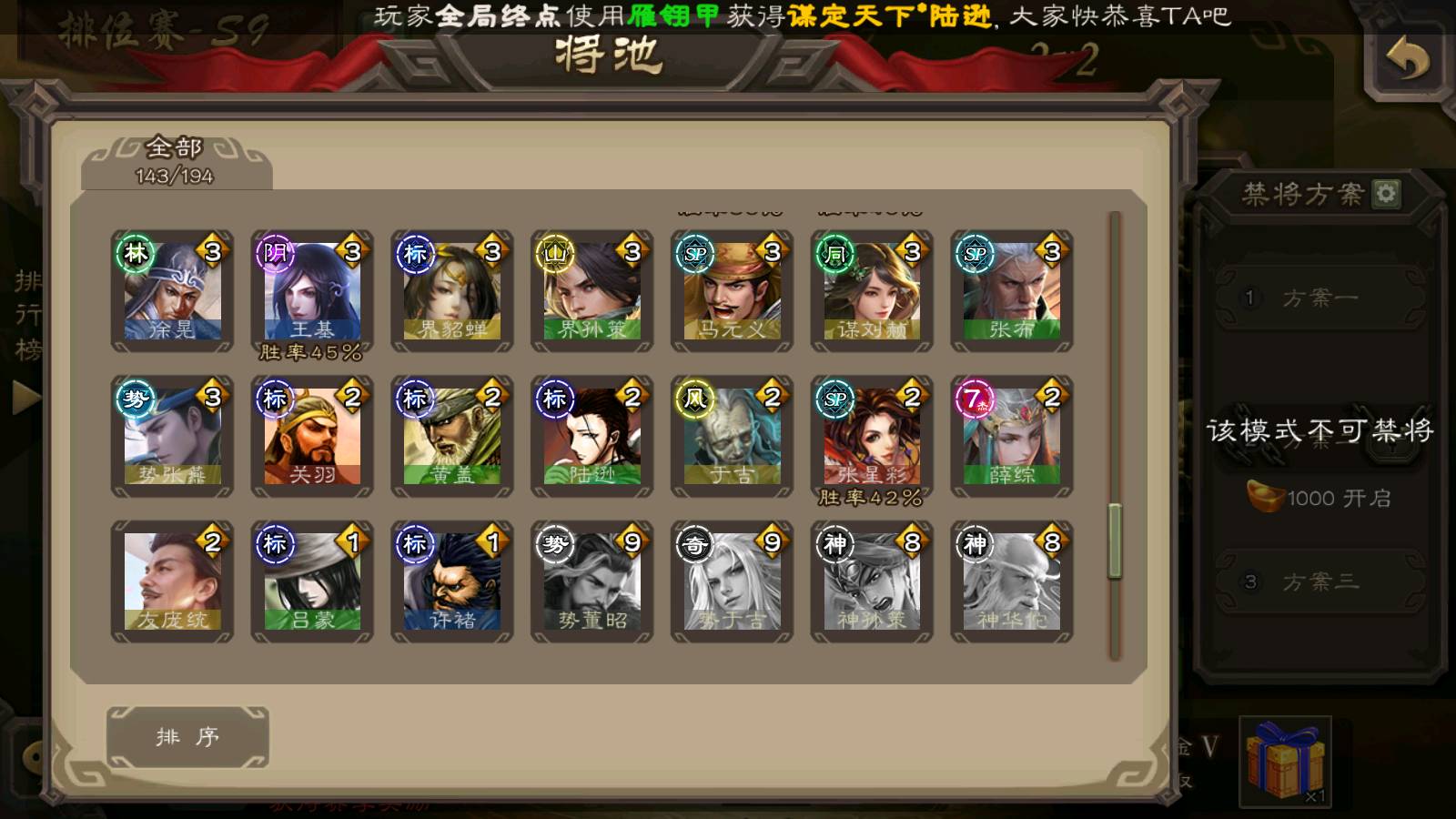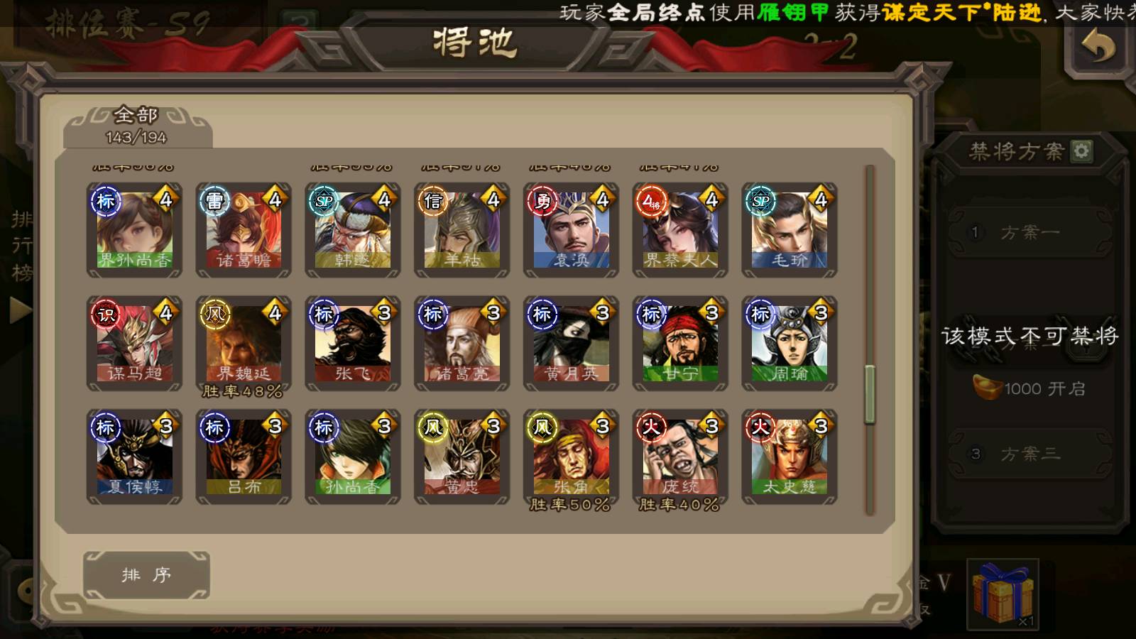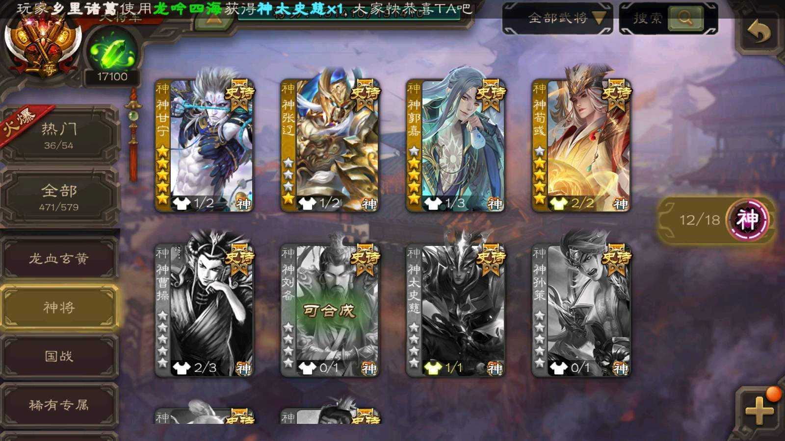 (群雄):刘焉,祢衡,界左慈,界沮授,南华老仙,麴义,许攸,张仲景,司马昭,张让,界李儒,苏飞,星董卓,张琪瑛,谋张角,公孙康,审配,星黄忠,左慈,沮授,兀突骨