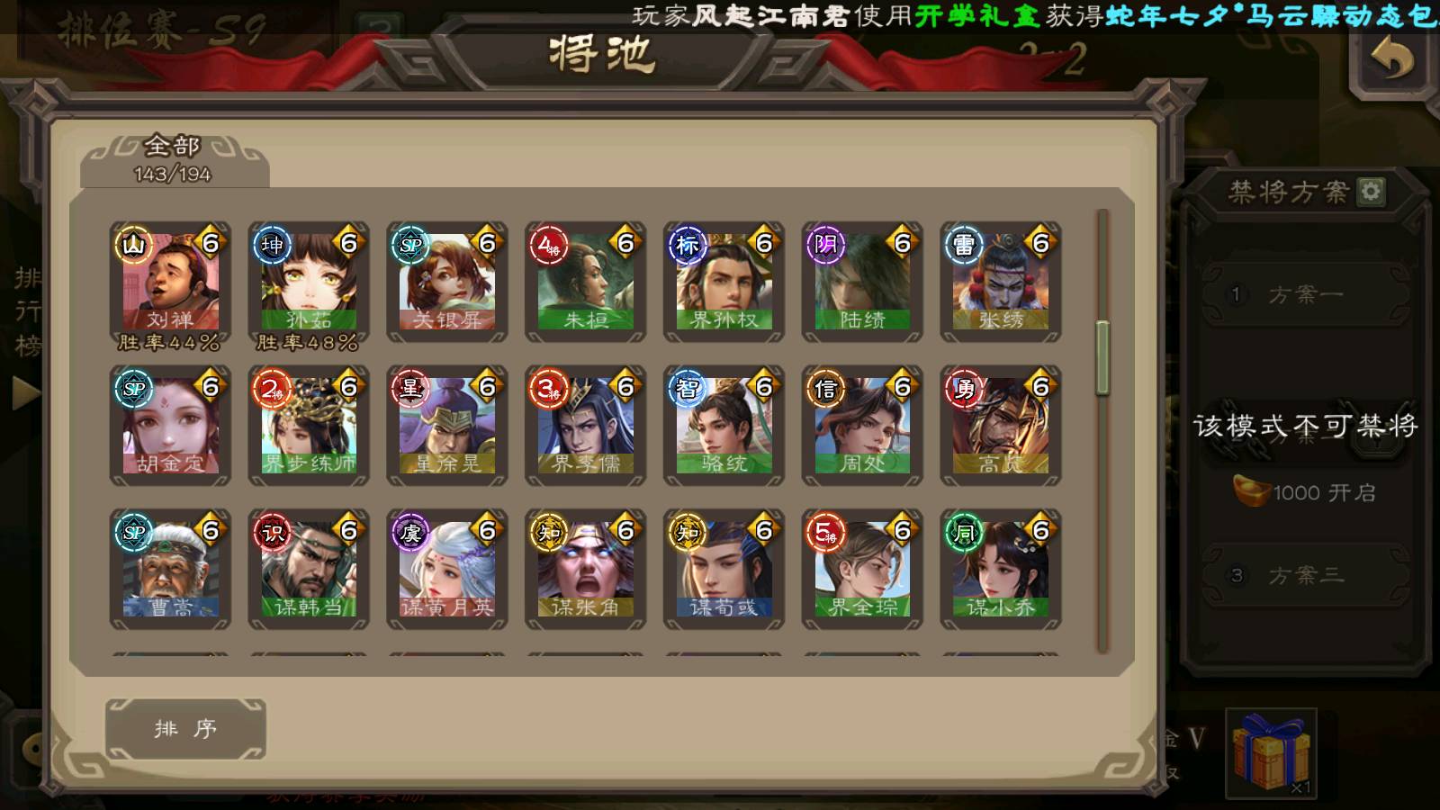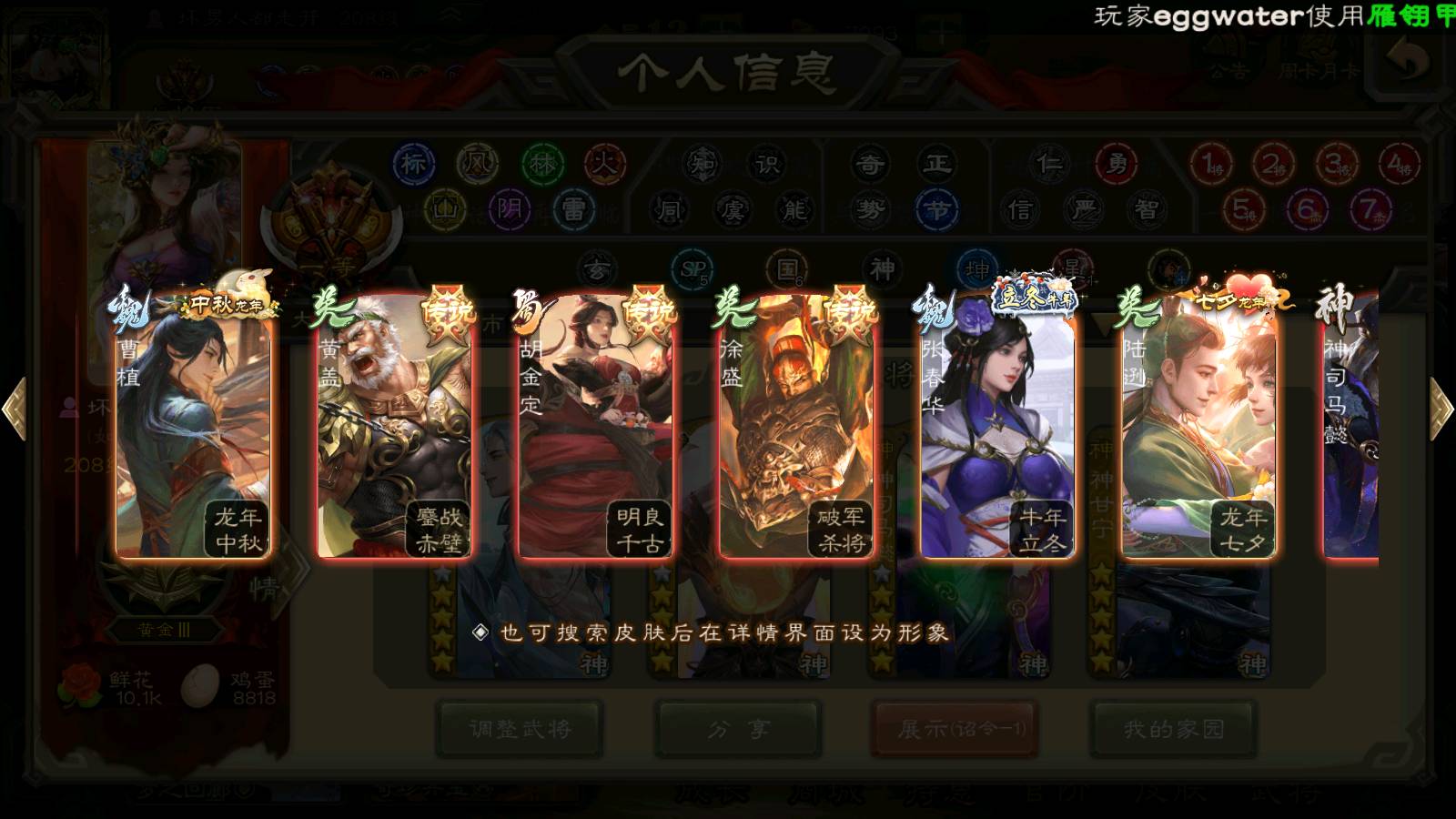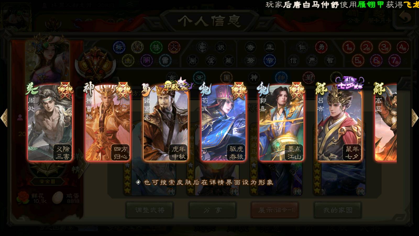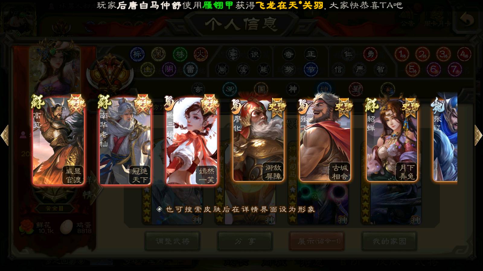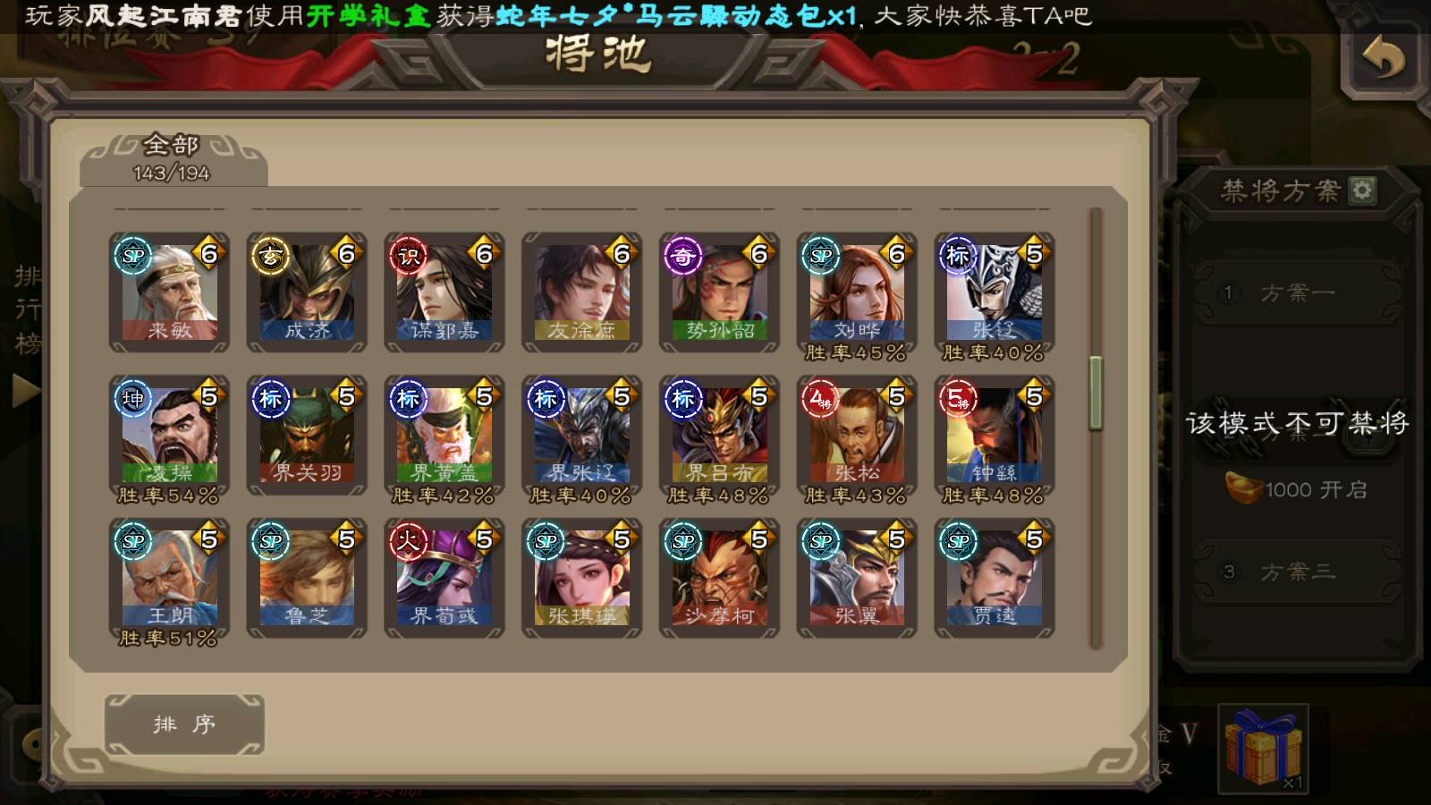 (群雄):刘焉,祢衡,界左慈,界沮授,南华老仙,麴义,许攸,张仲景,司马昭,张让,界李儒,苏飞,星董卓,张琪瑛,谋张角,公孙康,审配,星黄忠,左慈,沮授,兀突骨