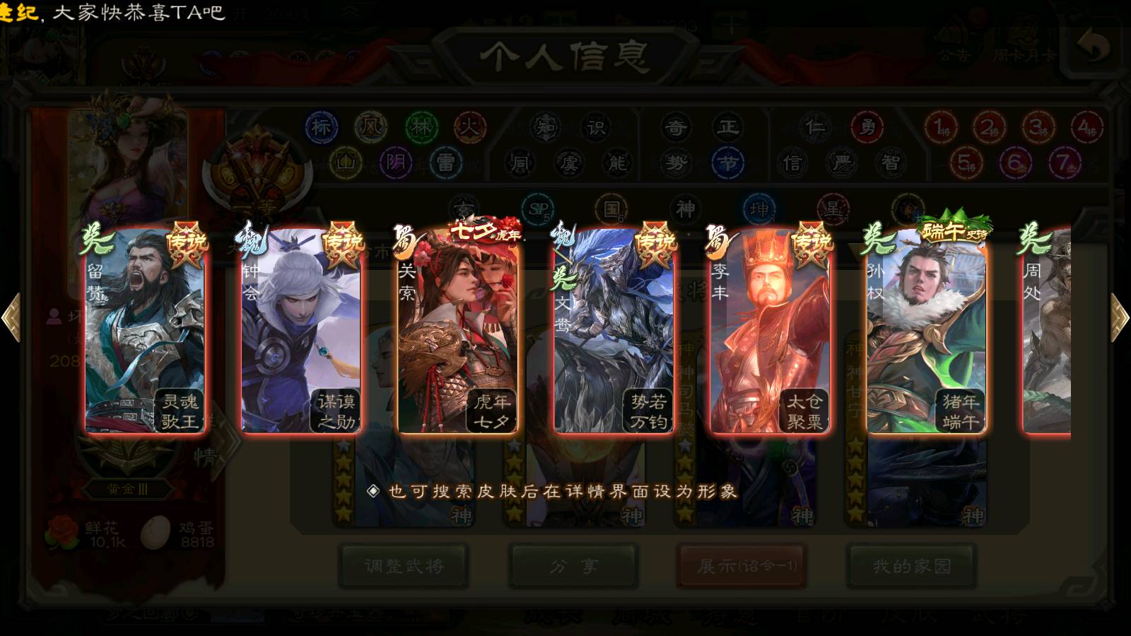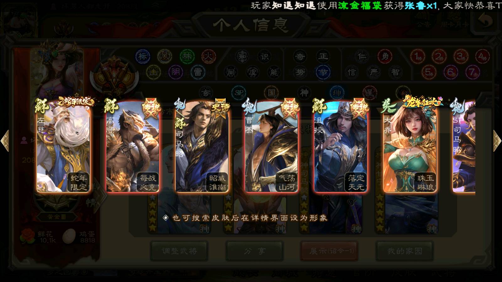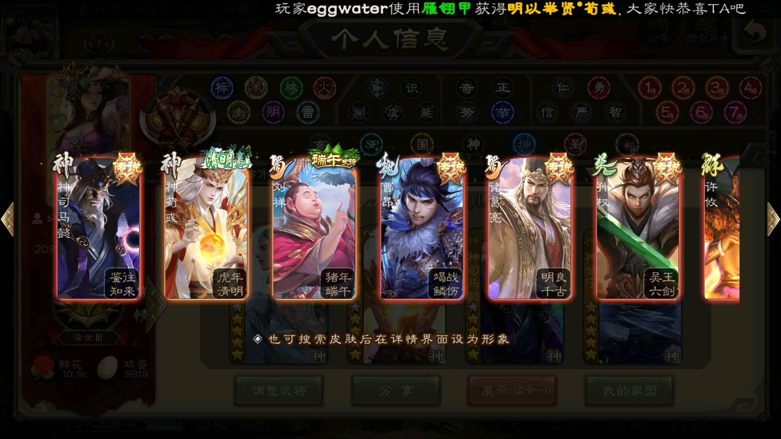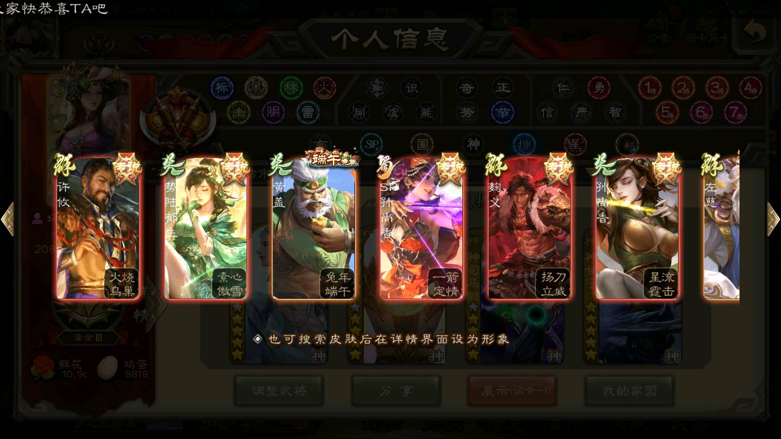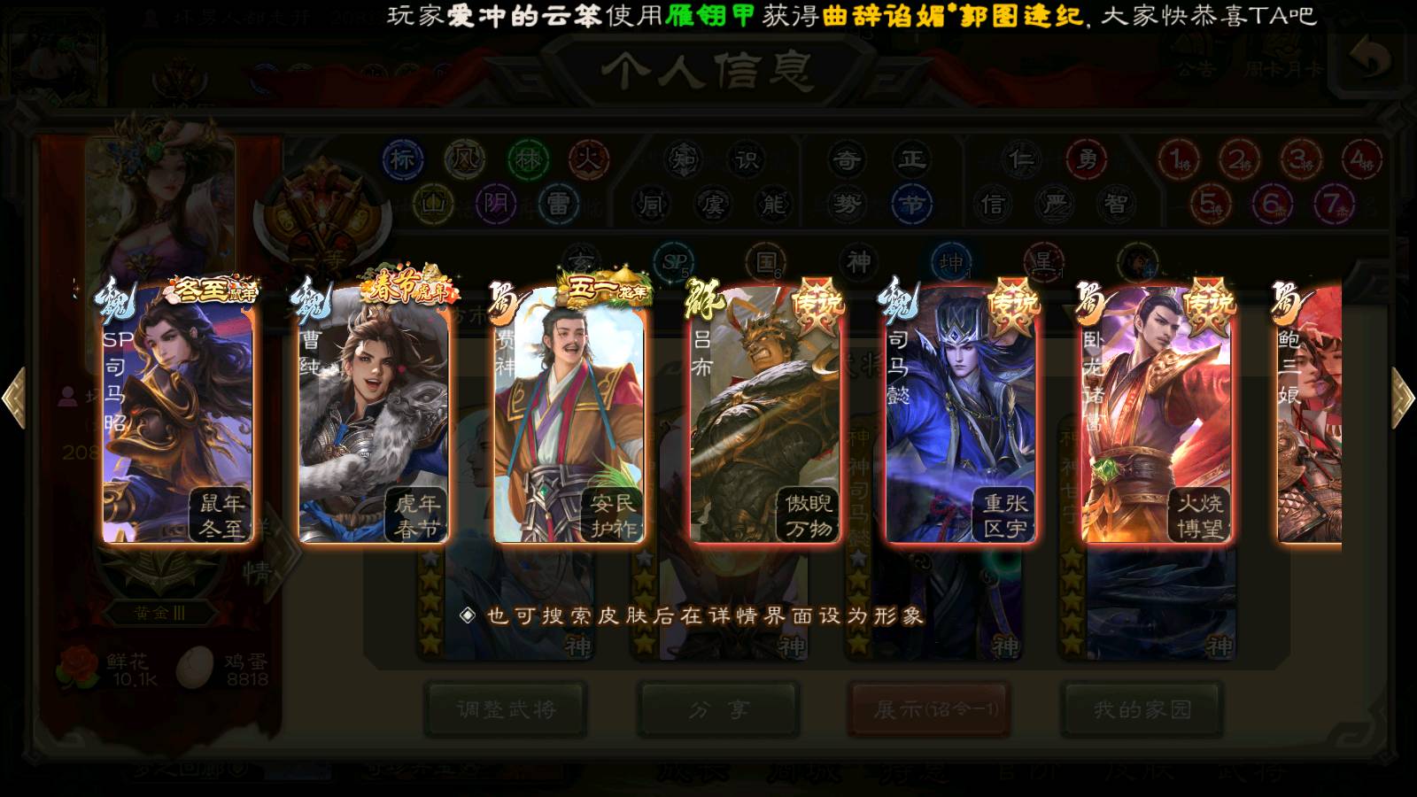 (群雄):刘焉,祢衡,界左慈,界沮授,南华老仙,麴义,许攸,张仲景,司马昭,张让,界李儒,苏飞,星董卓,张琪瑛,谋张角,公孙康,审配,星黄忠,左慈,沮授,兀突骨